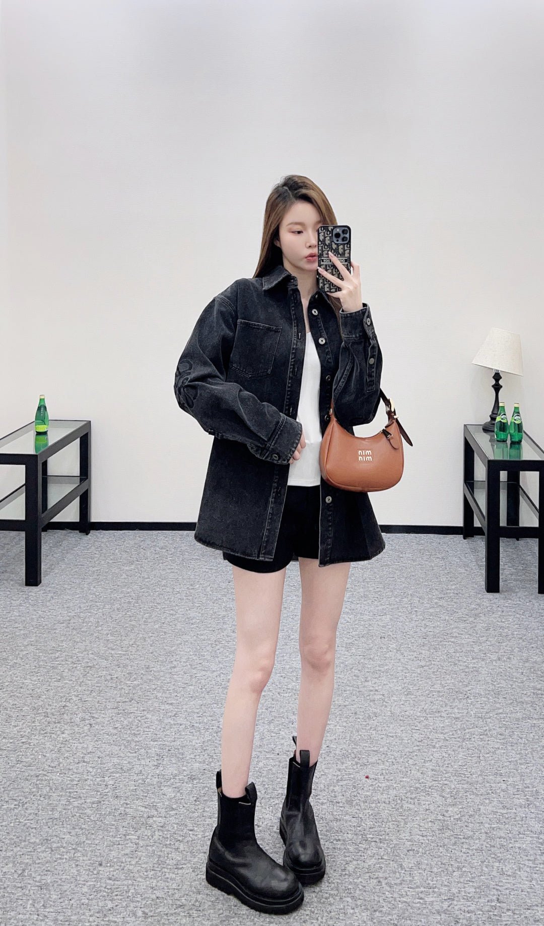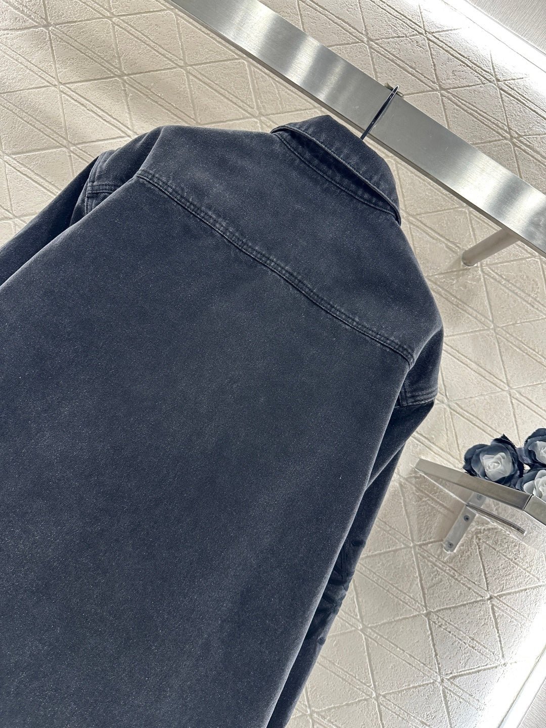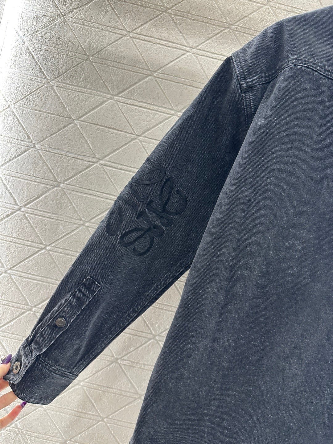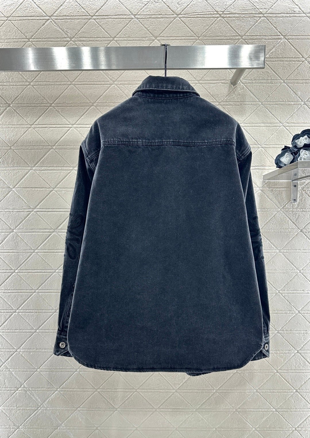 Made from twill cotton denim, this shirt is comfortable, soft, breathable, and easy to wear. The washed, distressed charcoal black and blue color scheme creates a vintage look. The oversized denim shirt silhouette features a single pocket and dropped shoulders for a relaxed fit. A subtle logo on the outer elbow subtly highlights the brand’s style. Simple yet sophisticated, it presents a casual and free-spirited style, exuding effortless chic and a relaxed vibe.