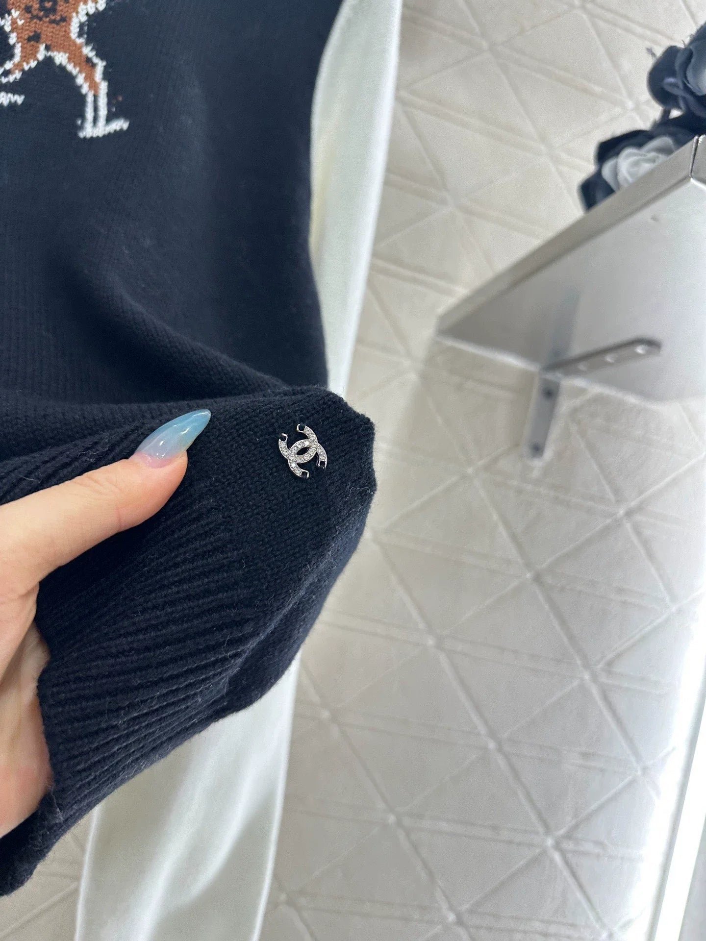 Made of wool yarn material, it is skin friendly, soft, breathable and comfortable. The regular pullover knitted sweater is cut with a slight elasticity, presenting a slimming visual effect. The black and white color combination is used to create a shoulder insertion effect, and the chest color is interlaced to create a double C pattern of sika deer and letters, which echoes the brand positioning with the rhinestone hem. The youthful and beautiful atmosphere is doubled, highlighting the fashionable style. It is fashionable and eye-catching when worn alone or on the inside