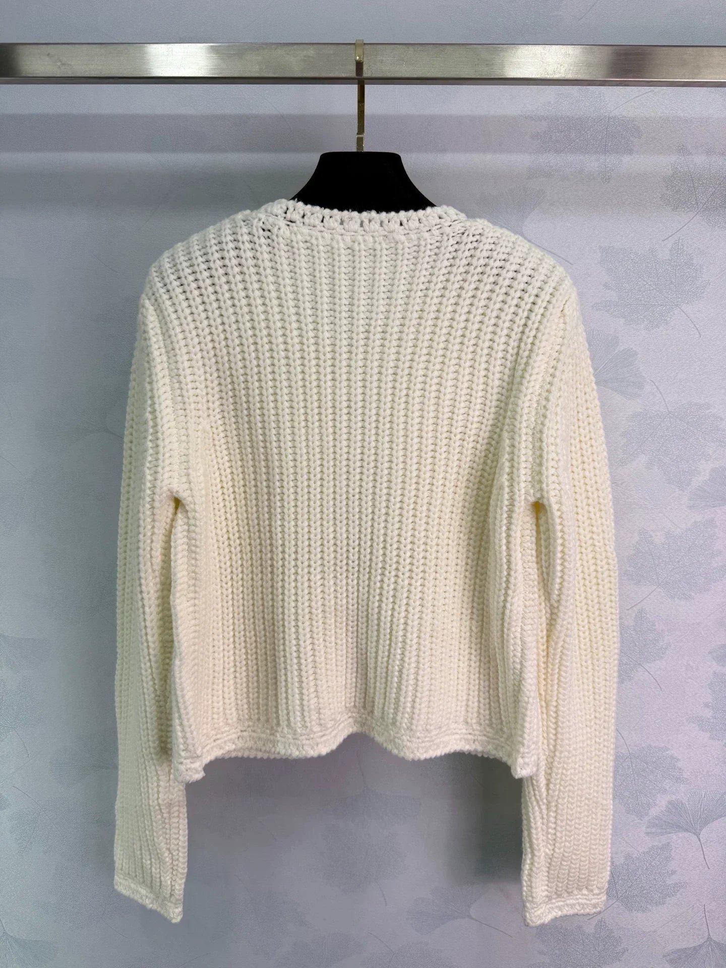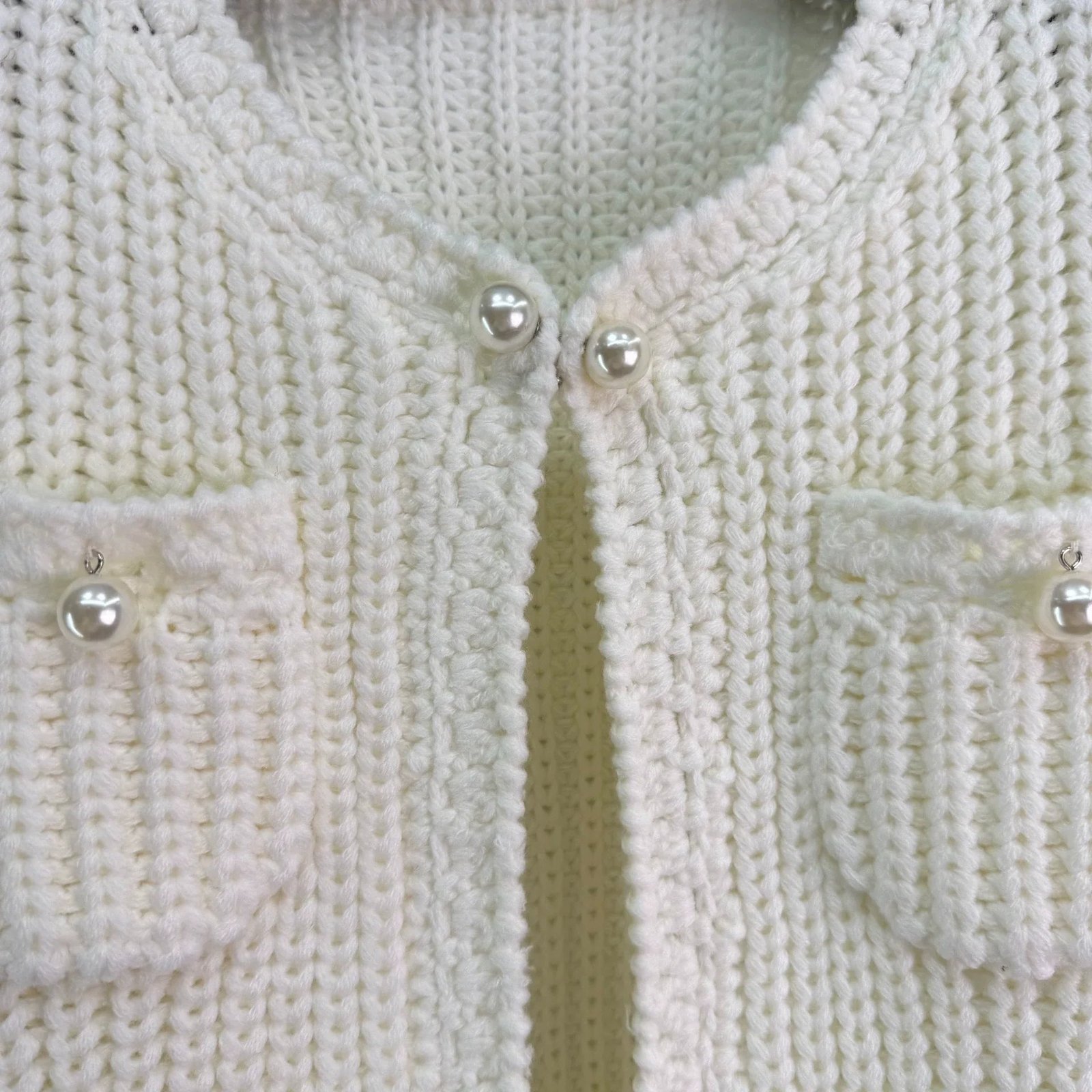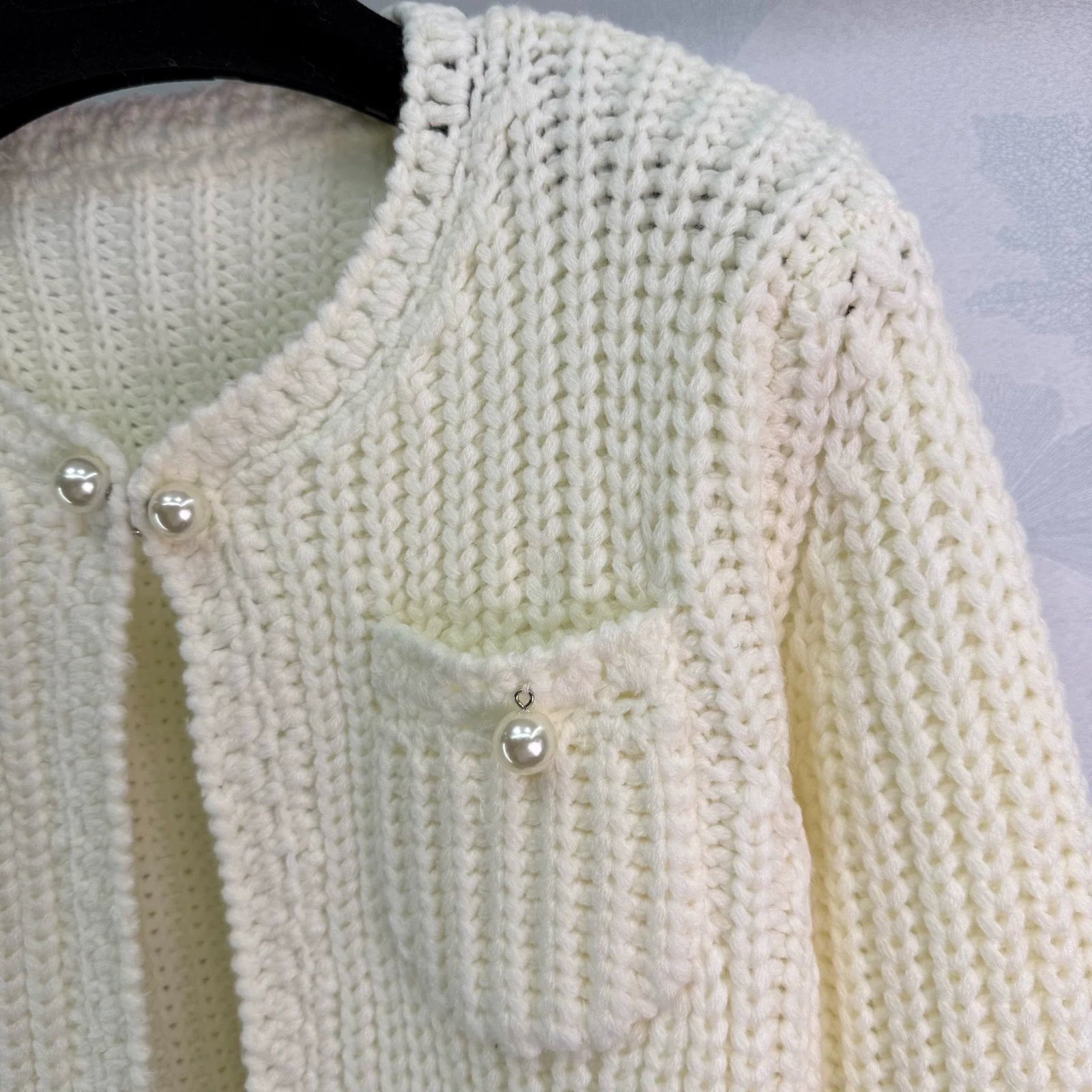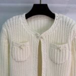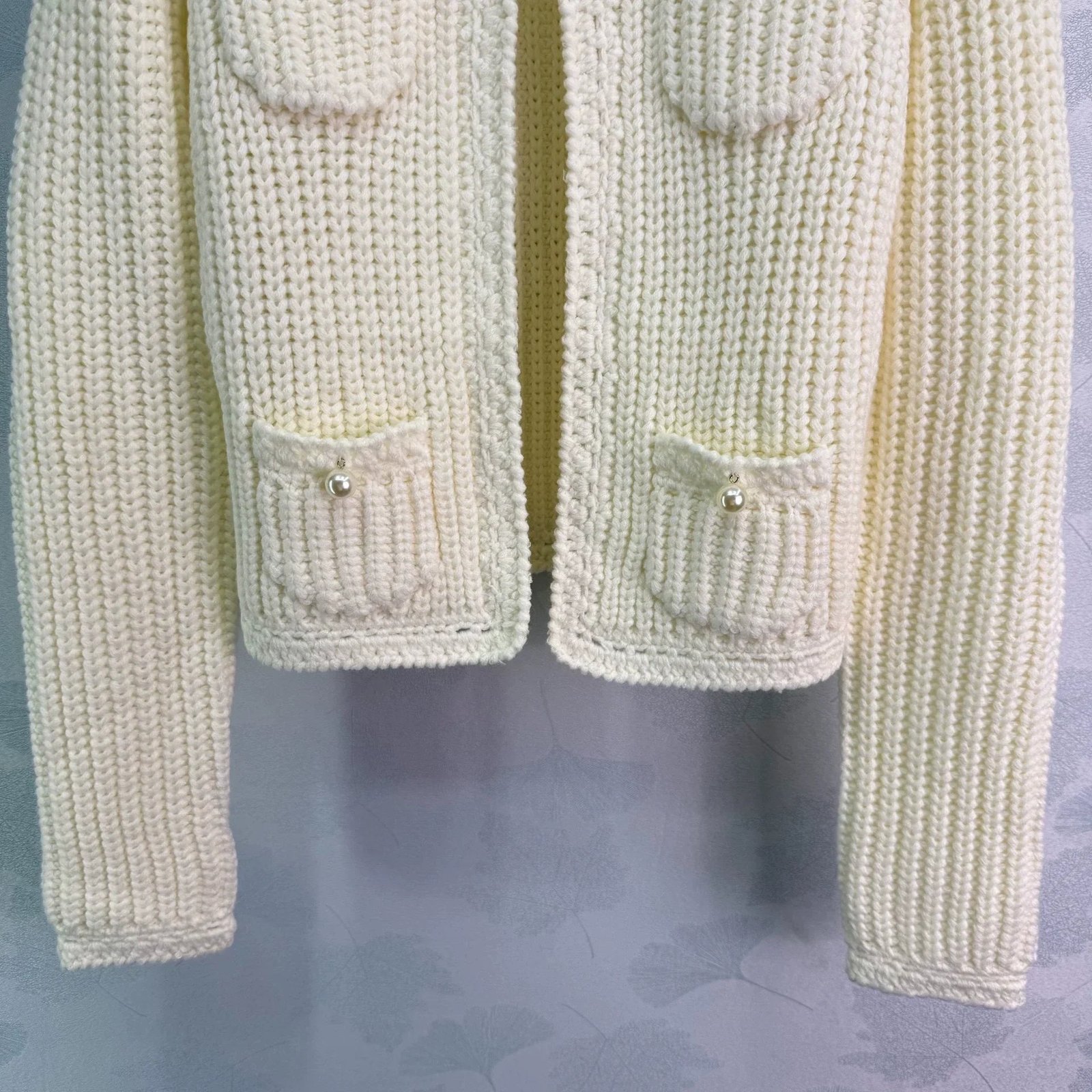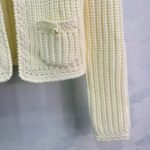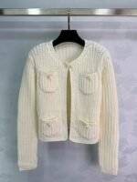 The woven texture of wool yarn is obvious, with a soft round neck cardigan jacket. The design of the front shoulder fits the human body more clearly, and the slender and upright front placket is open. It is matched with divine tools to adapt to various dressing schemes. The symmetrical pocket design on the chest is illuminated by pearl round buckles on the upper edge, highlighting the details of a socialite style. It perfectly interprets elegance and is suitable for different occasions!