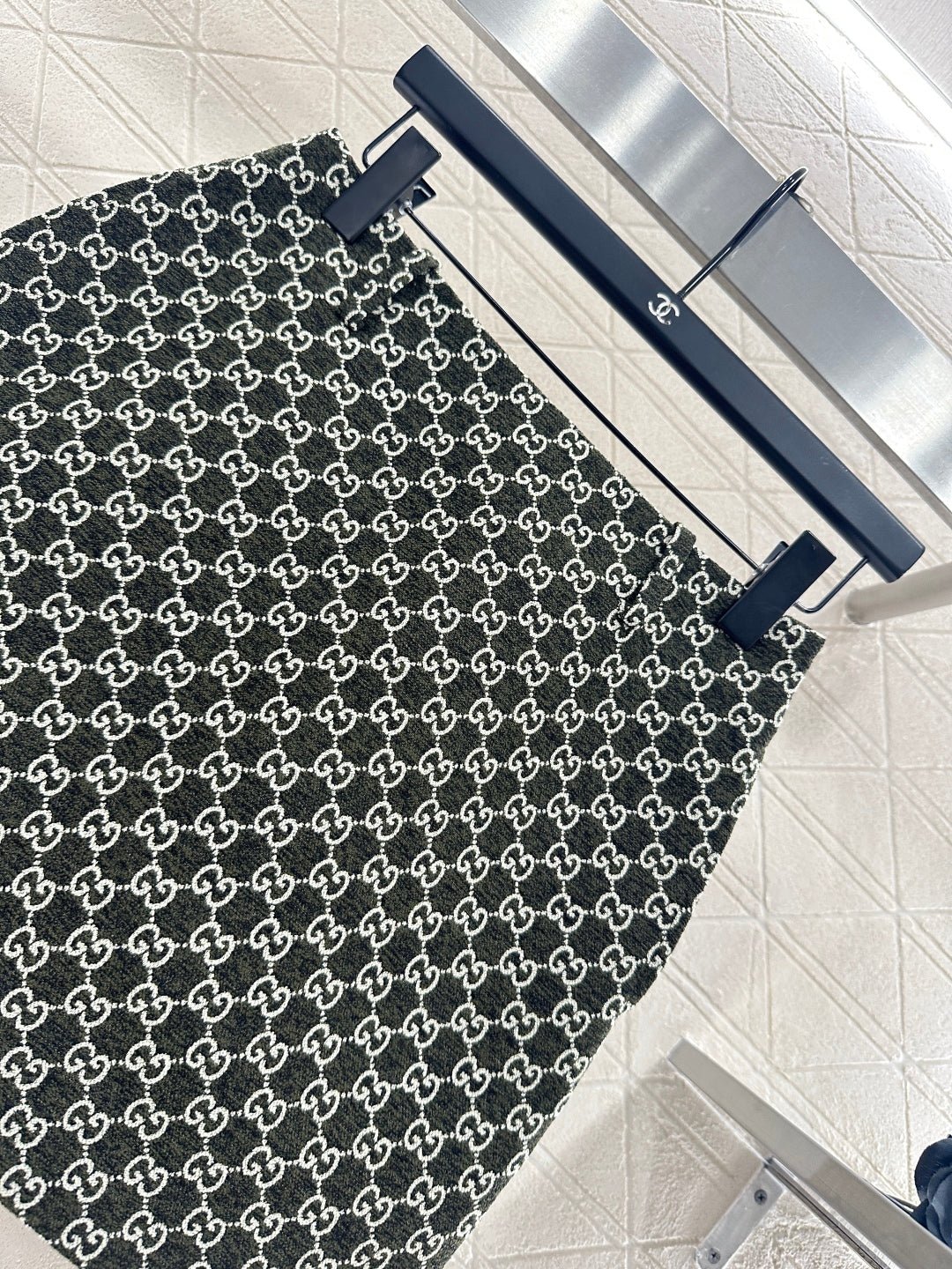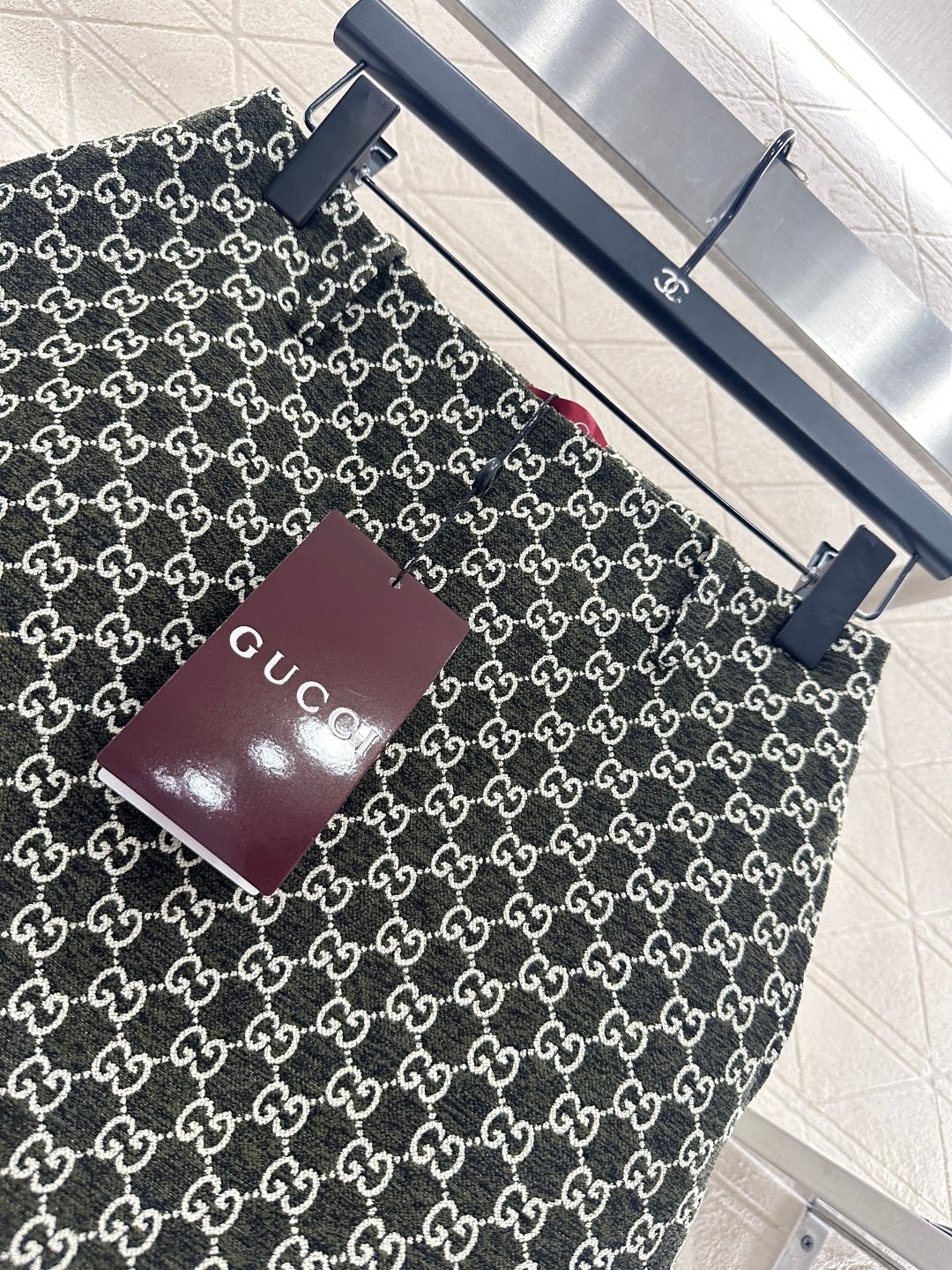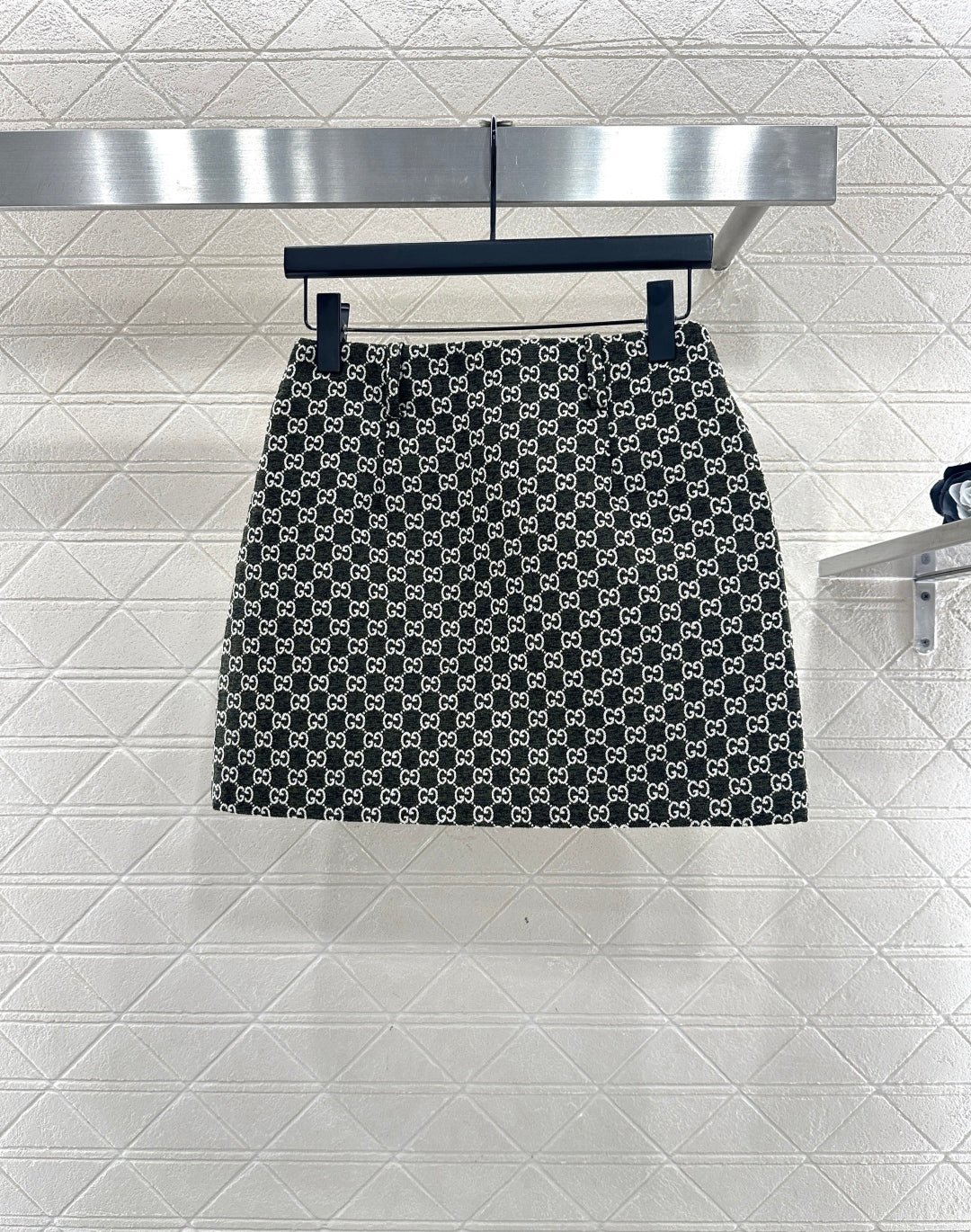 Made of wool jacquard material, the finished garment has excellent texture and appearance. The collar and shoulder suit short skirt set is tailored with a button open design and three-dimensional cutting to create a fashionable and neat style. The collar and front placket are single row engraved with letters and double G round buttons, and the large white green color scheme adds a sweet and elegant atmosphere. The details highlight the brand style. The flip pockets on both sides are matched with the same series of straight tube short skirts, and the details echo the must-have for autumn and winter. It looks tall and slim, versatile and can hold different occasions with a strong aura