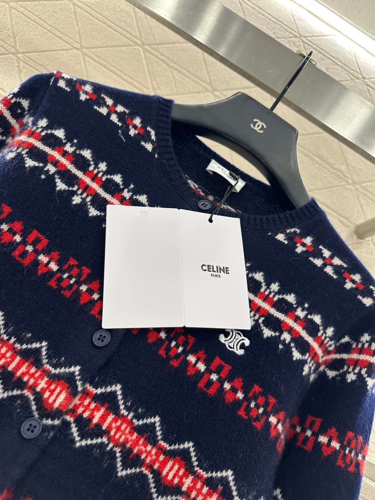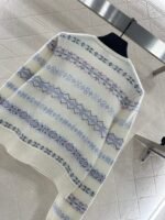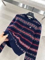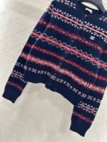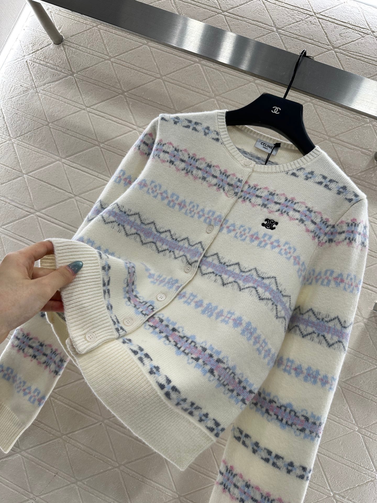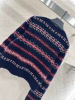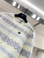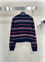 Wool knitted material, soft and delicate, comfortable texture, round neck cardigan cut, threaded edging and elastic wrapping throughout for warmth, single-sided chest Triumphal Arch iconic logo decoration, showcasing brand tone, non repeating irregular geometric patterns horizontally arranged throughout, striped contrasting color combination into snowflake winter design, enriching visual effects, increasing artistic sense, showing a simple and high-end style, full of western-style.