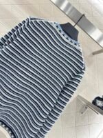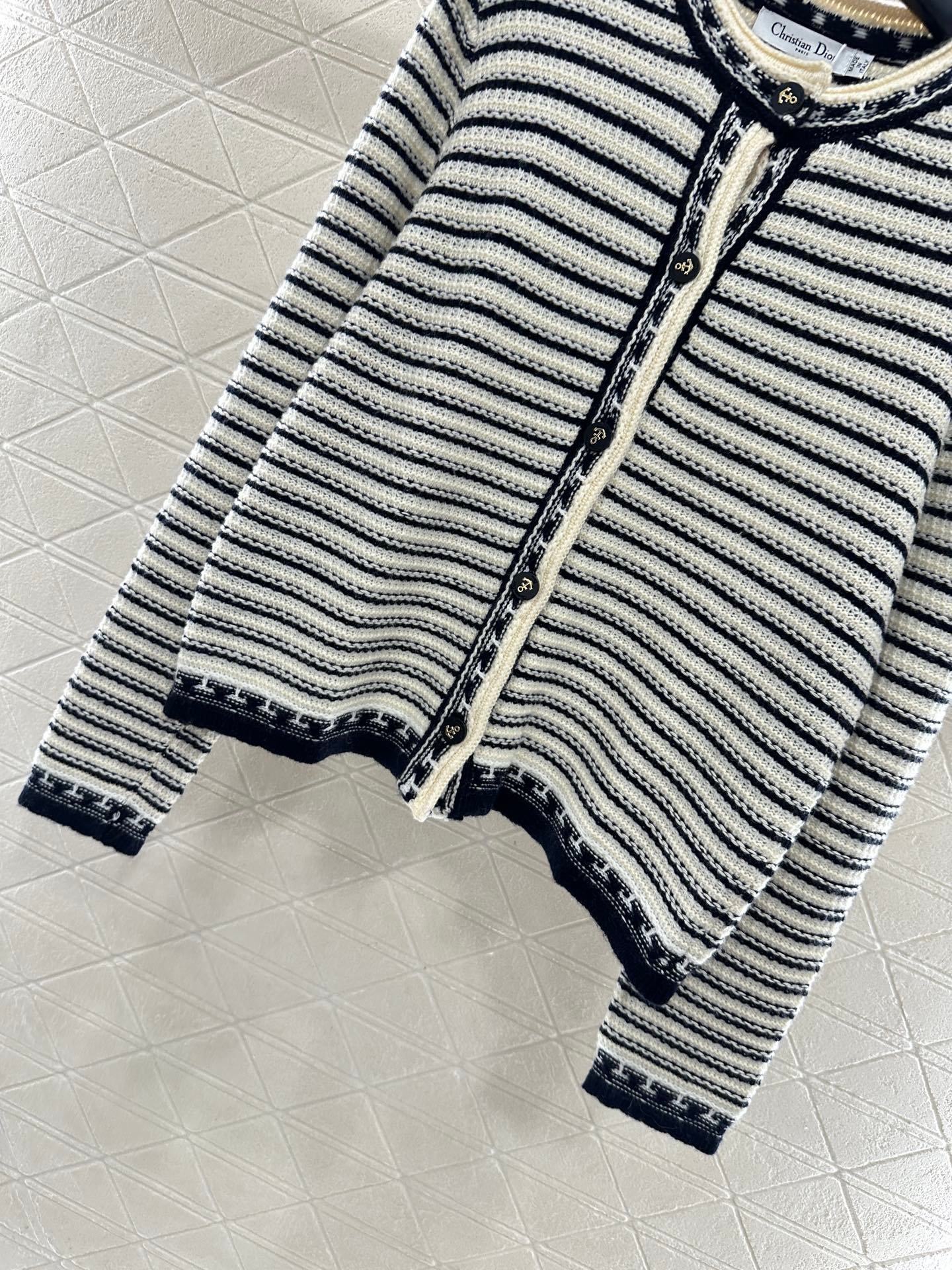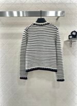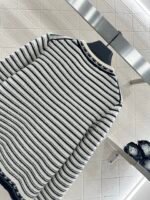 Wool knit material, soft and delicate, comfortable texture, round neck cardigan cut, collar edge extending to the front stripe collision, color collision creates a layered effect, iconic anchor ⚓ Round buckle decoration on the front, showcasing the brand’s tone, with a two-color horizontal stripe contrasting design throughout the body. The wide stripe edging on the hem and cuffs enriches the visual effect and adds a sense of art. The elastic fabric fits the body shape, making the upper body look simple and high-end, full of sophistication.