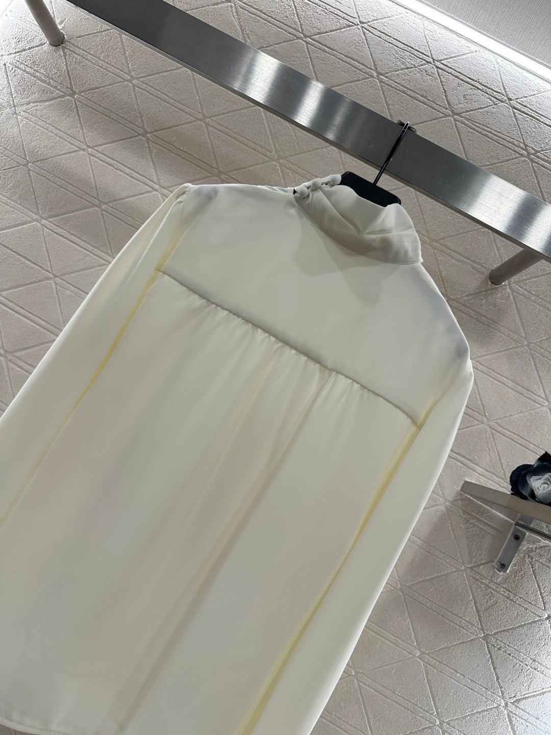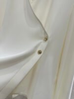 Made from a twill fabric with a rich sheen, this smooth and comfortable shirt features a sophisticated halter neck design. The relaxed, straight silhouette, solid color, and structured shoulders, combined with a flared front placket, effortlessly exude a stylish and sophisticated vibe.