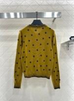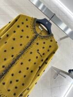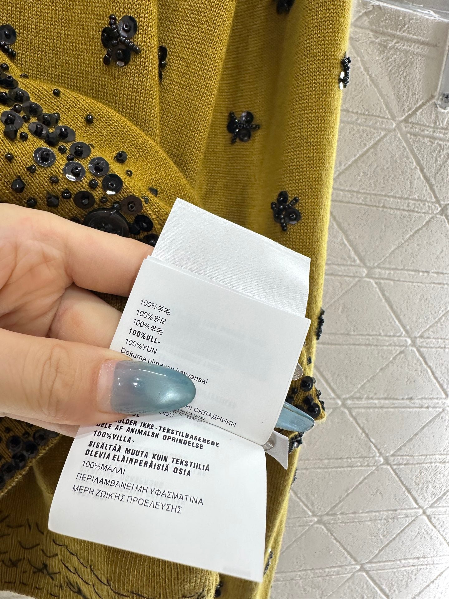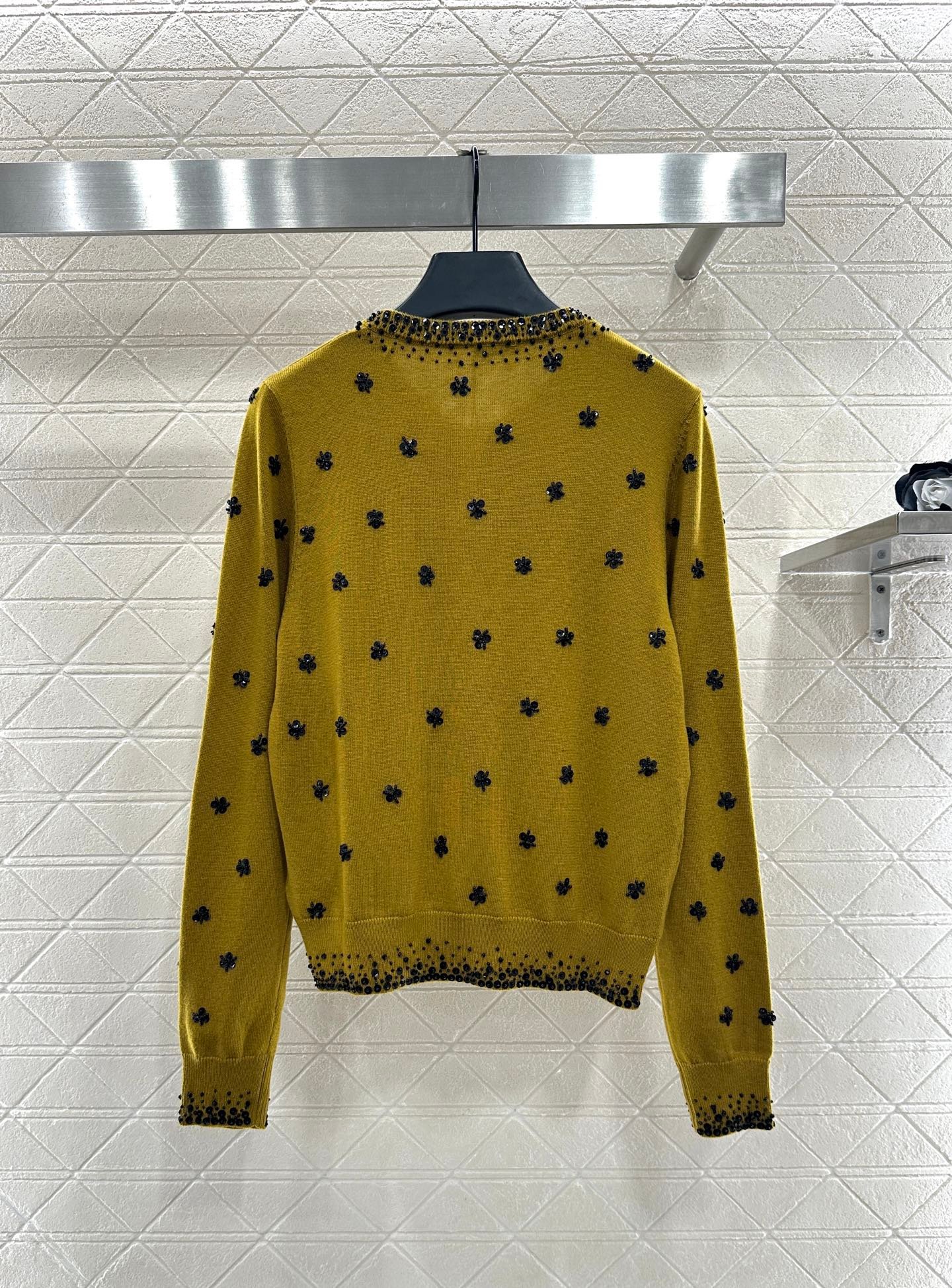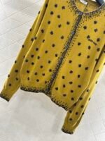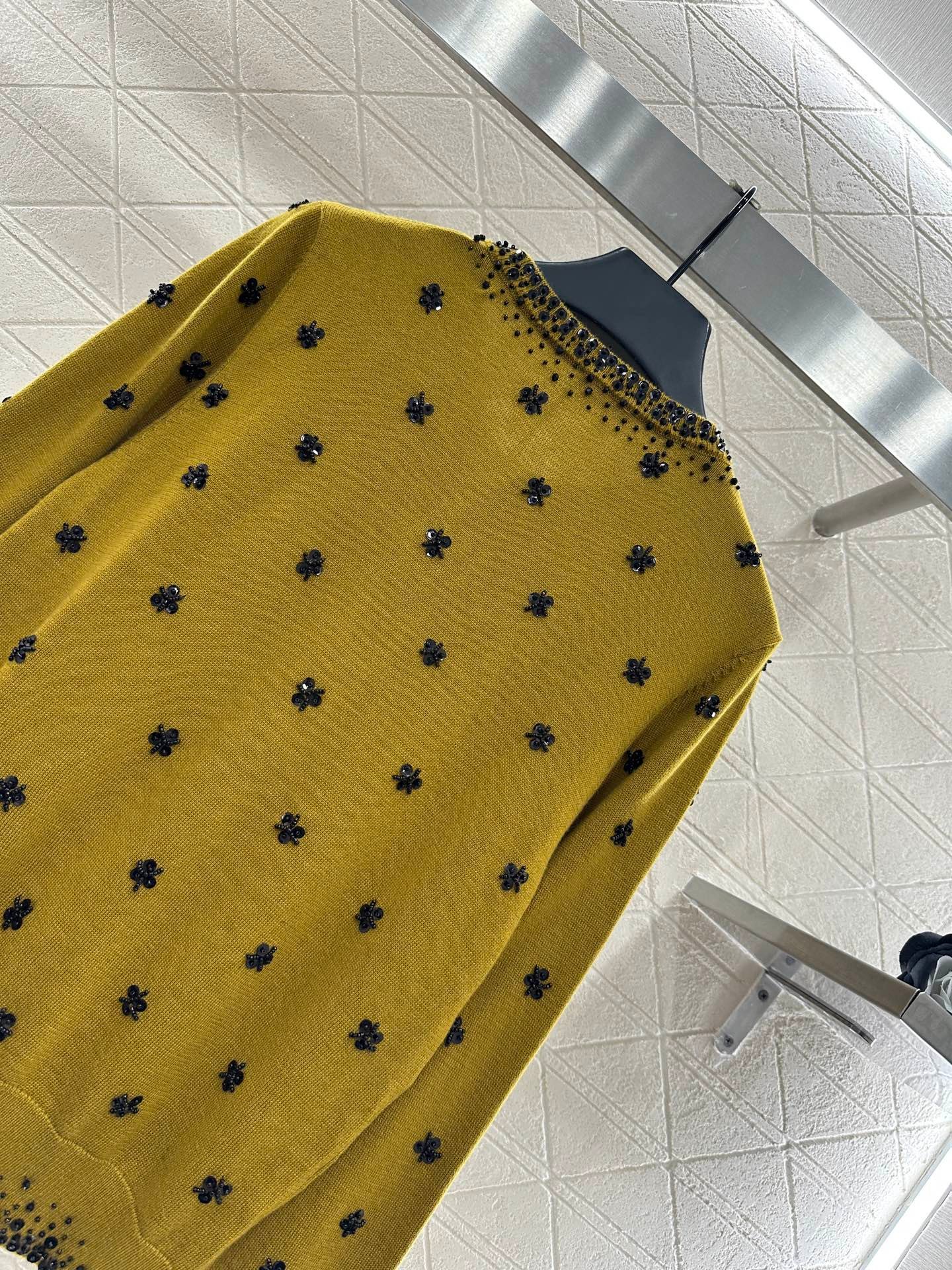 Woolen yarn weaving, density fine needle weaving, clear woolen texture, comfortable and skin friendly, round neck shoulder button cardigan cut, chest letter logo highlighting tone, collar extending to the front hem and cuffs, with dense nail beads outlining the edges. Multiple materials of sequin nail beads are distributed on both sides of the body, combined into flower patterns, reflecting gorgeous light and creating a luxurious and relaxed feeling. The leader’s hem has threaded edges, full of elasticity, and rich color design layers. The pattern is inclusive of the body and fashionable for wearing to reduce age.