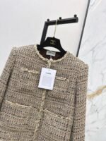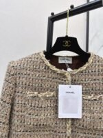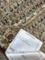 Made from a heavyweight custom-made tweed fabric, woven from multiple yarns, with chain trim, this piece is meticulously crafted and has a substantial feel. It exudes elegance and sophistication, simple yet sophisticated, flattering and slimming, combining femininity with a sharp, clean look.