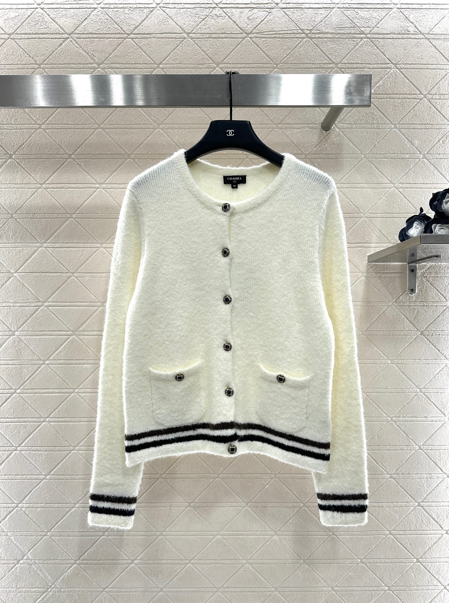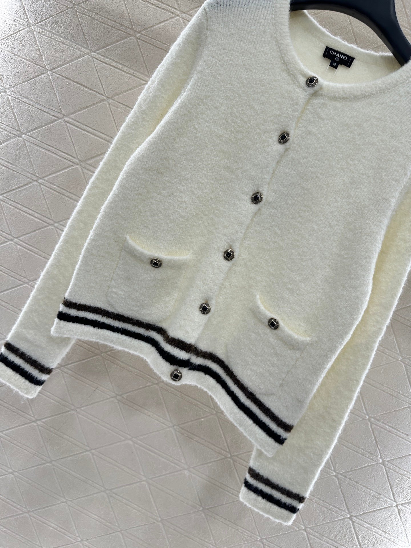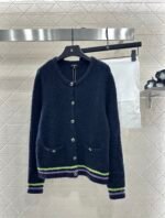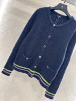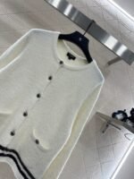 25 Coco Skiing 🎿 Series # Cashmere yarn weaving, density fine needle weaving, clear woolen texture, soft and sticky texture, comfortable and skin friendly, round neck button shoulder cardigan cut, three-dimensional rounded edging, large front placket round button contrasting diamond grid ➕ Diamond details embellish the design, reflecting reflective light and creating a luxurious and relaxed look. Paired with the contrasting stripes at the hem and cuffs, it enriches the layering of the design. The silhouette is inclusive of the body, making it fashionable and age reducing