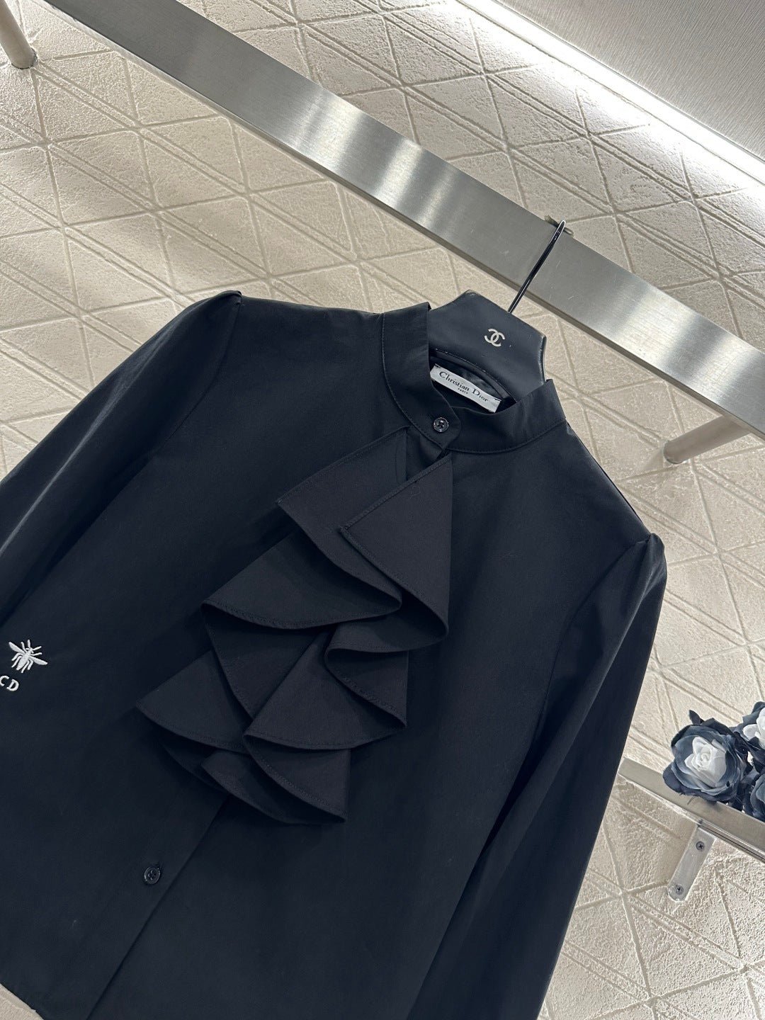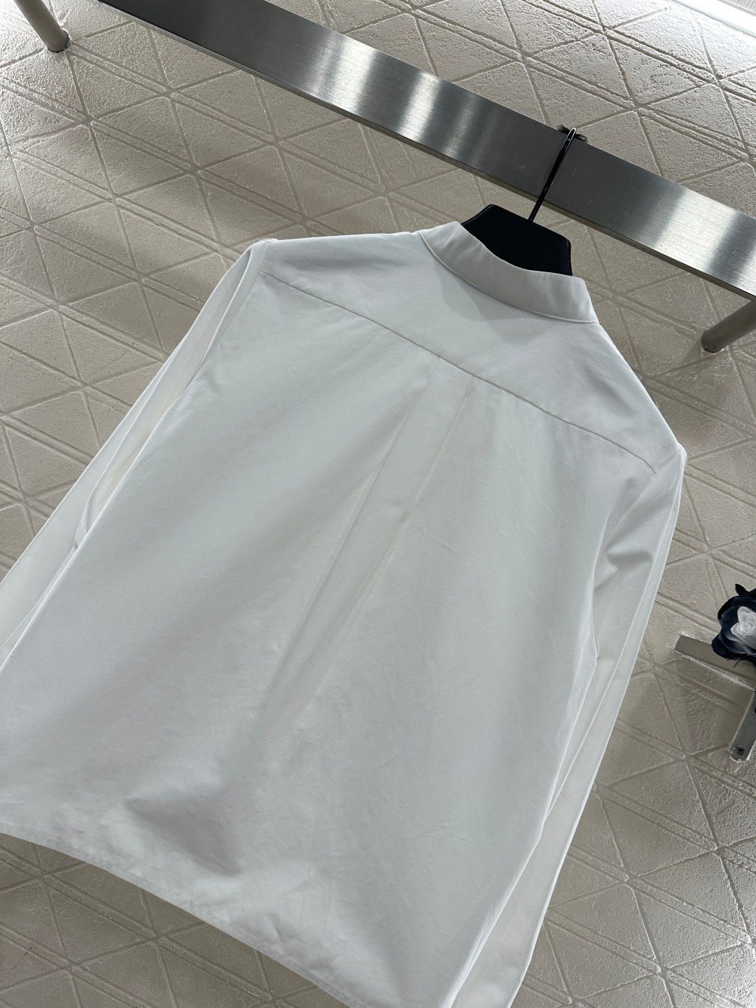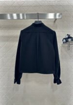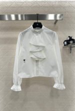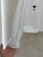 Made of 100% cotton, this shirt boasts a delicate texture, is comfortable and breathable, and features a lace trim. The simple, solid color design is versatile and suits all ages. The stand-up collar is adorned with a triangular, flared, stacked cake collar that echoes the design on the cuffs, exuding elegance. The bee embroidery adds a touch of sophistication, making it suitable for both everyday wear and commuting.