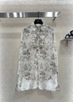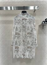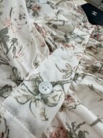 Made of all cotton material, with a glossy texture and comfortable breathability, this long sleeved shirt has a short front and long back hem, with a neat and loose silhouette cut. The classic plain color base of the large body is embellished with orange green floral patterns, making it versatile and not picky about atmosphere and age. The small standing collar edge is half open, and the front is decorated with symmetrical stacked egg cake fungus lace collar edge. Paired with the same series of high waisted pleated mid length skirts, it can be freely displayed to create an elegant temperament. It is suitable for wearing as a set, with a youthful and vibrant spring atmosphere. It can be worn as an interior in autumn and winter, and can be worn alone in spring and summer