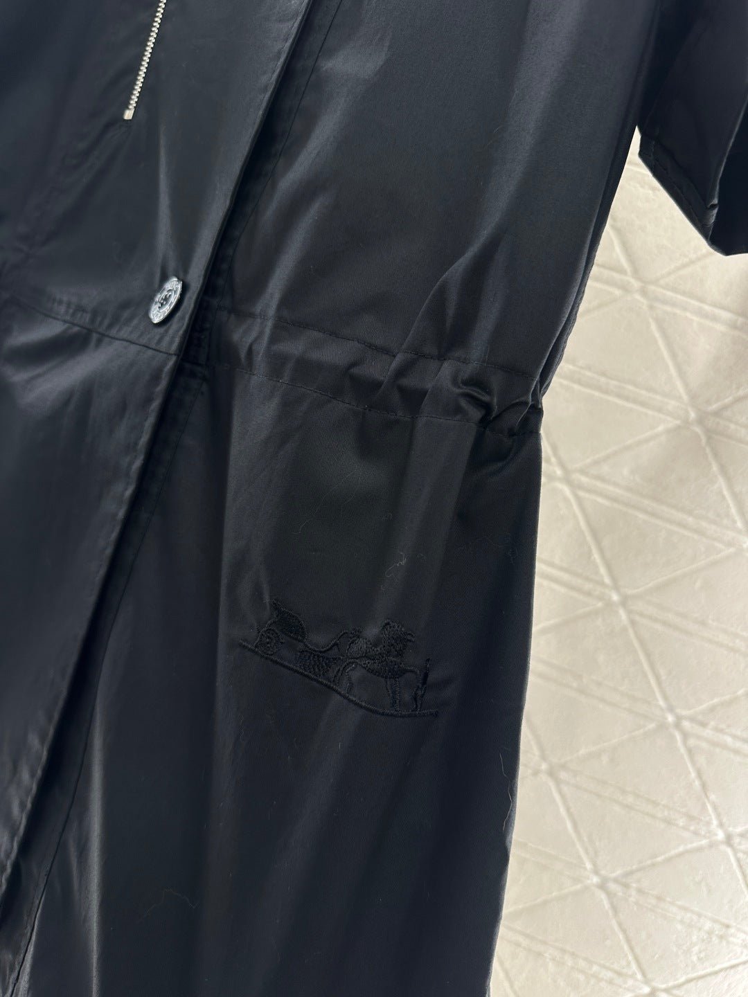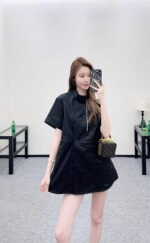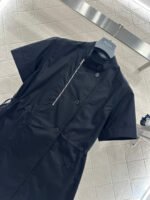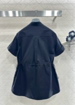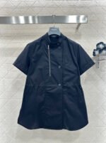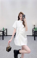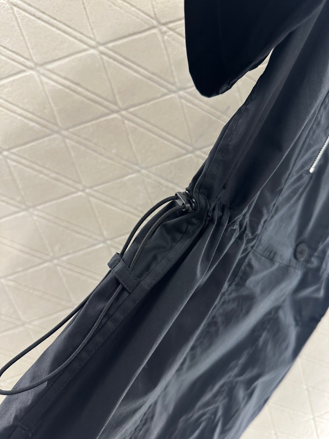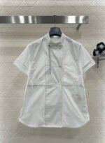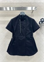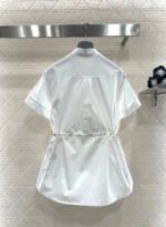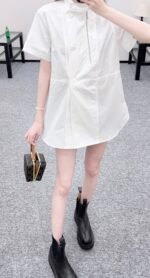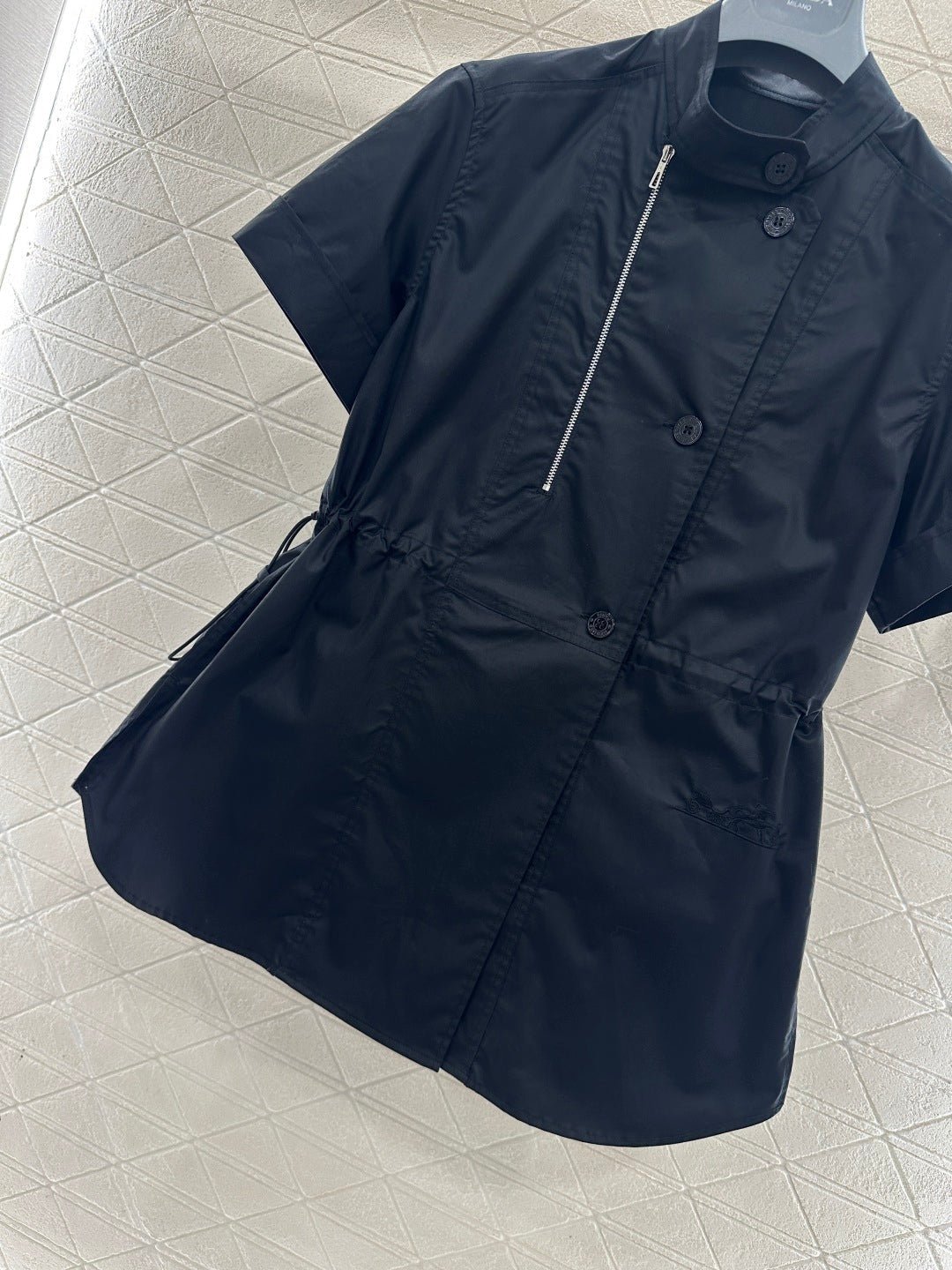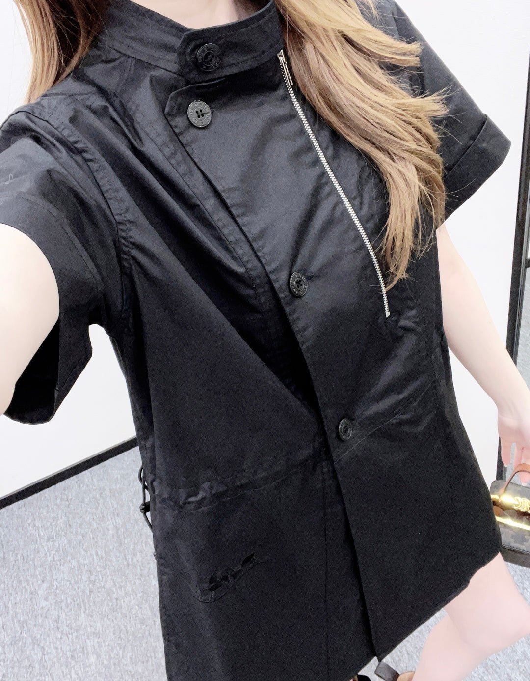 Made of twill cotton, this shirt dress boasts a delicate texture and comfortable fit. Featuring a stand-up collar and short sleeves, the clean lines of the stand-up collar are complemented by a side zipper detail. A drawstring waist accentuates the figure. The white version offers a simple and refreshing look with a cool and sophisticated vibe, while the black version exudes a cool and modern style. Whether worn alone or as a layering piece, it creates a sophisticated and minimalist fashion statement. This deconstructed piece can be styled as a dress, jacket, or top, offering a chic and sophisticated look.