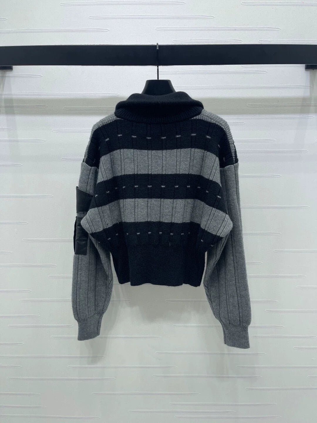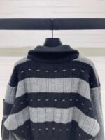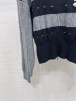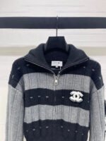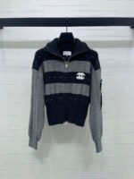 Wool yarn weaving texture high-end stand up collar cardigan short version with a full body striped texture and grooves that make it look slim without losing its fashion sense. The collar cuffs and hem are elastic and threaded, and the edging is more in line with the sleeve elbow splicing PU leather ➕ Adorned with a double C-letter logo on the chest, showcasing a playful and youthful brand tone. The classic color scheme is gentle and generous, making it the preferred choice for daily wear