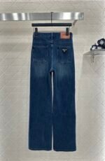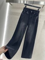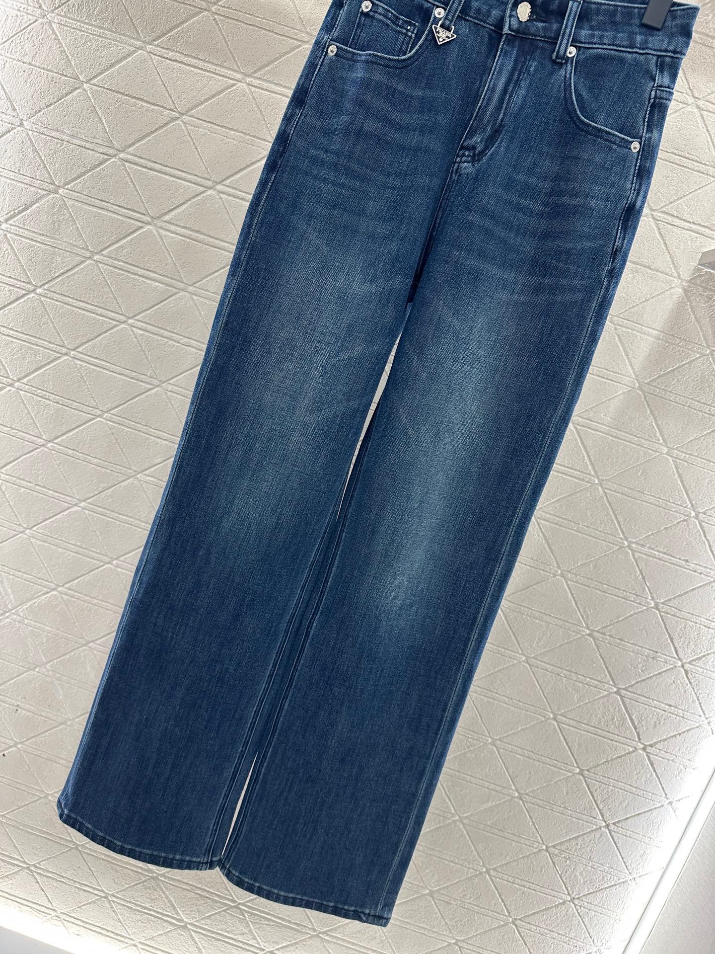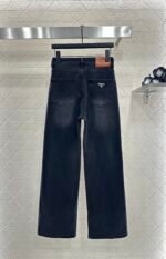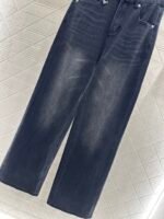 Twill cotton denim material, crisp texture, stylish dressing, straight leg pants version, evenly dyed with enzyme water washing throughout, retro dark blue carbon black color selection ➕ Wear and tear white, versatile and durable, hanging a triangular metal logo pattern at the waist, echoing the leather label at the back waist, highlighting the brand style, three-dimensional cutting, slim and straight pants legs, exquisite details embellishment, fashionable and stylish dressing