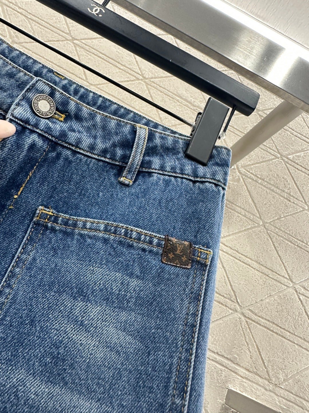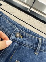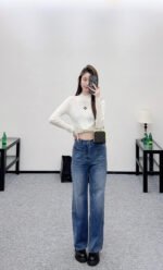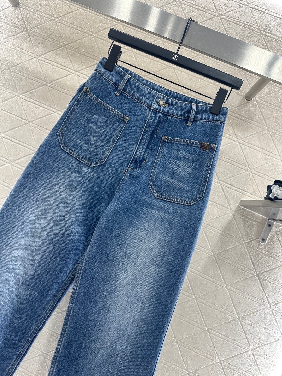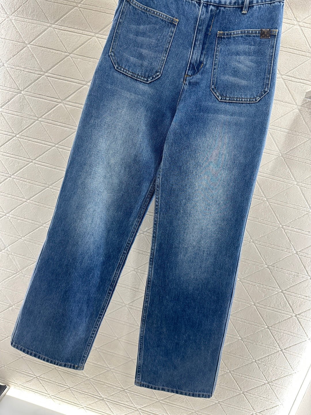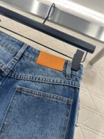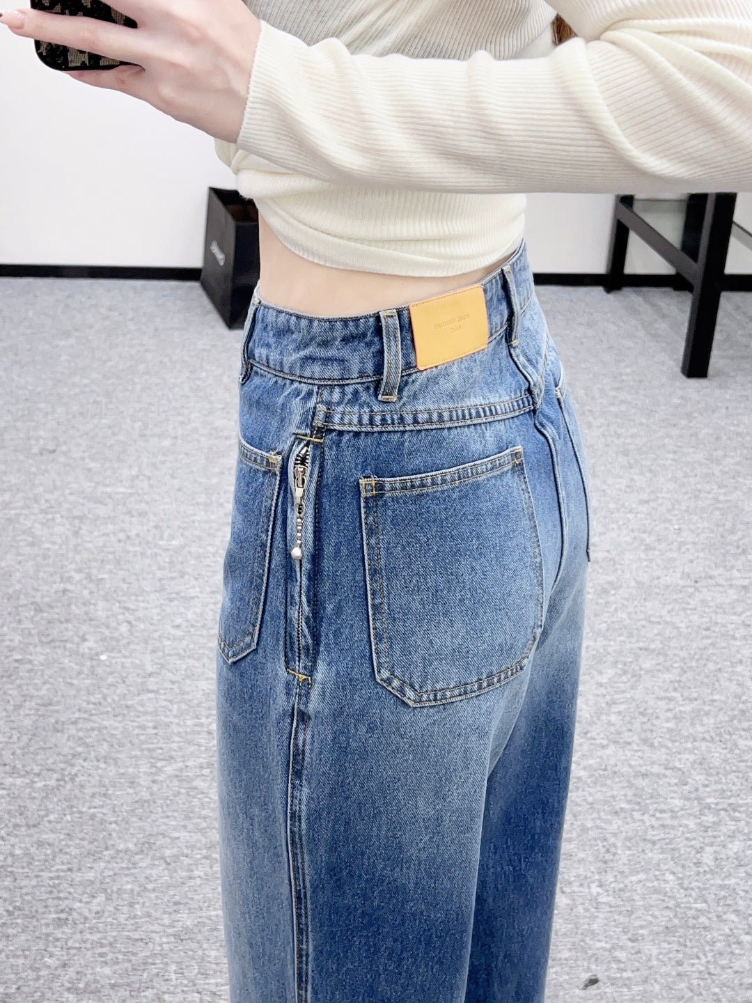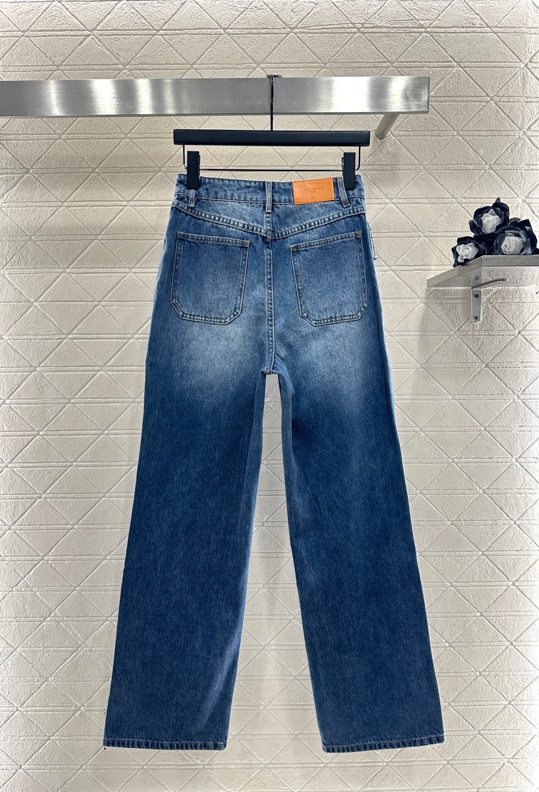 Made from twill cotton denim, these jeans are soft, delicate, and have a premium feel. They maintain a crisp and stylish look with a high-waisted, button-down, straight-leg cut. Symmetrical pockets and a light blue distressed thigh texture create a simple yet retro feel, making them timeless and sophisticated. An embossed leather label at the back waistband and side zipper details add aesthetic appeal to the casual denim, highlighting the brand’s style and creating a fashionable look.