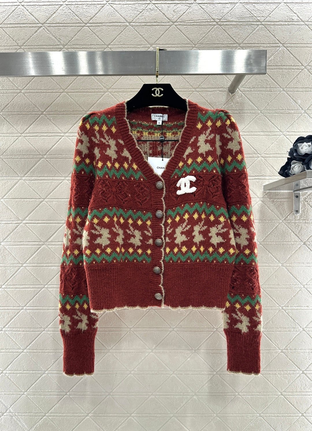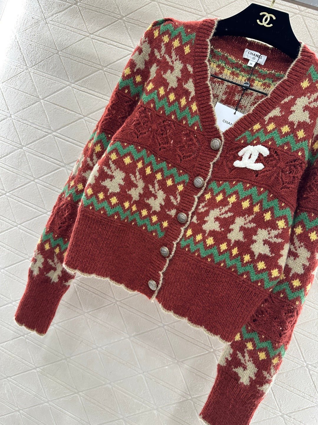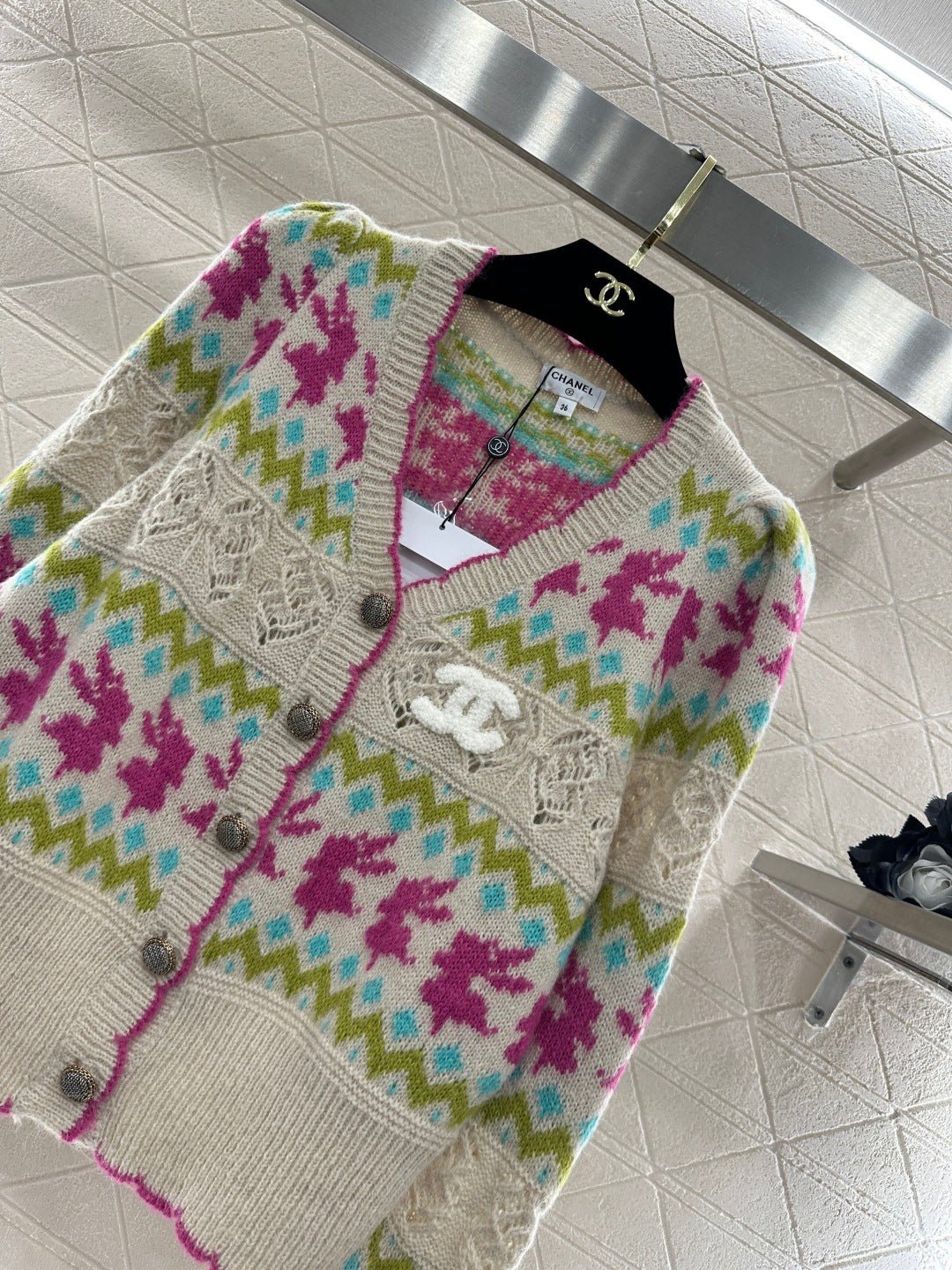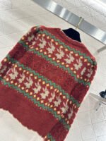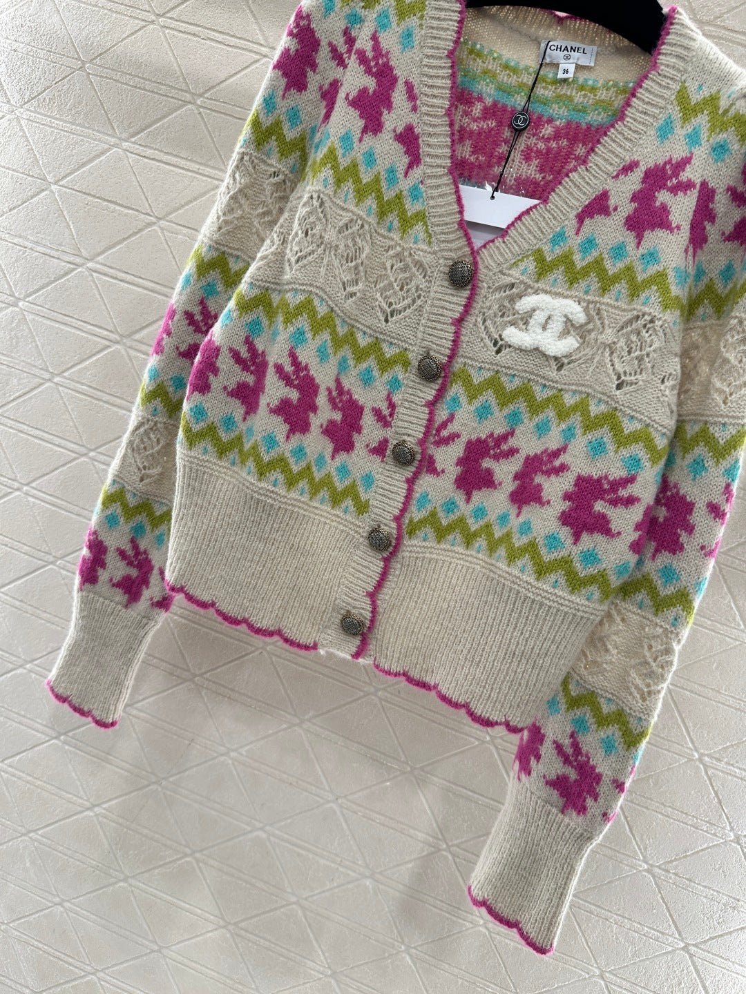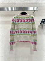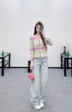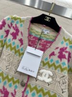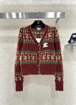 Wool yarn weaving creates a delicate texture and comfortable wear. The round neck cardigan comes in two colors: off-white with a vibrant pink and green jacquard pattern, and caramel brown with a sophisticated and retro diamond pattern. A three-dimensional double C logo adorns the chest, showcasing the brand’s signature style in every detail. The soft, warm wool fabric is gentle on the skin, while the short V-neck elongates the legs and enhances proportions. It looks effortlessly chic on its own, or layered over shirts or T-shirts for a more sophisticated and stylish look. It’s a versatile piece that creates a sophisticated and stylish ensemble.