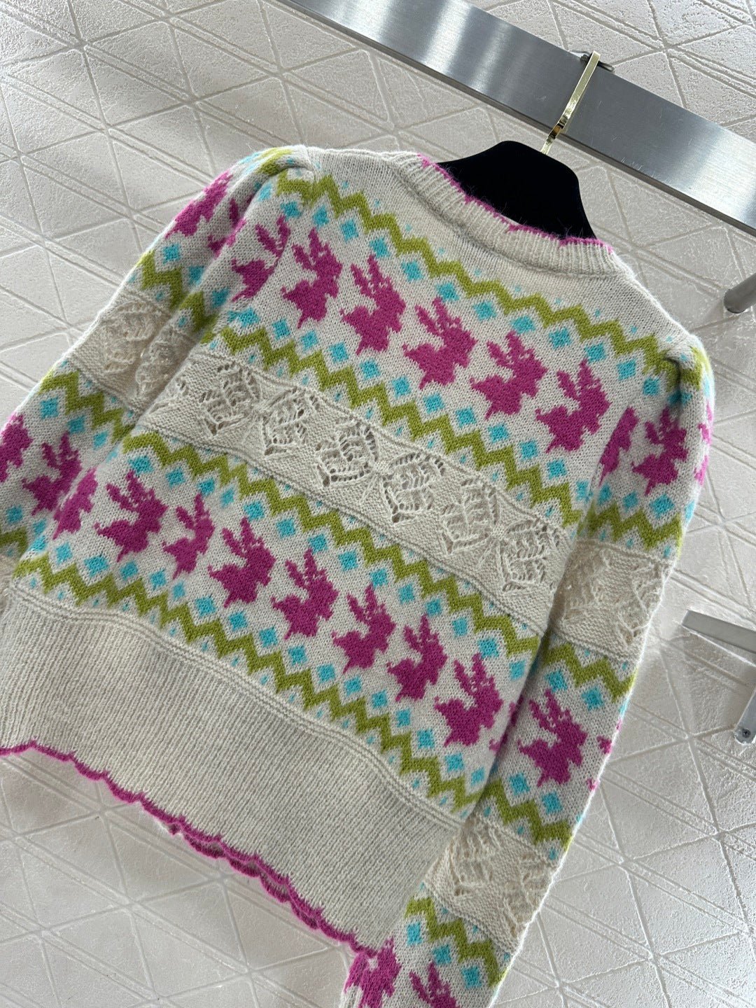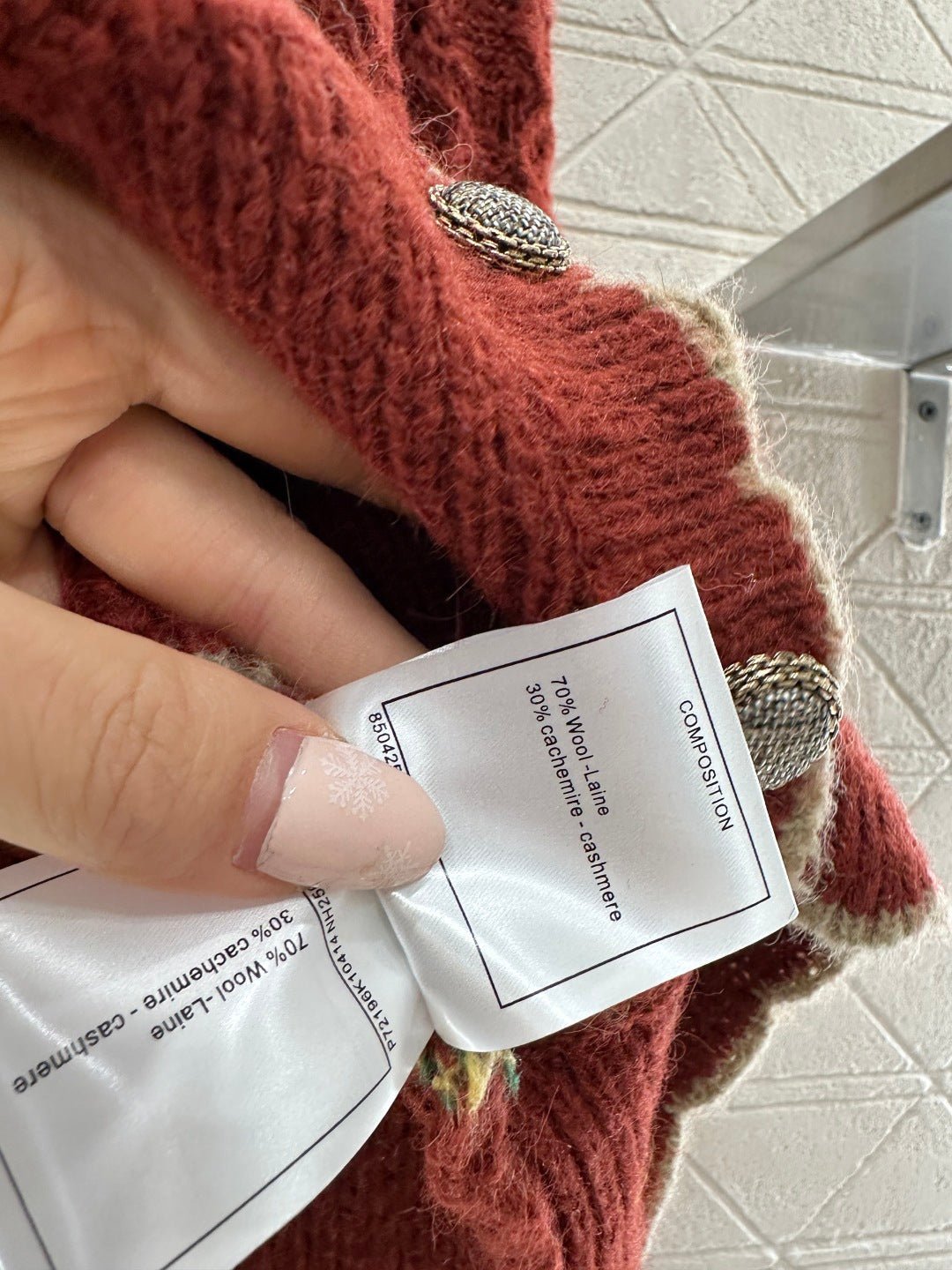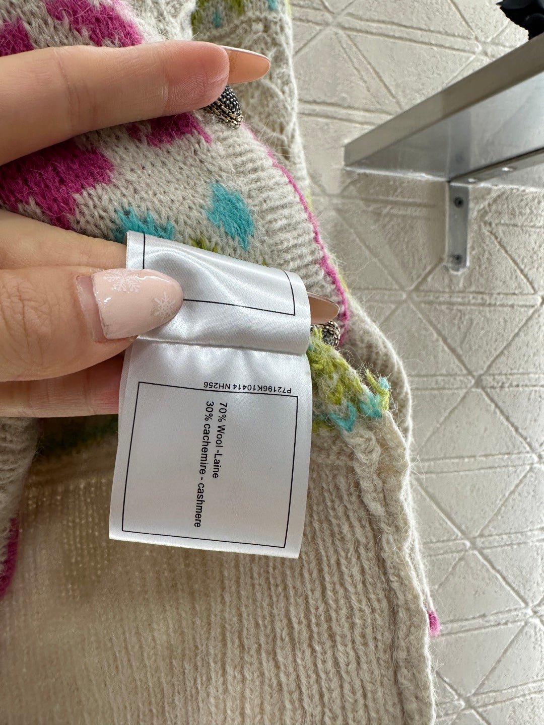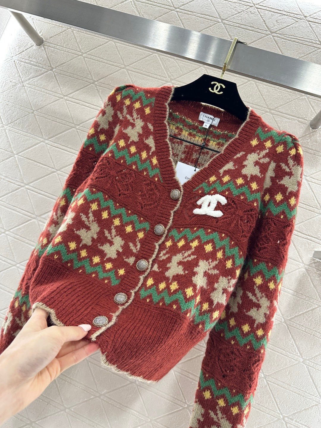 Wool yarn weaving creates a delicate texture and comfortable wear. The round neck cardigan comes in two colors: off-white with a vibrant pink and green jacquard pattern, and caramel brown with a sophisticated and retro diamond pattern. A three-dimensional double C logo adorns the chest, showcasing the brand’s signature style in every detail. The soft, warm wool fabric is gentle on the skin, while the short V-neck elongates the legs and enhances proportions. It looks effortlessly chic on its own, or layered over shirts or T-shirts for a more sophisticated and stylish look. It’s a versatile piece that creates a sophisticated and stylish ensemble.