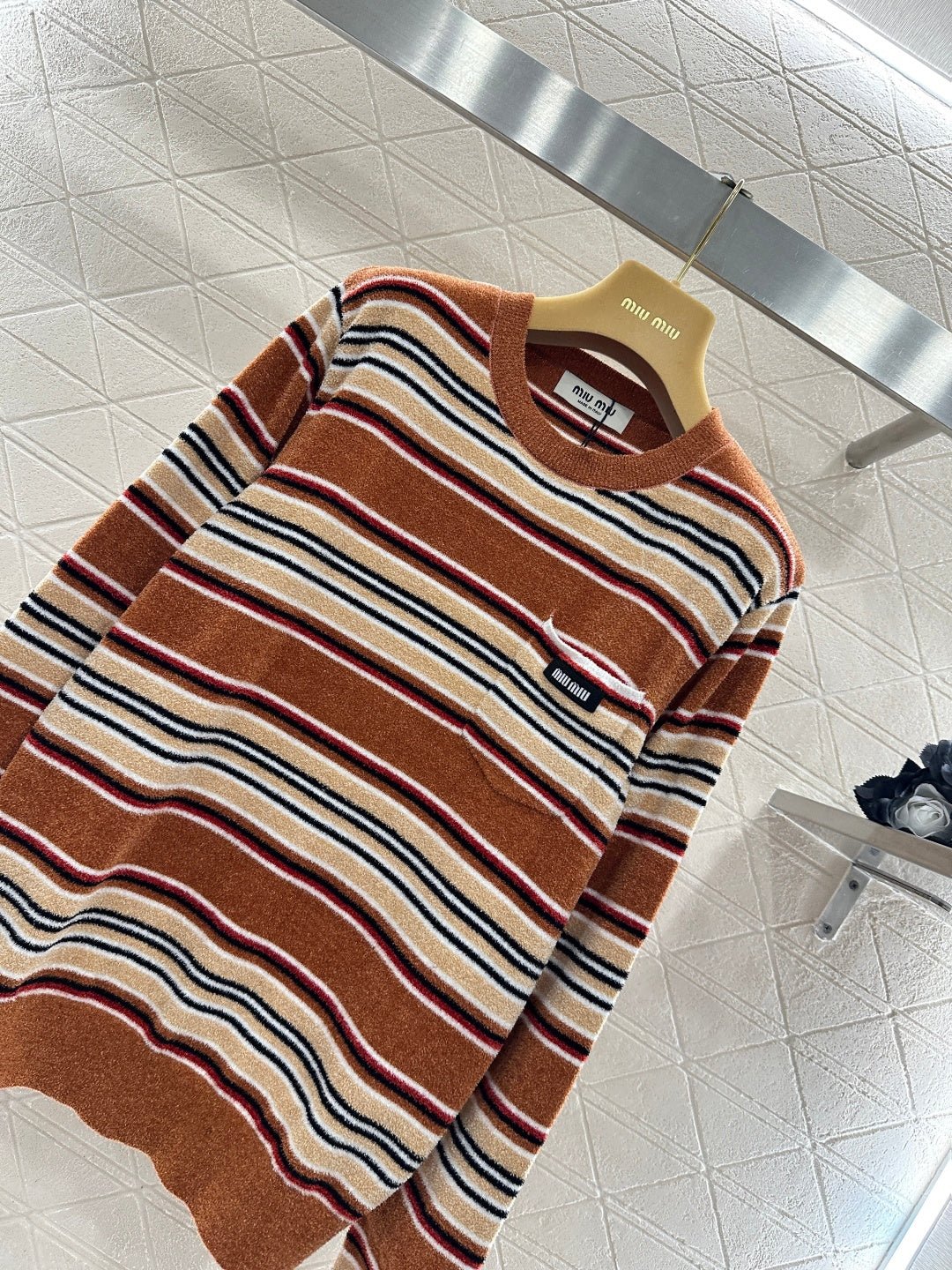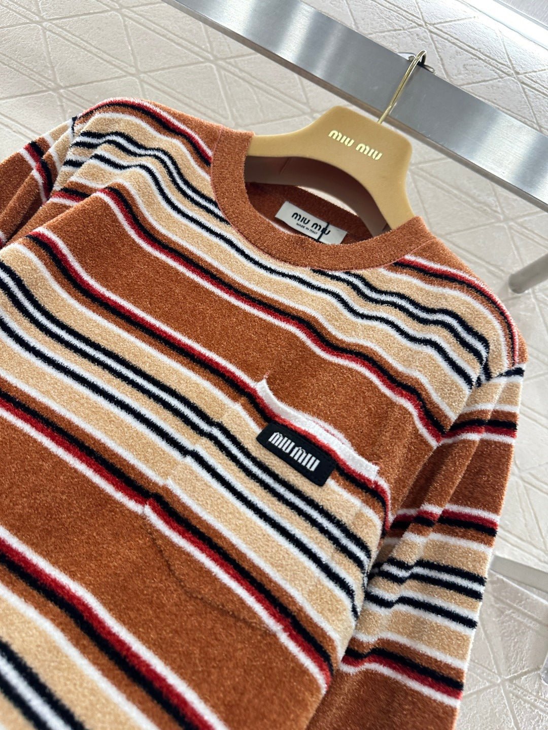 Crafted with imported yarn, this sweater boasts a distinct terry cloth texture, maintaining its premium feel. The round neck, loose-fitting pullover design, and caramel brown stripes exude a warm, retro vibe. The delicate knit texture is soft, elastic, and gentle on the skin. A small chest pocket adorned with an À la Télé label adds a touch of understated luxury. The relaxed round neck flatters all body types. Worn alone, it offers a relaxed, youthful look; layered under a shirt or vest, it unlocks a sophisticated, preppy style – a must-have fashion item for any wardrobe.