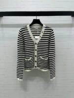 Made with imported yarn, high-quality and comfortable. V-neck knit long-sleeved cardigan with contrasting stripes throughout. Elastic fabric provides a snug fit and a slimming effect. The entire garment is trimmed with matching off-white openwork details. Embroidered logo pattern on the front. A relaxed and stylish look with a touch of understated luxury.
