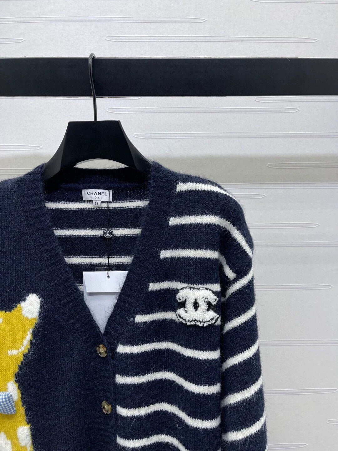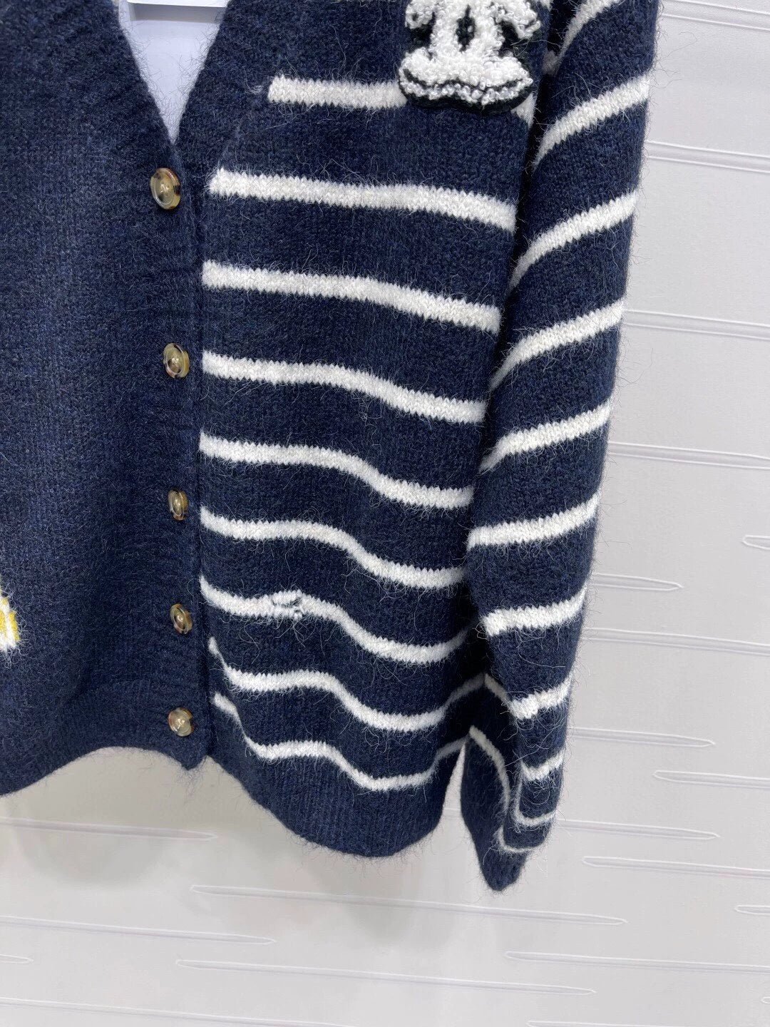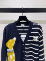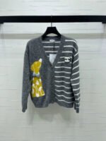 High quality texture, soft and skin friendly, loose V-neck cardigan cut, large body dog pattern ➕ Contrast stripes, slimming without losing fashion sense. Adorned with letter logos on the chest, showcasing a playful and youthful brand tone, relaxed and lazy