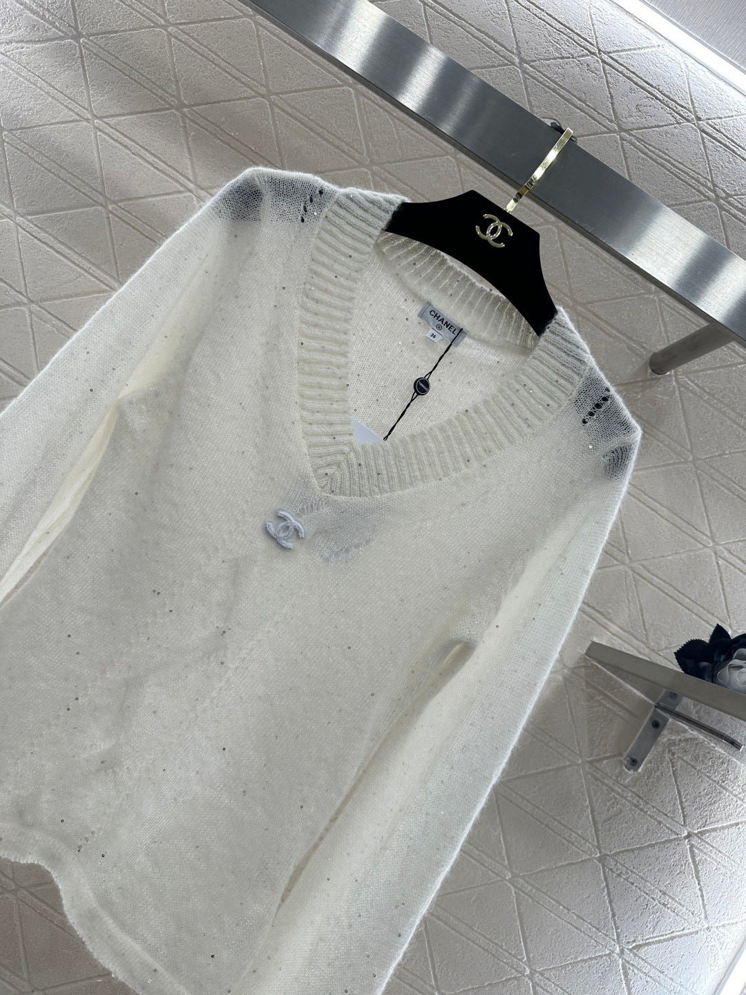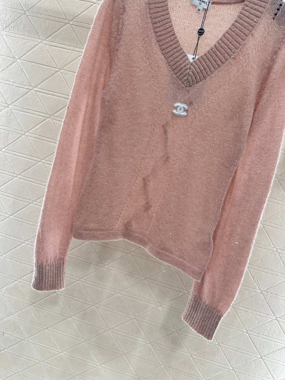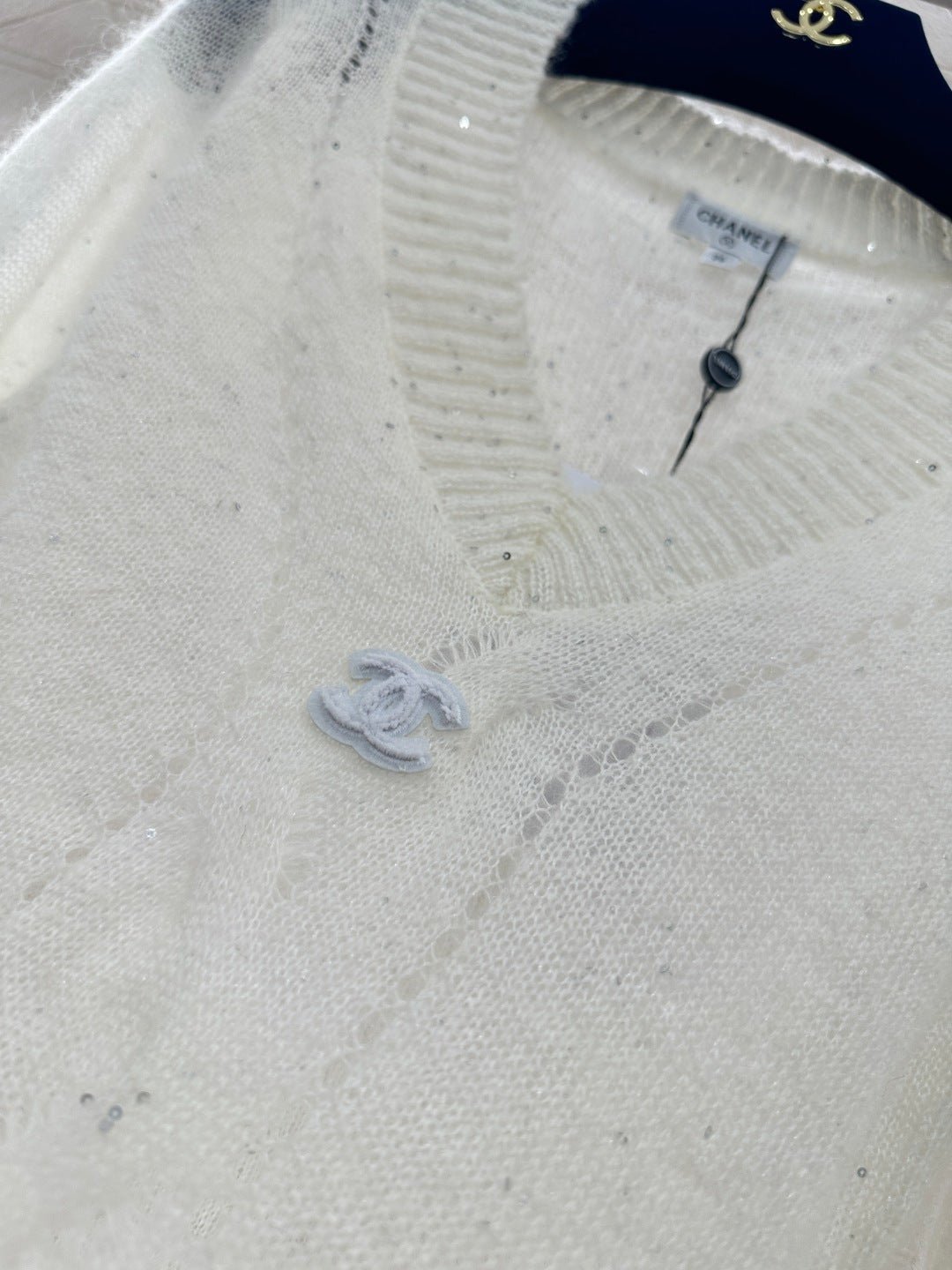 Crafted from cashmere yarn, this high-quality, soft, and comfortable sweater features a sweetheart neckline and a pullover design. The fabric is interwoven with sequins for a subtle shimmer, and comes in two gentle and elegant colors: off-white and nude pink. The sheer wool fabric adds a touch of ethereal beauty, while the double C detail on the chest is exquisite and sophisticated. The loose, sweetheart neckline creates a relaxed and casual look. Wear it alone for a cool and sophisticated vibe, or layer it with a camisole or tank top for a more layered and stylish look. A must-have for any sweet and edgy wardrobe.