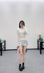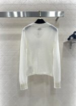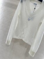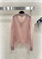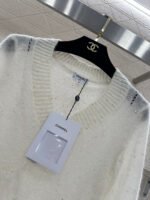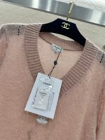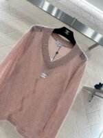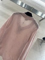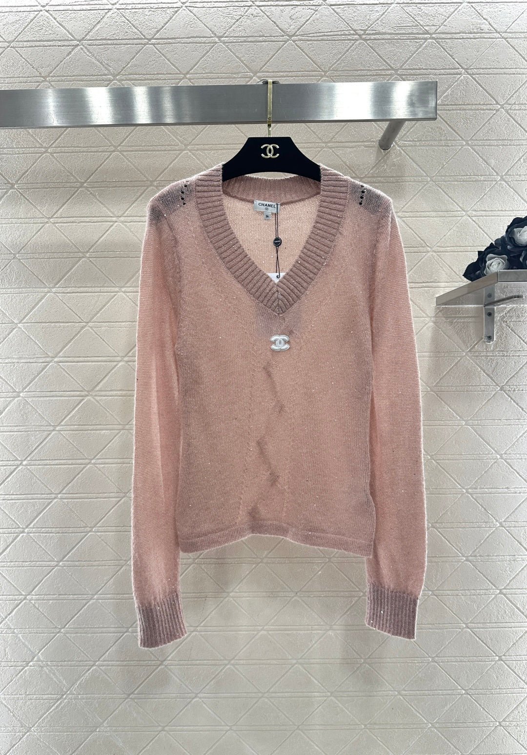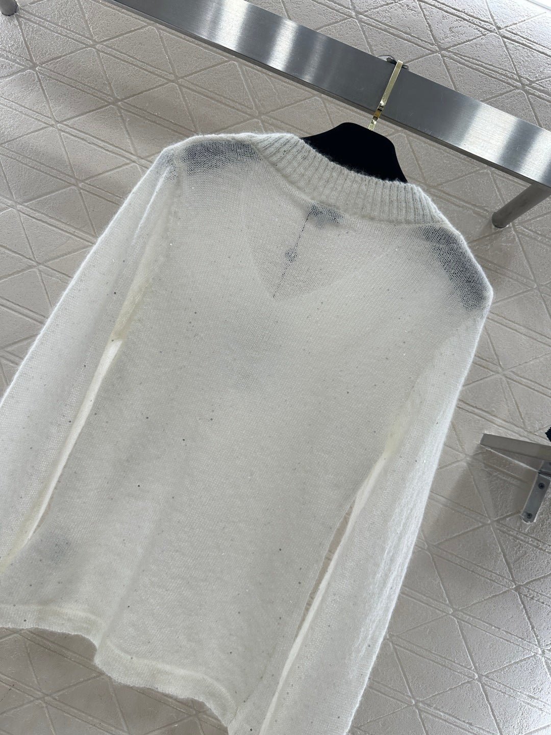 Crafted from cashmere yarn, this high-quality, soft, and comfortable sweater features a sweetheart neckline and a pullover design. The fabric is interwoven with sequins for a subtle shimmer, and comes in two gentle and elegant colors: off-white and nude pink. The sheer wool fabric adds a touch of ethereal beauty, while the double C detail on the chest is exquisite and sophisticated. The loose, sweetheart neckline creates a relaxed and casual look. Wear it alone for a cool and sophisticated vibe, or layer it with a camisole or tank top for a more layered and stylish look. A must-have for any sweet and edgy wardrobe.