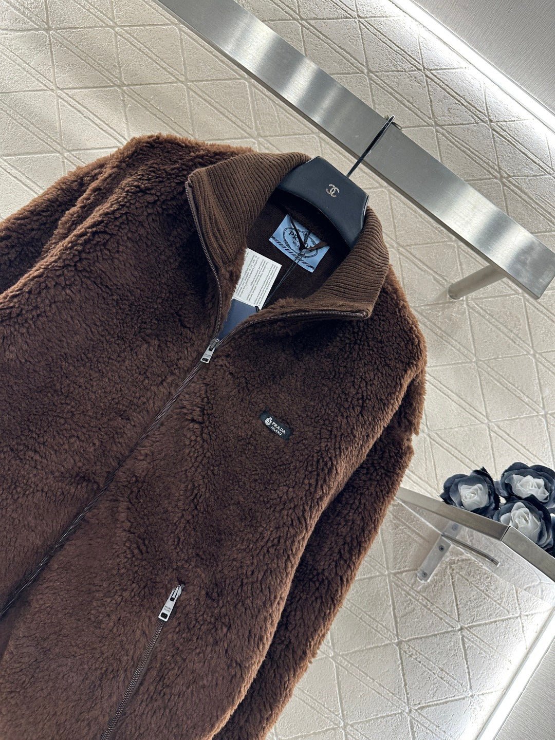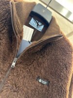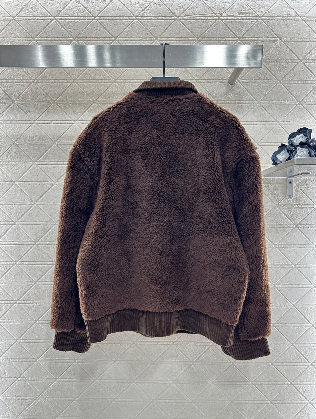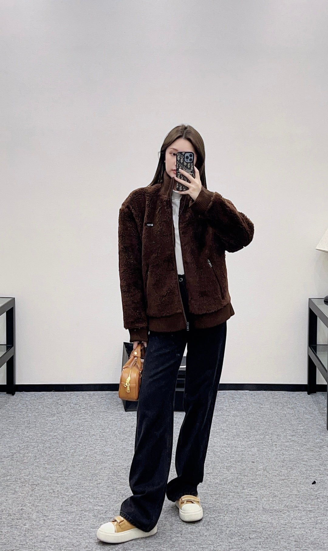 Entirely covered in teddy plush material, with double-sided fleece for extra warmth, a soft and comfortable feel, and a stylish and chic look. Features a lapel collar, a zippered front, and a logo on the chest, showcasing the brand’s sophisticated style. The entire jacket is finished with vertical ribbed elastic trim, creating a structured silhouette with a plush feel that exudes fashionable flair. A top choice for autumn and winter wear, it can be easily layered.