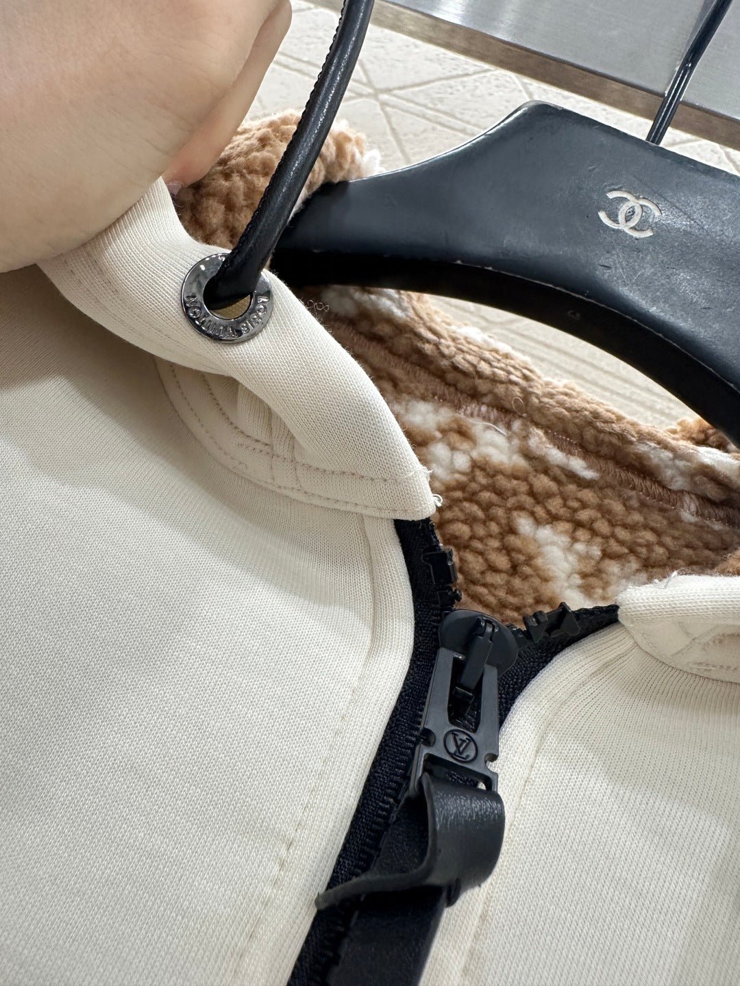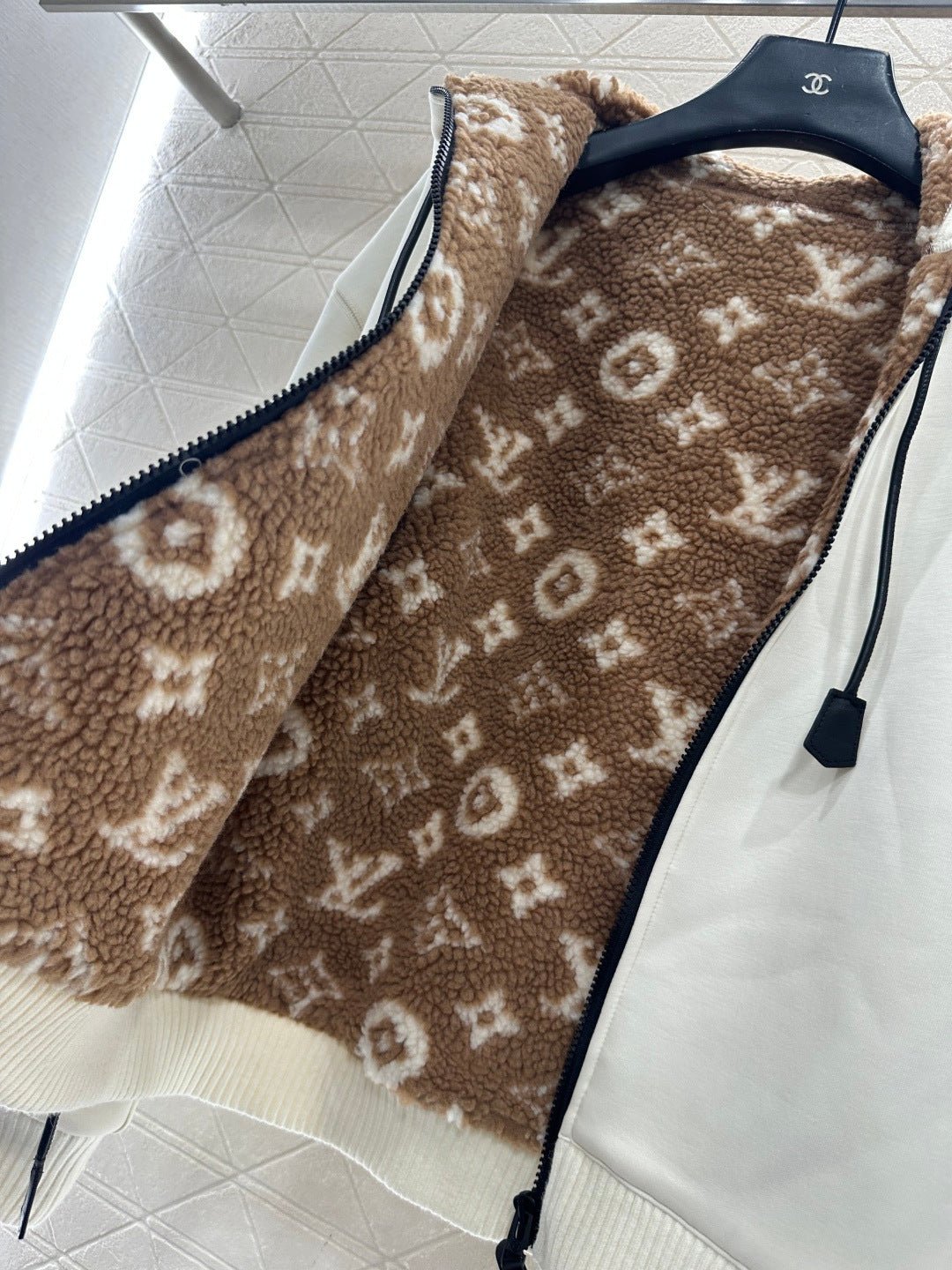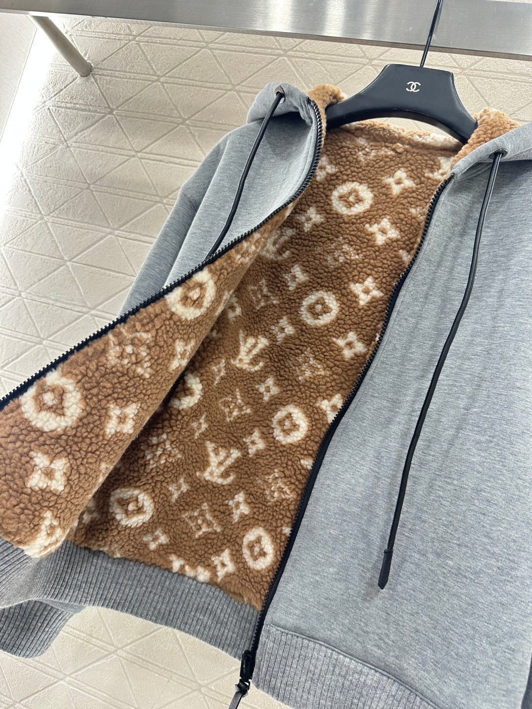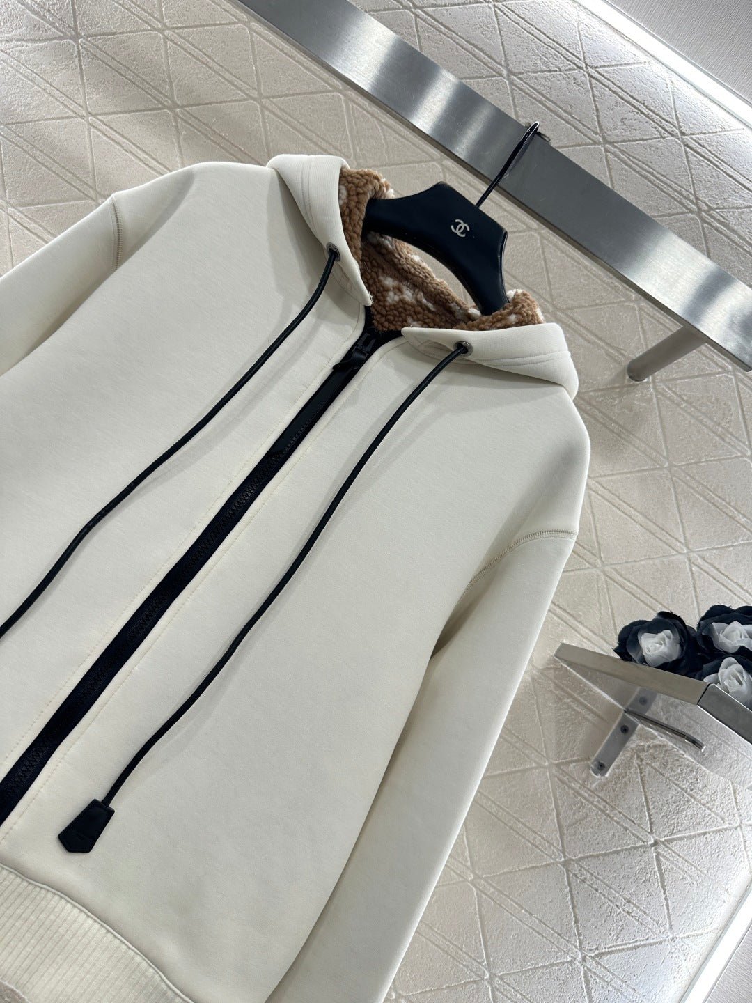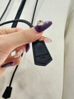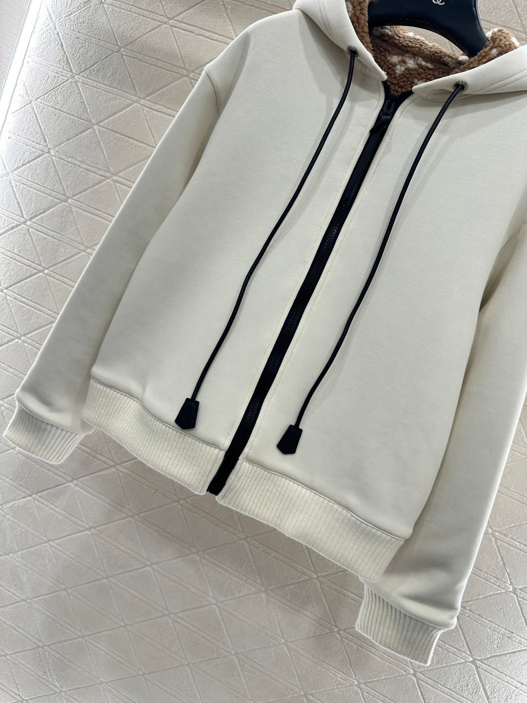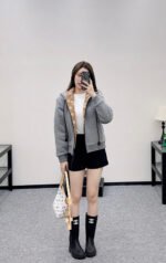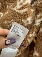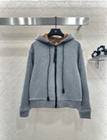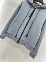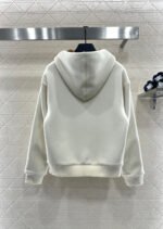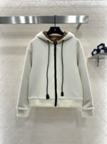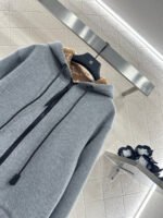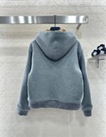 Made entirely of cotton, with a teddy bear plush lining for a soft, comfortable, and warm feel, this jacket features a stylish four-leaf clover logo. The hooded drawstring zipper design, with leather buckles at the drawstring ends adorned with engraved lettering, echoes the lining and showcases the brand’s sophisticated style.