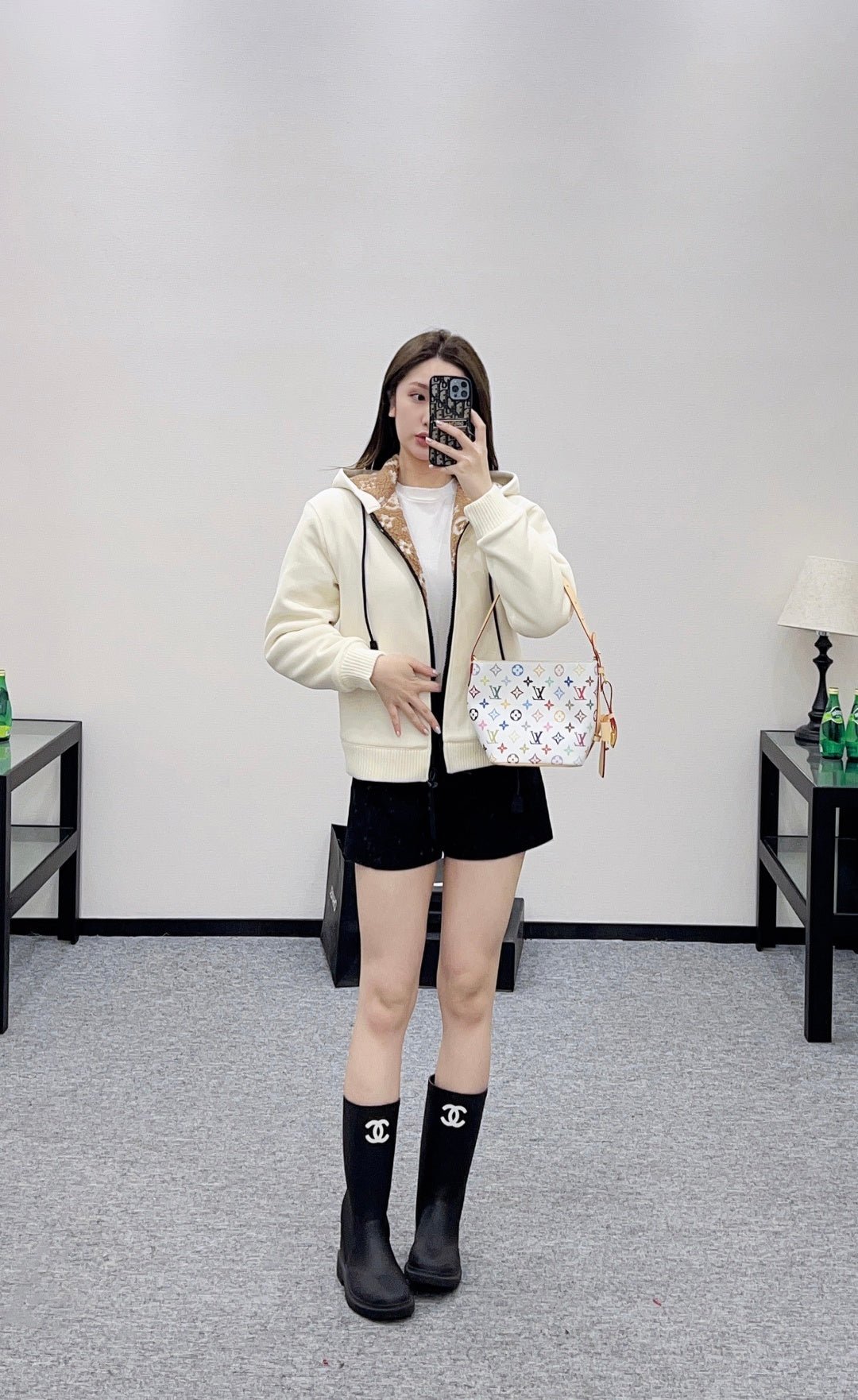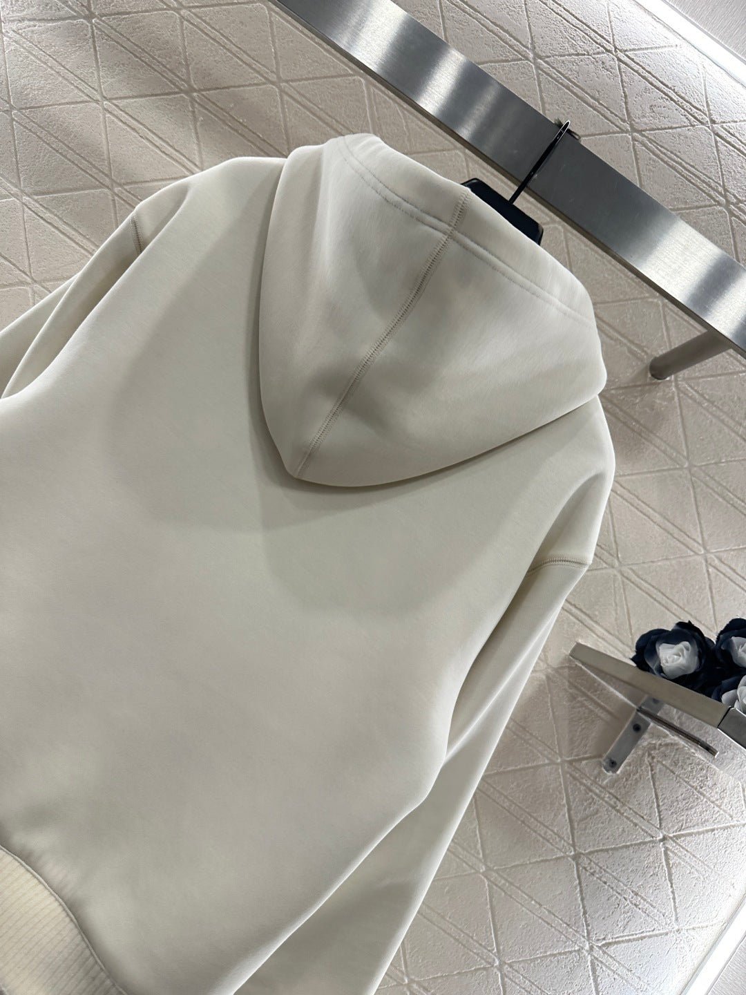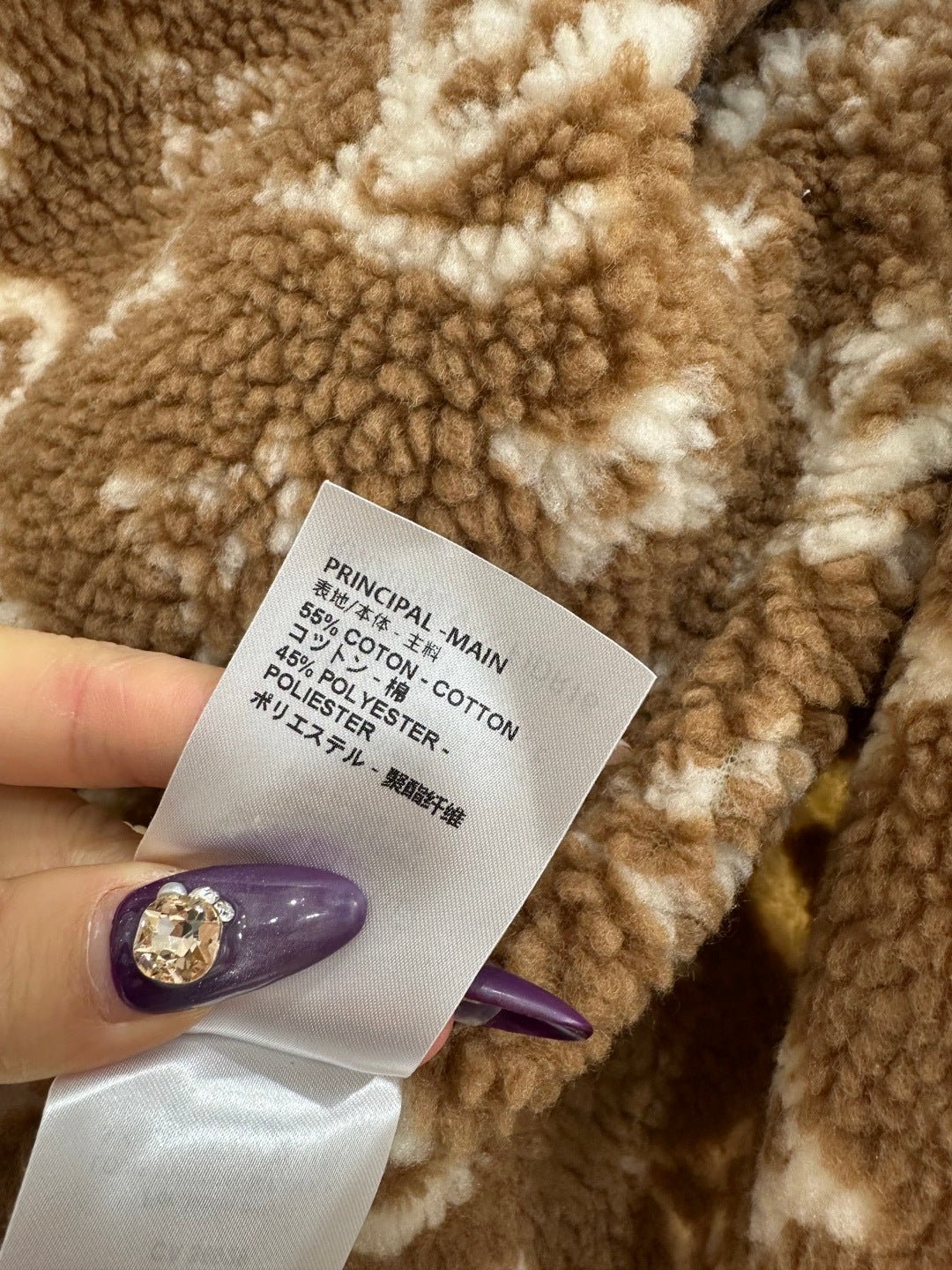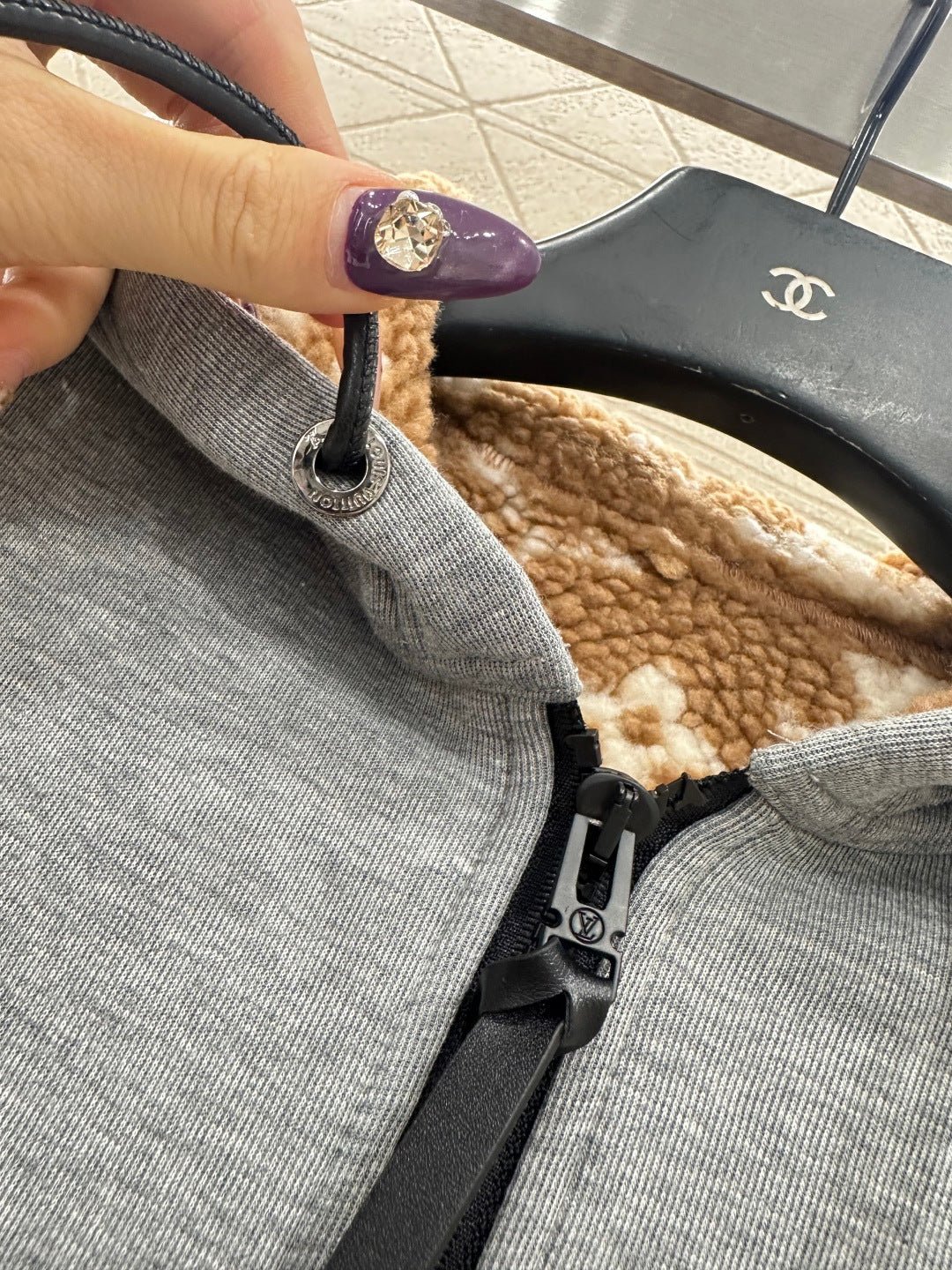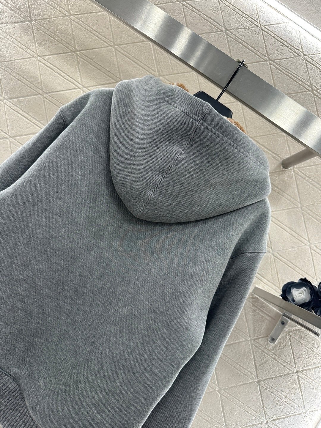 Made entirely of cotton, with a teddy bear plush lining for a soft, comfortable, and warm feel, this jacket features a stylish four-leaf clover logo. The hooded drawstring zipper design, with leather buckles at the drawstring ends adorned with engraved lettering, echoes the lining and showcases the brand’s sophisticated style.