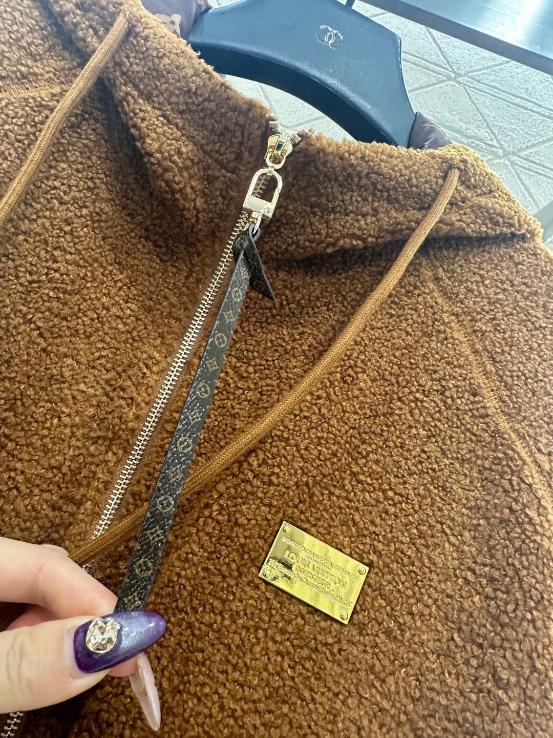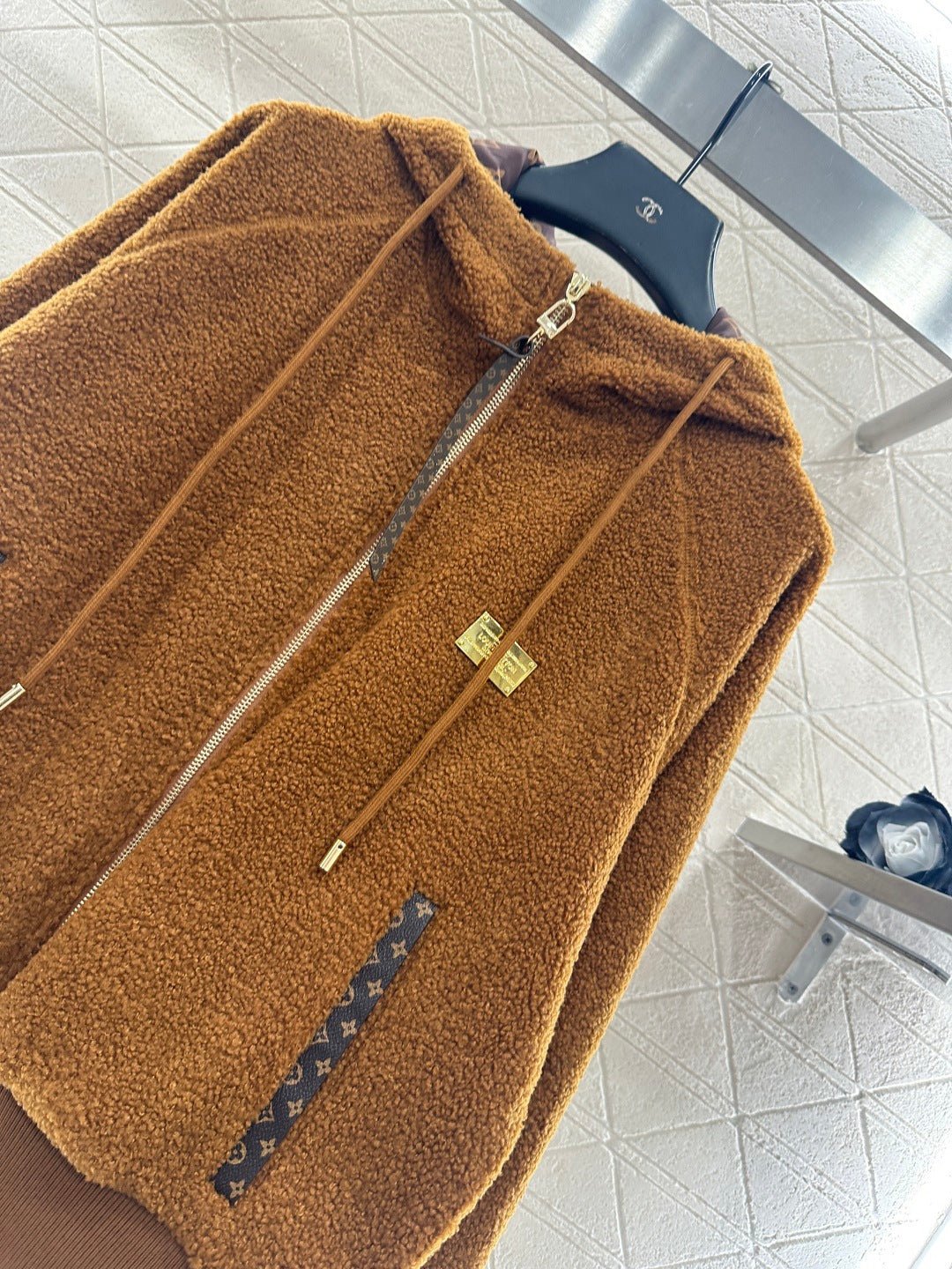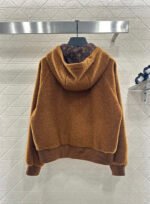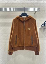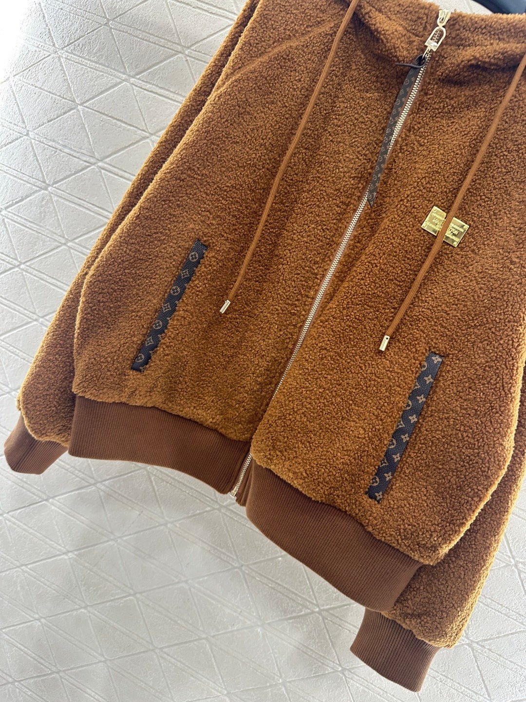 Made from teddy bear lamb wool, this garment boasts exceptional quality and texture. The hooded drawstring zipper design allows for easy on and off, and versatile styling. The all-over plush fabric exudes fashionable charm. Pocket prints and leather buckles complement each other, while a metal engraved logo on the chest adds exquisite details and depth. The brown four-leaf clover lettering on the lining clearly displays the logo, elevating the overall style. The garment features ribbed elasticated edges for adjustment and a relaxed, dropped-shoulder fit.