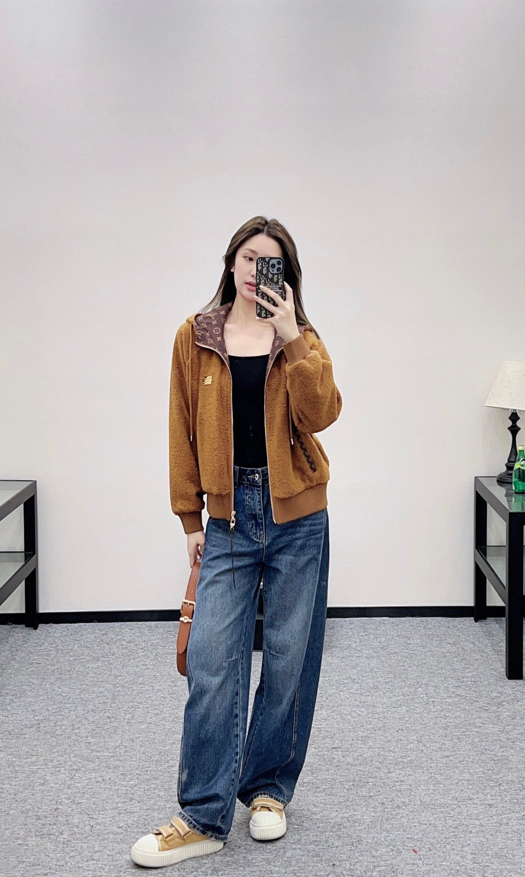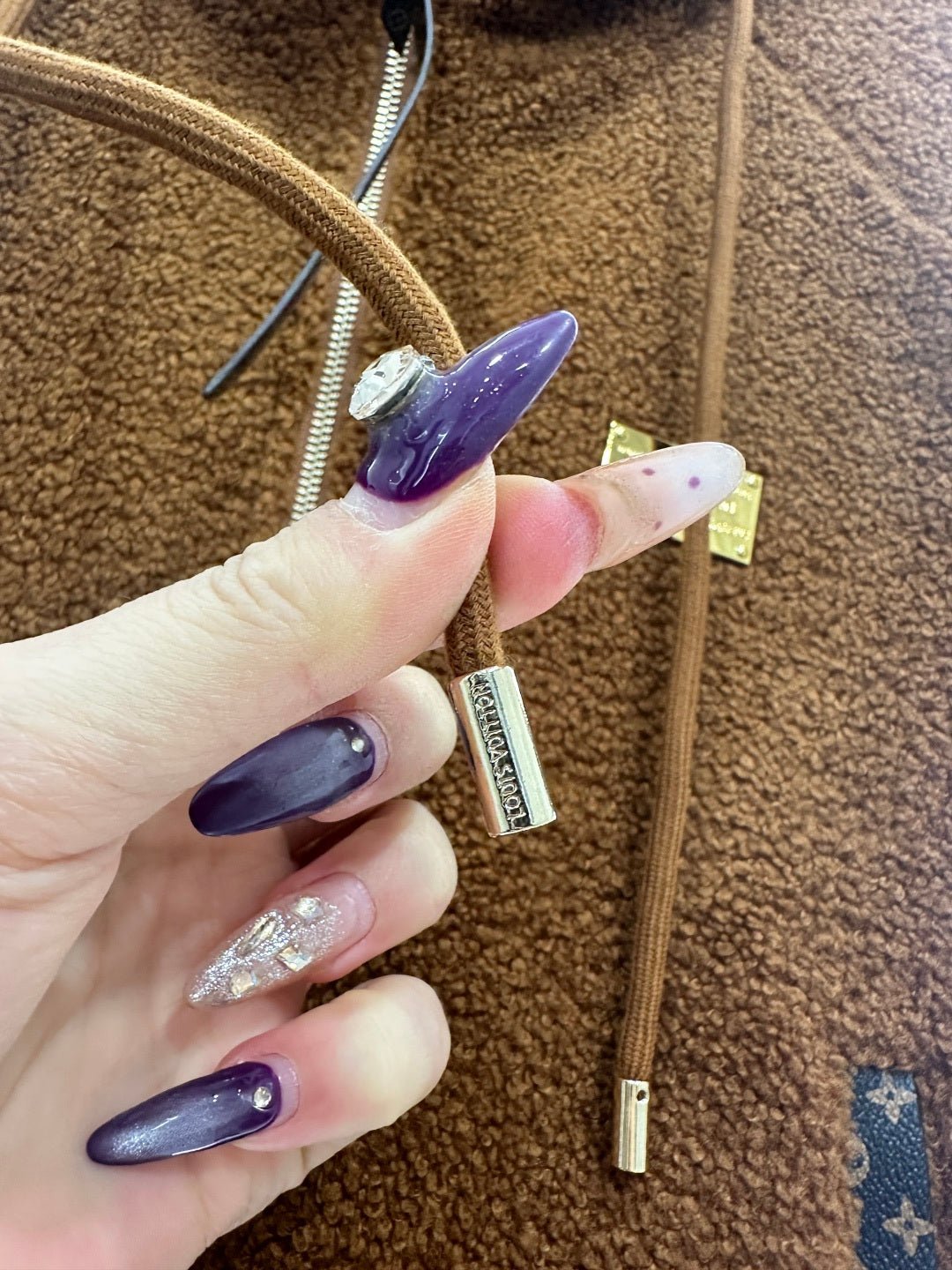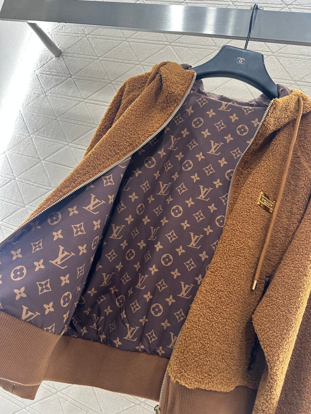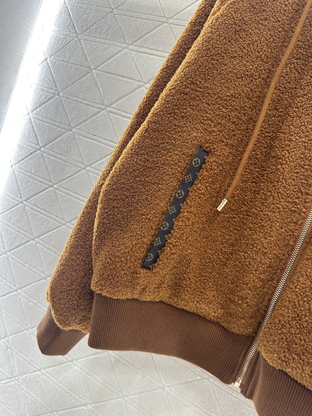 Made from teddy bear lamb wool, this garment boasts exceptional quality and texture. The hooded drawstring zipper design allows for easy on and off, and versatile styling. The all-over plush fabric exudes fashionable charm. Pocket prints and leather buckles complement each other, while a metal engraved logo on the chest adds exquisite details and depth. The brown four-leaf clover lettering on the lining clearly displays the logo, elevating the overall style. The garment features ribbed elasticated edges for adjustment and a relaxed, dropped-shoulder fit.