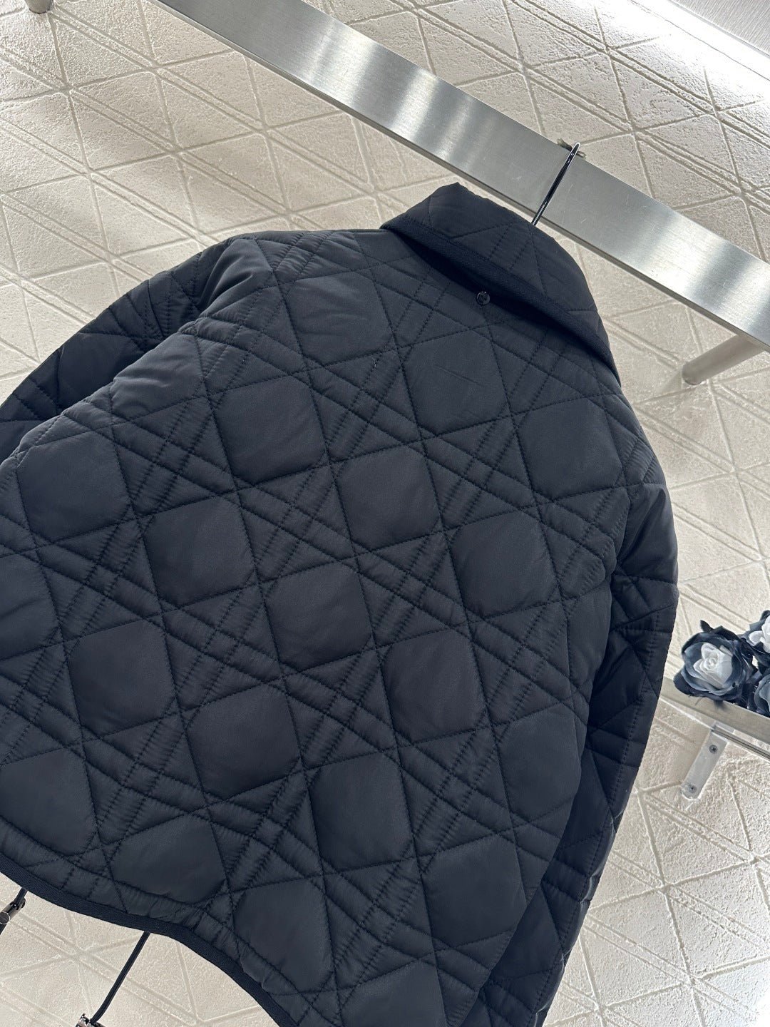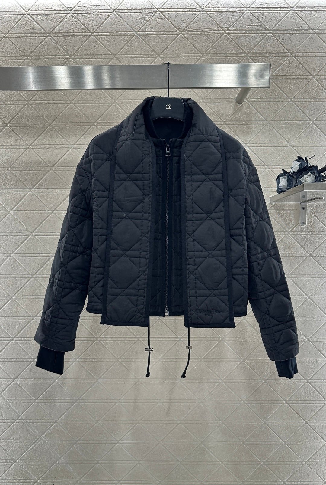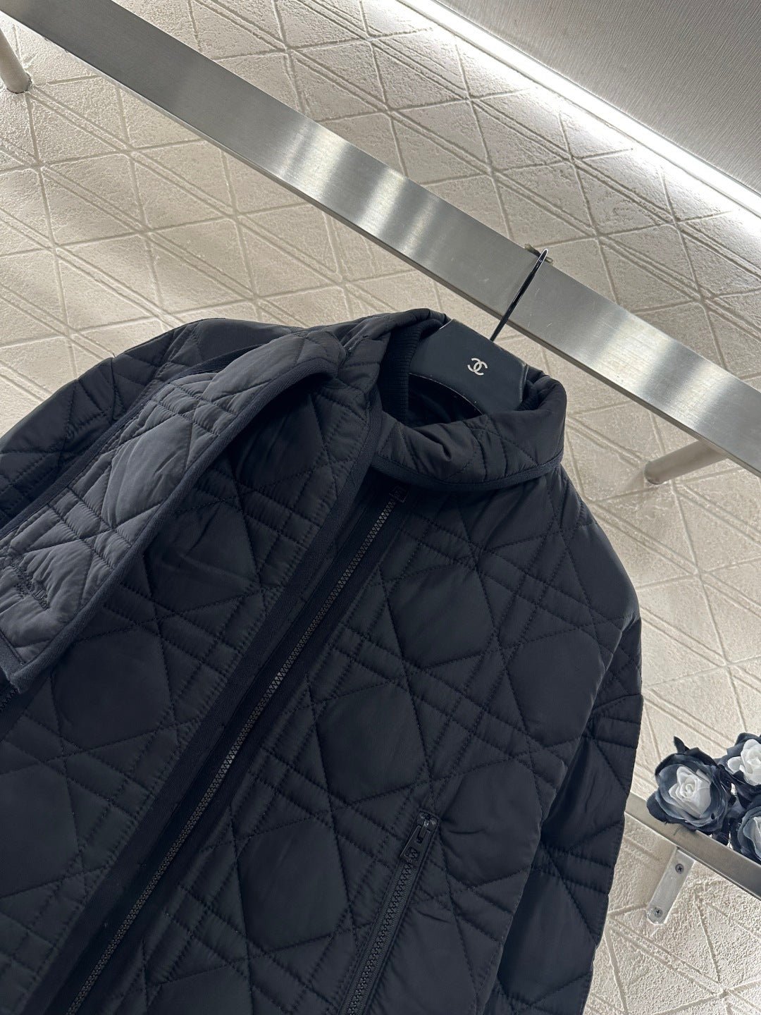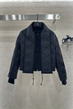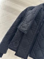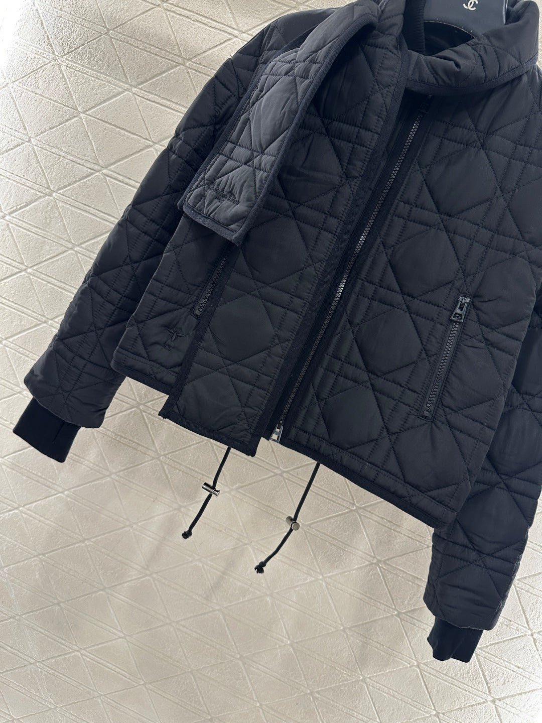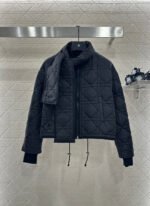 Made of windproof and waterproof nylon with a down-filled lining, this lightweight and warm short zip-up jacket features a detachable, button-down-filled scarf with ribbed trim that contrasts beautifully with the main fabric. The cannage pattern embossing, bias-cut zip-up pockets, and bee embroidery at the hem showcase the brand’s philosophy, revealing luxurious details. The slim-fit, short style is chic and fashionable.