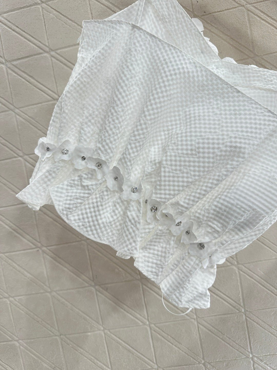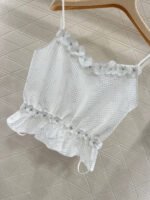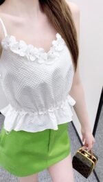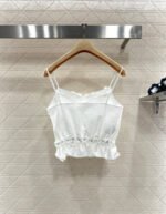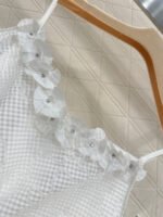 Made of cotton and silk, this comfortable and breathable tank top features thin straps and a trendy, sleek cut. The textured fabric has a subtle double-C pattern, and the neckline is trimmed with three-dimensional rhinestone camellias, echoing Chanel’s signature elements and adding depth to the design. A small camellia at the waist adds a touch of understated luxury to the simple design. It effortlessly accentuates the waist, creating a flattering silhouette and a sophisticated look. Perfect for vacations and various occasions, this playful and stylish tank top is a versatile choice.
