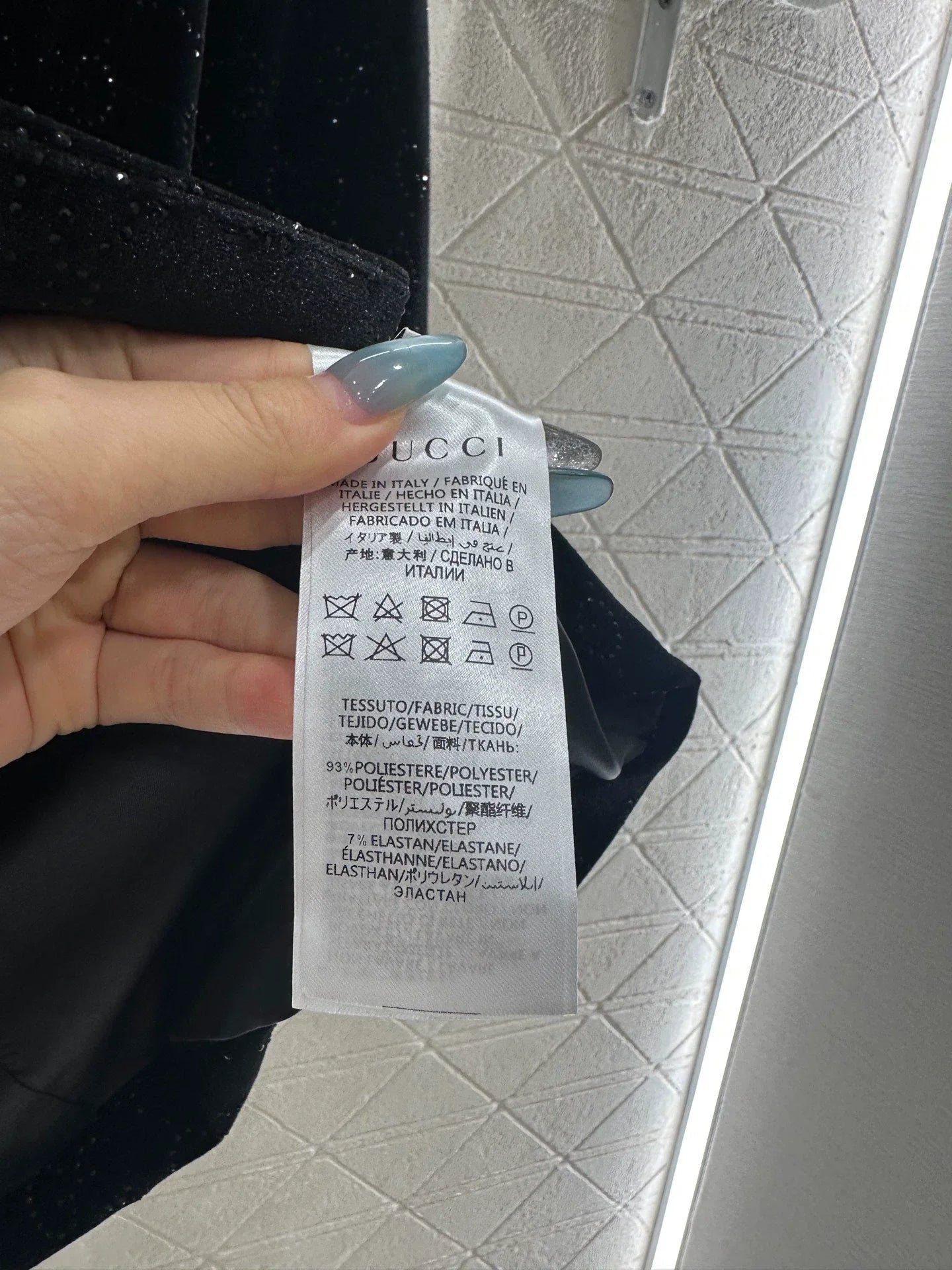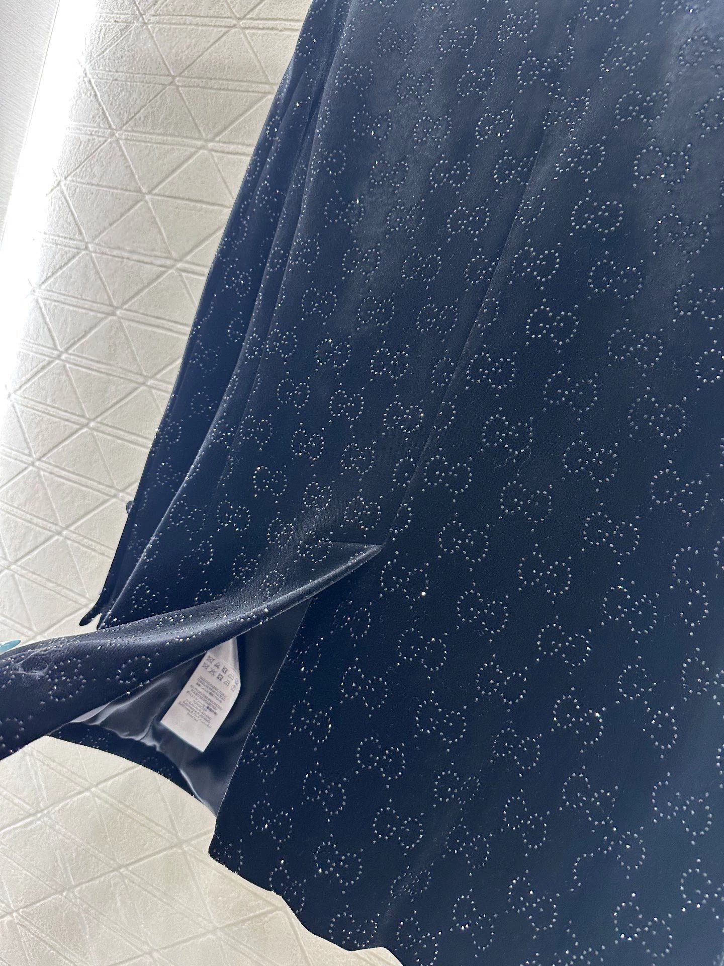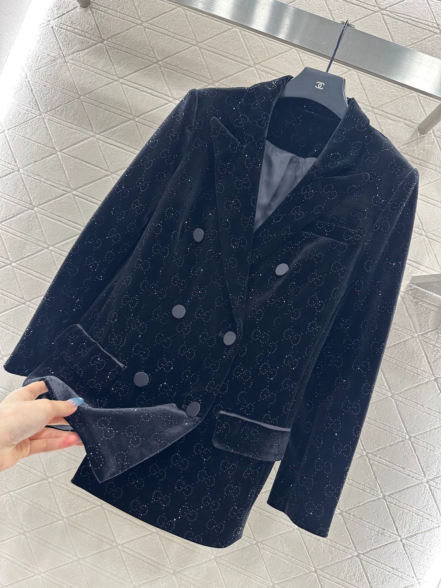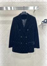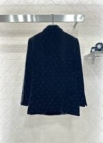 Velvet material, glossy texture, comfortable drape, lapel shoulder suit jacket design, smooth and reflective velvet throughout, contrasting with the double G full print embellished with rhinestones, gun collar with double breasted adjustment, simple and atmospheric cut jacket flap pocket ➕ The rear slit provides ample details, creating a low-key and luxurious overall look, showcasing the elegance of a knowledgeable old man