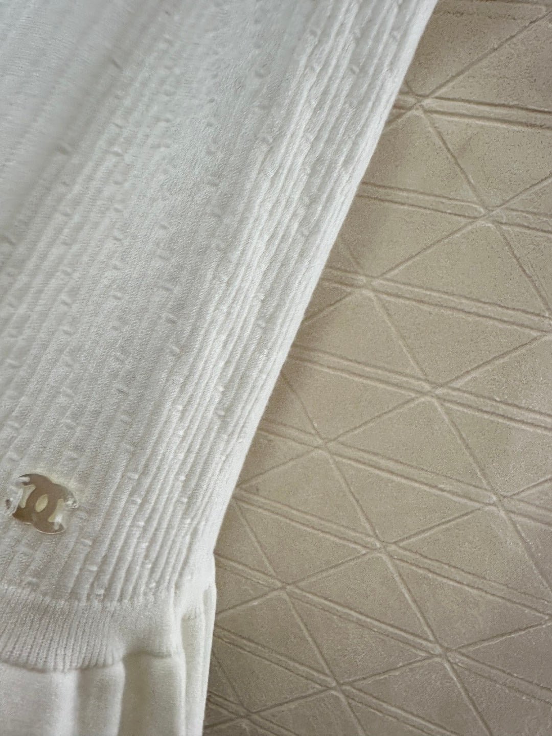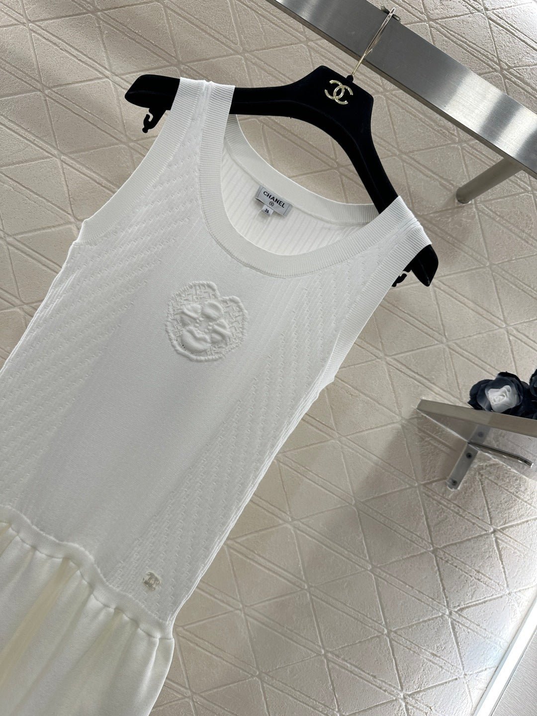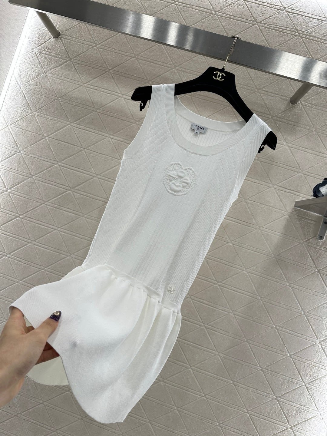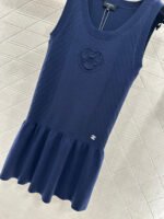 Woven from cotton and wool yarn, this soft and delicate knit vest dress offers a comfortable feel. The round neck design features a pleated, cake-hem hem for added layering. The vertical ribbed pattern with a textured finish and a central camellia embellishment adds a touch of sophistication and style. Elastic ribbed trim provides a slimming effect, while the double C logo on the waist adds a striking detail, showcasing the brand’s identity. Overall, this dress is chic and playful.