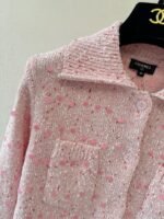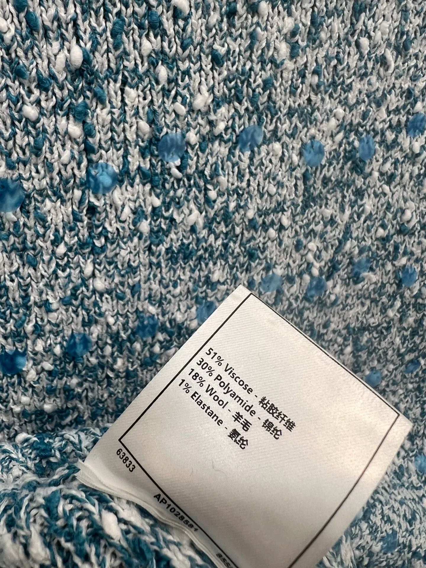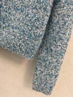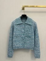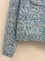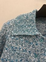 Water blue main body with white collar design, embellished with blue and white blended yarn, exquisite and compact. The lapel design is paired with four buttons, making it a slim and short fit. The fabric is made of a blend of 51% viscose fiber, 30% polyamide, 18% wool, and 1% spandex, providing a soft and comfortable touch. Suitable for wearing in autumn and winter seasons, it pairs well with skirts or pants, showcasing fashionable taste~