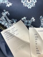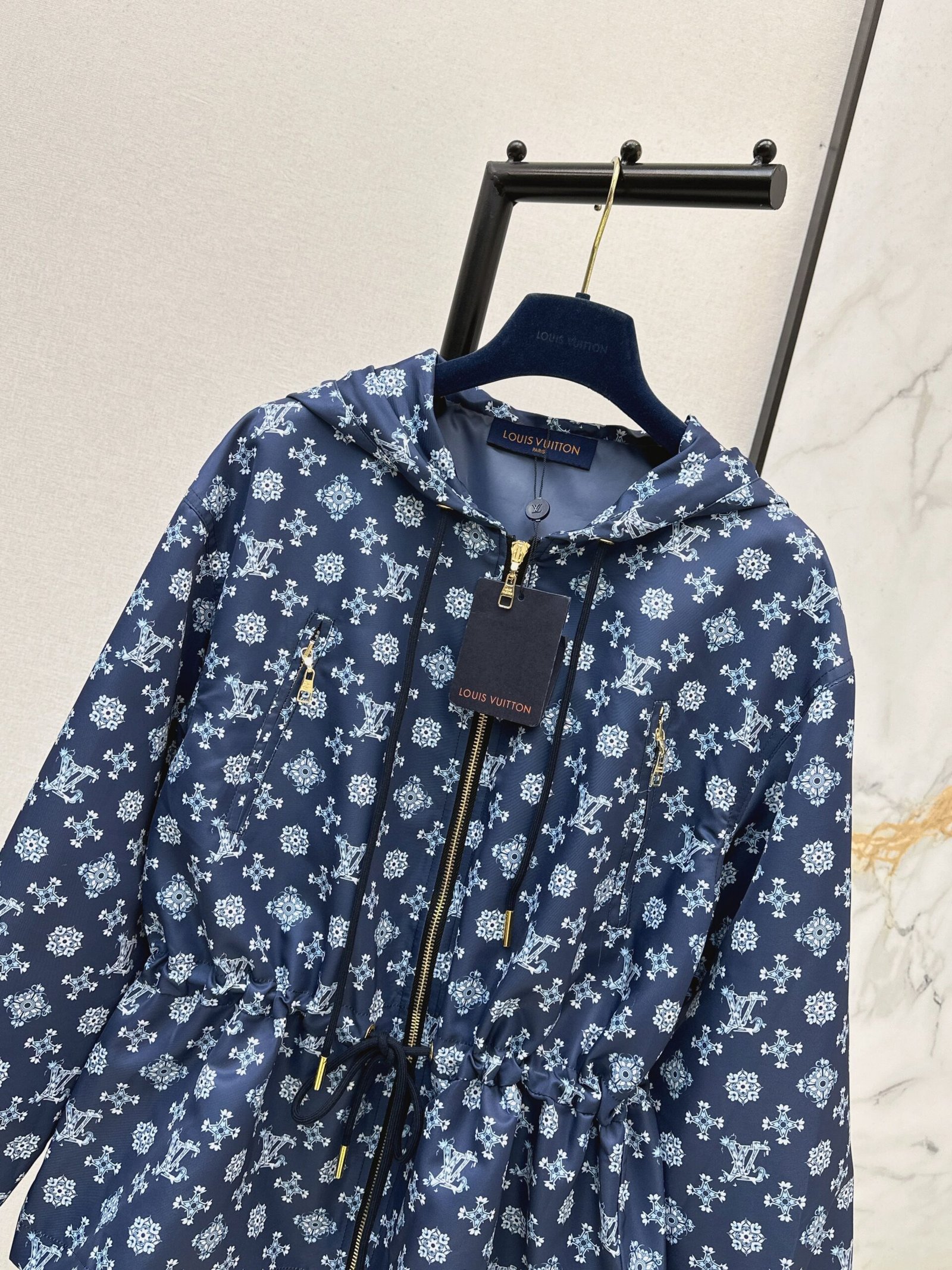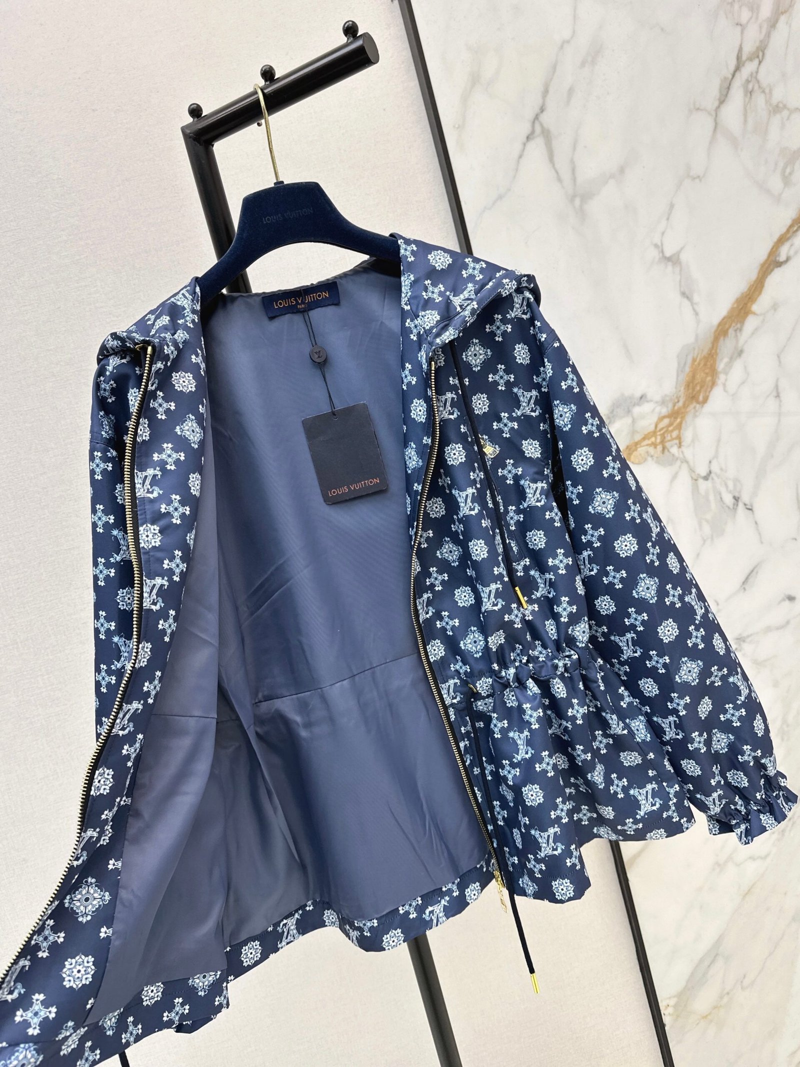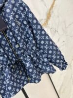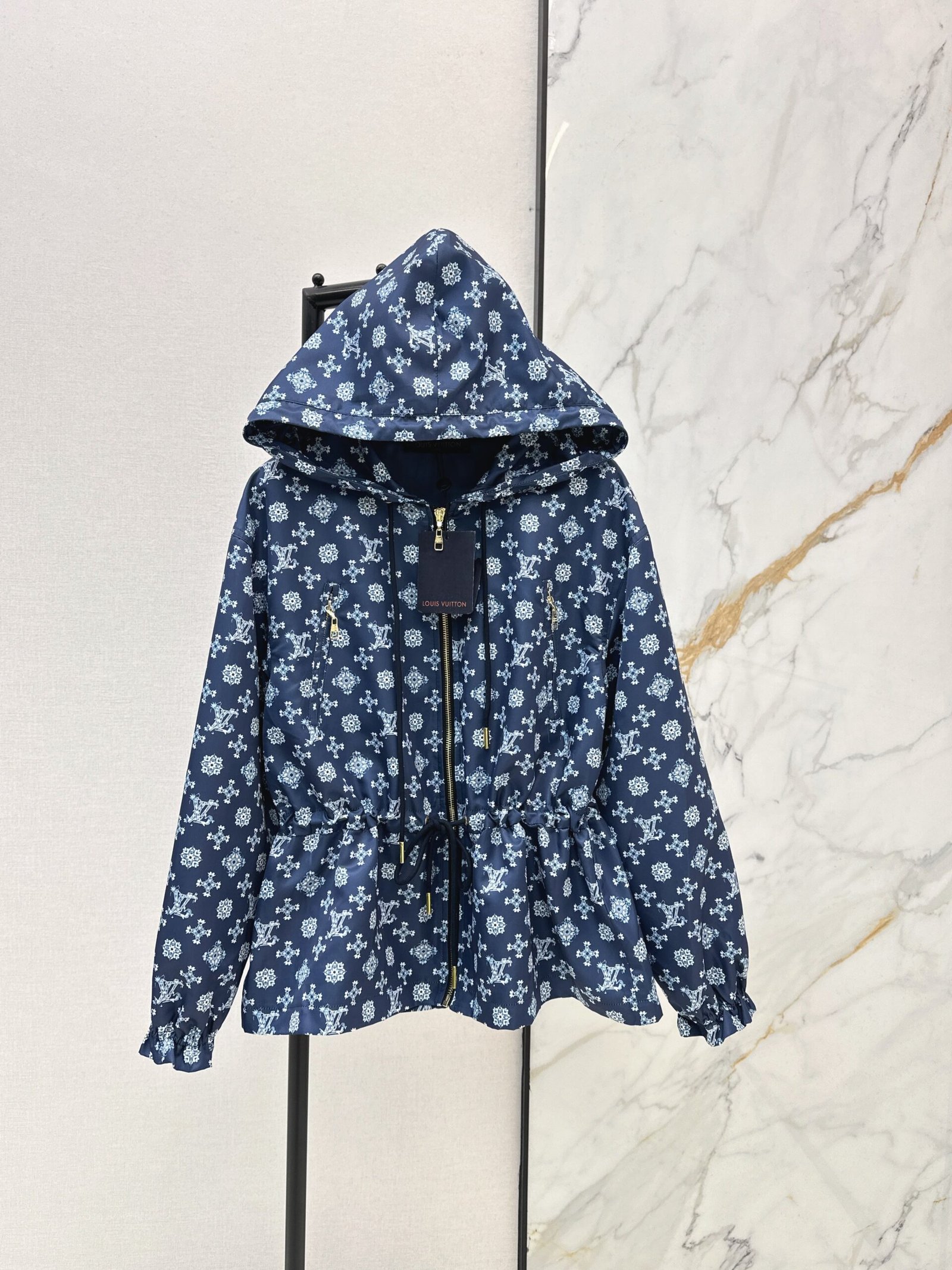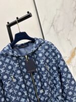 Made from imported windproof material, this structured and stylish jacket features a hooded zip-up design. The navy blue base is overlaid with a four-leaf clover logo, creating an artistic and distorted print. The style is fashionable and casual. The navy blue base paired with fresh white floral prints is romantic and distinctive. A subtle LV logo adds a touch of understated brand sophistication. The loose hooded fit is relaxed and flattering. The smooth fabric drapes beautifully. Whether paired with a dress or jeans, it effortlessly creates an elegant and effortlessly chic look.