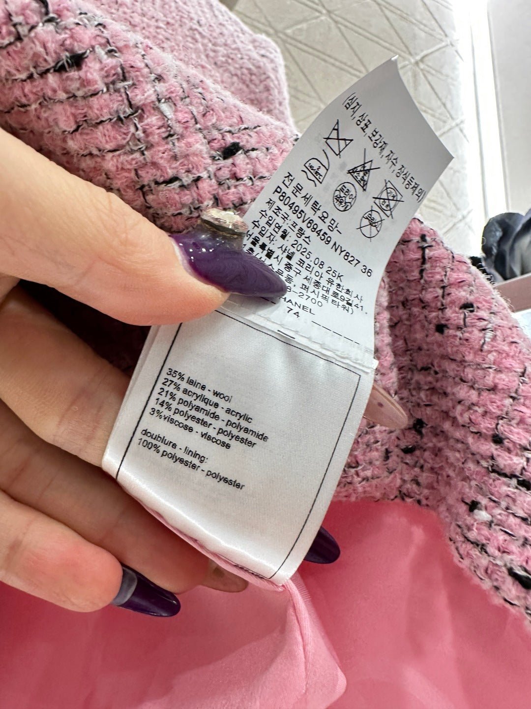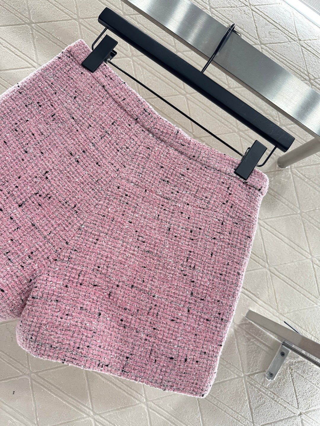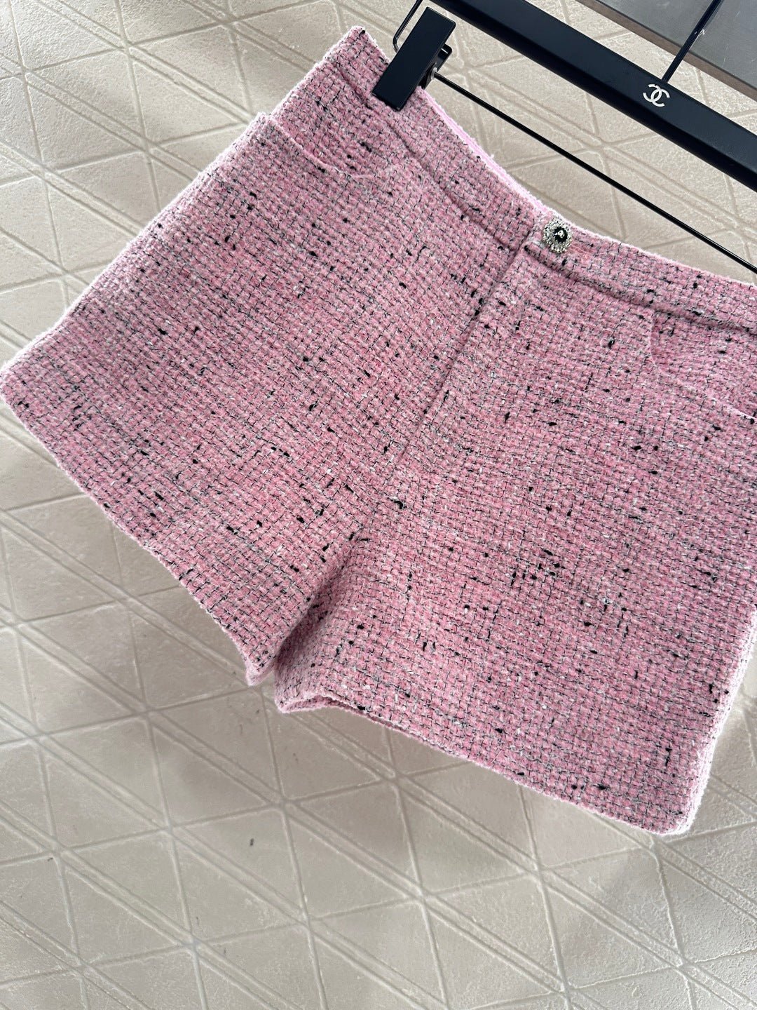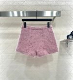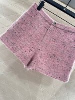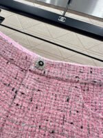 Made of high-quality woolen material, with a full appearance, this round neck short sleeved dress jacket is designed with shoulder pads that fit the human body, making it appear slender and upright. The front placket is embellished with double C carved buttons, giving the overall shape a strong sense of luxury. The whole body has a bright pink background, interspersed with delicate black weaving thread, and the grid texture is spread throughout the whole body. The jacquard inside is fully covered, highlighting the socialite style. Paired with shorts of the same series, the shorts logo and weaving details echo each other. The series of yarn skirts are layered and worn together, perfectly interpreting the elegant and luxurious feeling. It is both high-end and stylish