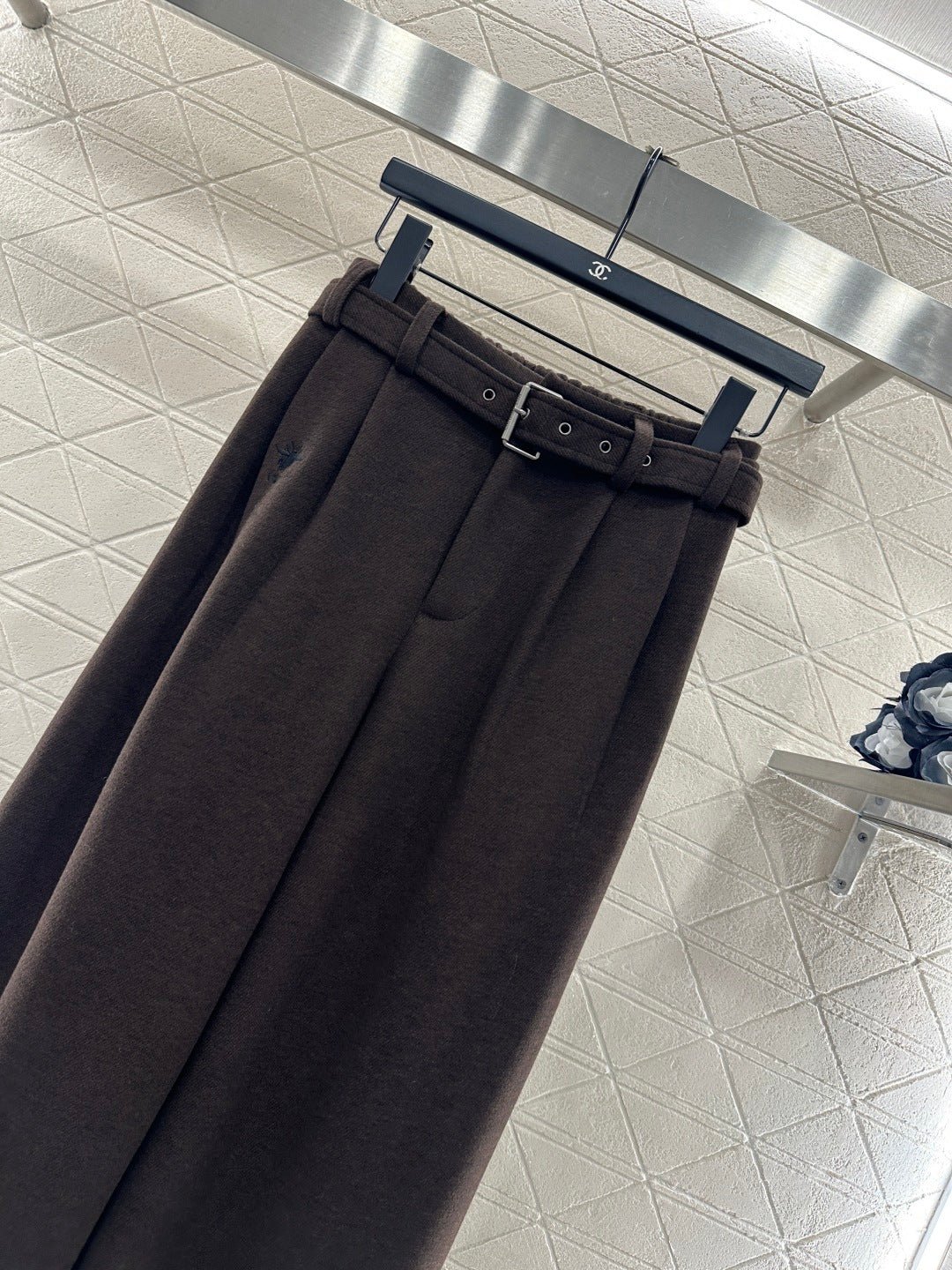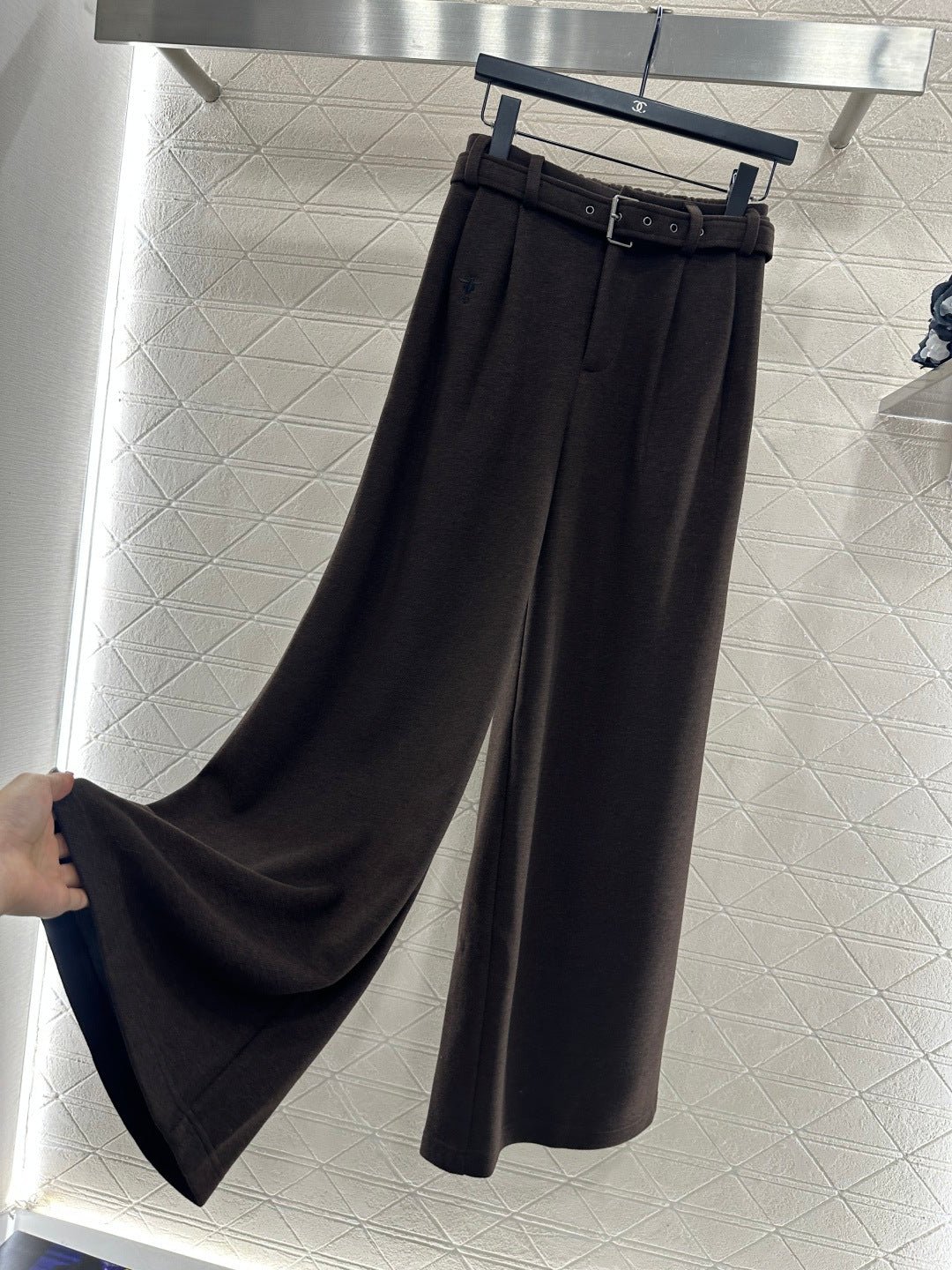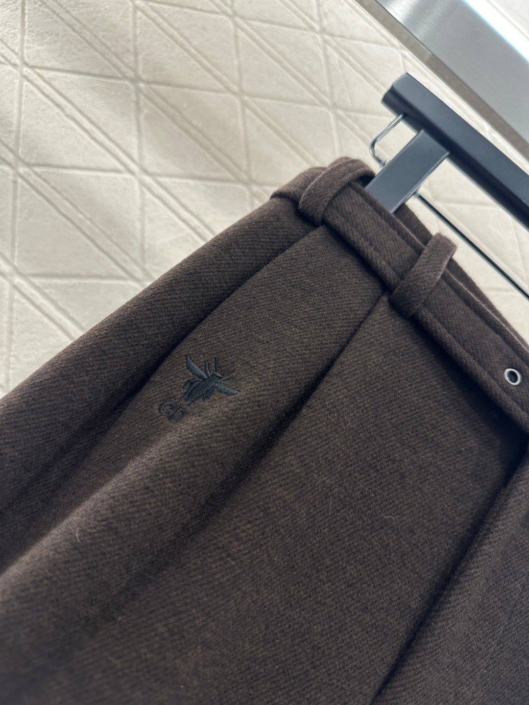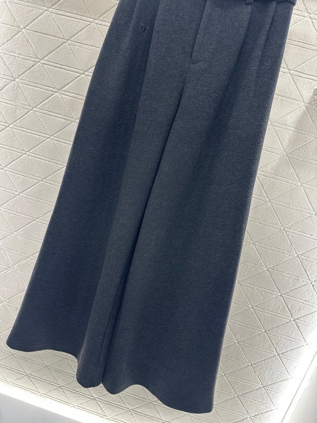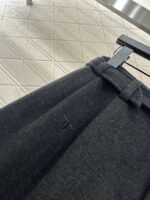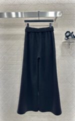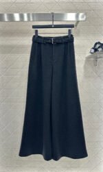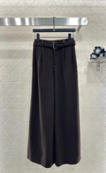 Made from a wool blend, the fabric is soft, comfortable, and drapes beautifully. Its thickness is perfect for autumn and winter, providing warmth and protection against the cold. The high-waisted, wide-leg trousers utilize a relaxed silhouette with pleats to elongate the legs and flatter the figure, adding a touch of style. The iconic CD bee embroidered logo on the pocket instantly elevates the brand’s sophistication. A perforated waistband allows for adjustable fit.