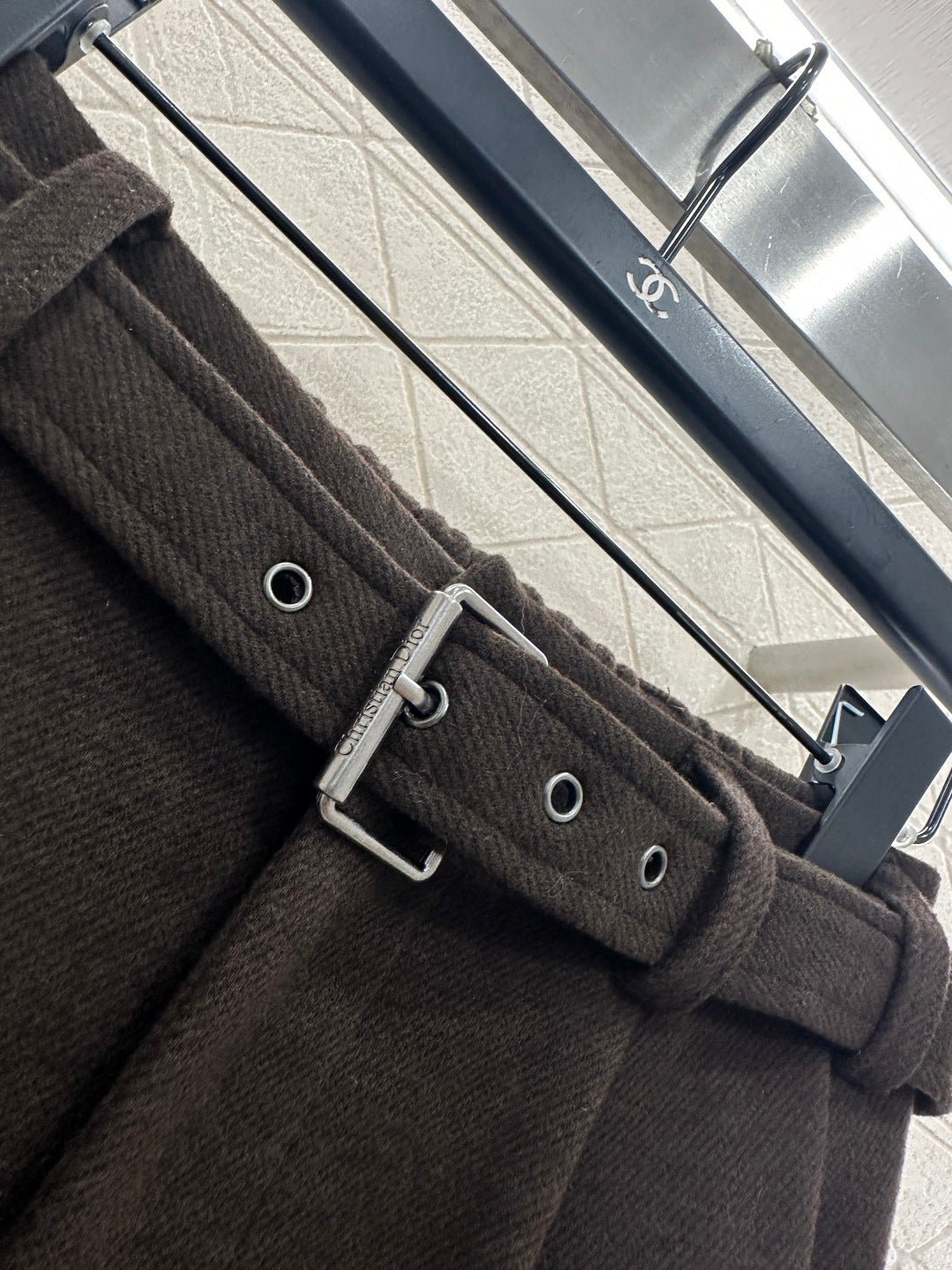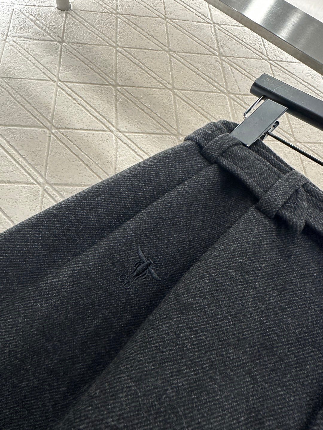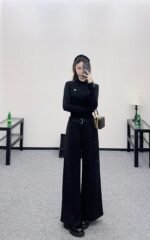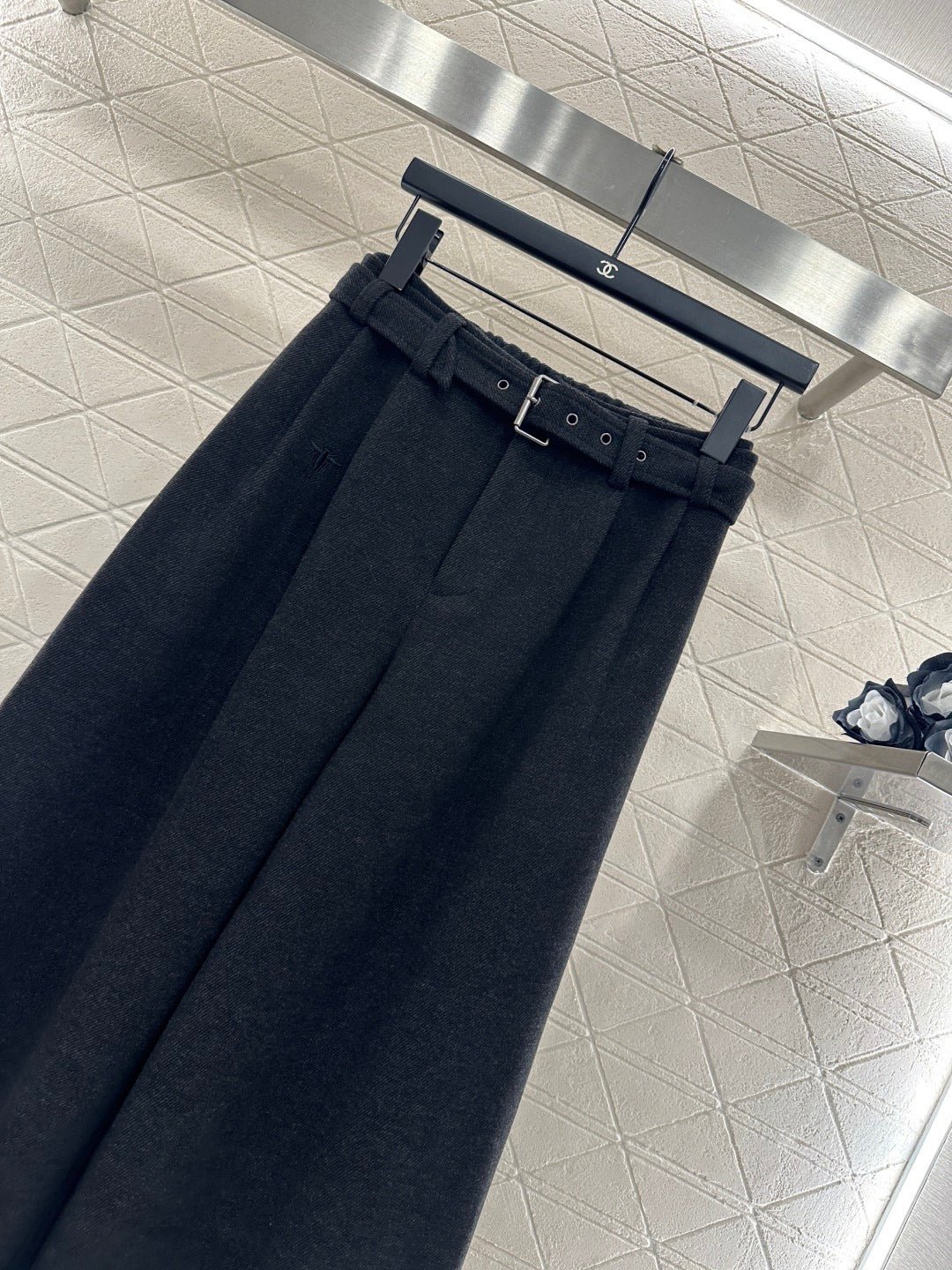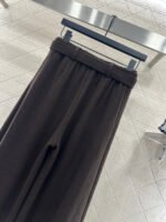 Made from a wool blend, the fabric is soft, comfortable, and drapes beautifully. Its thickness is perfect for autumn and winter, providing warmth and protection against the cold. The high-waisted, wide-leg trousers utilize a relaxed silhouette with pleats to elongate the legs and flatter the figure, adding a touch of style. The iconic CD bee embroidered logo on the pocket instantly elevates the brand’s sophistication. A perforated waistband allows for adjustable fit.