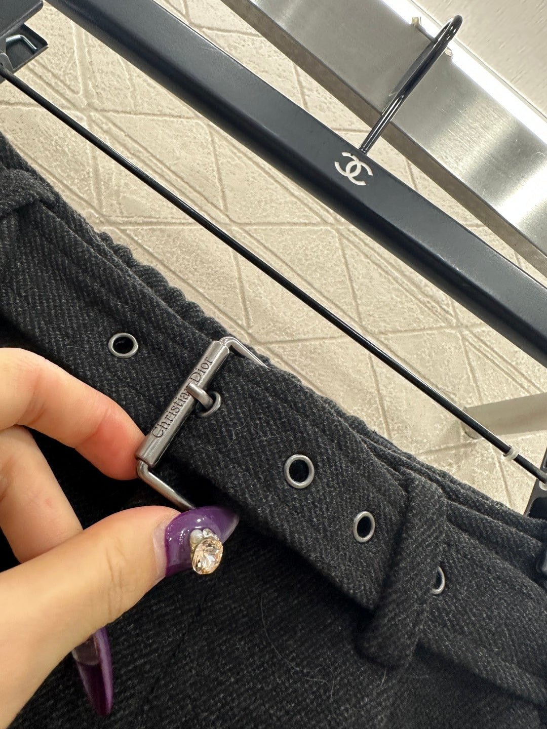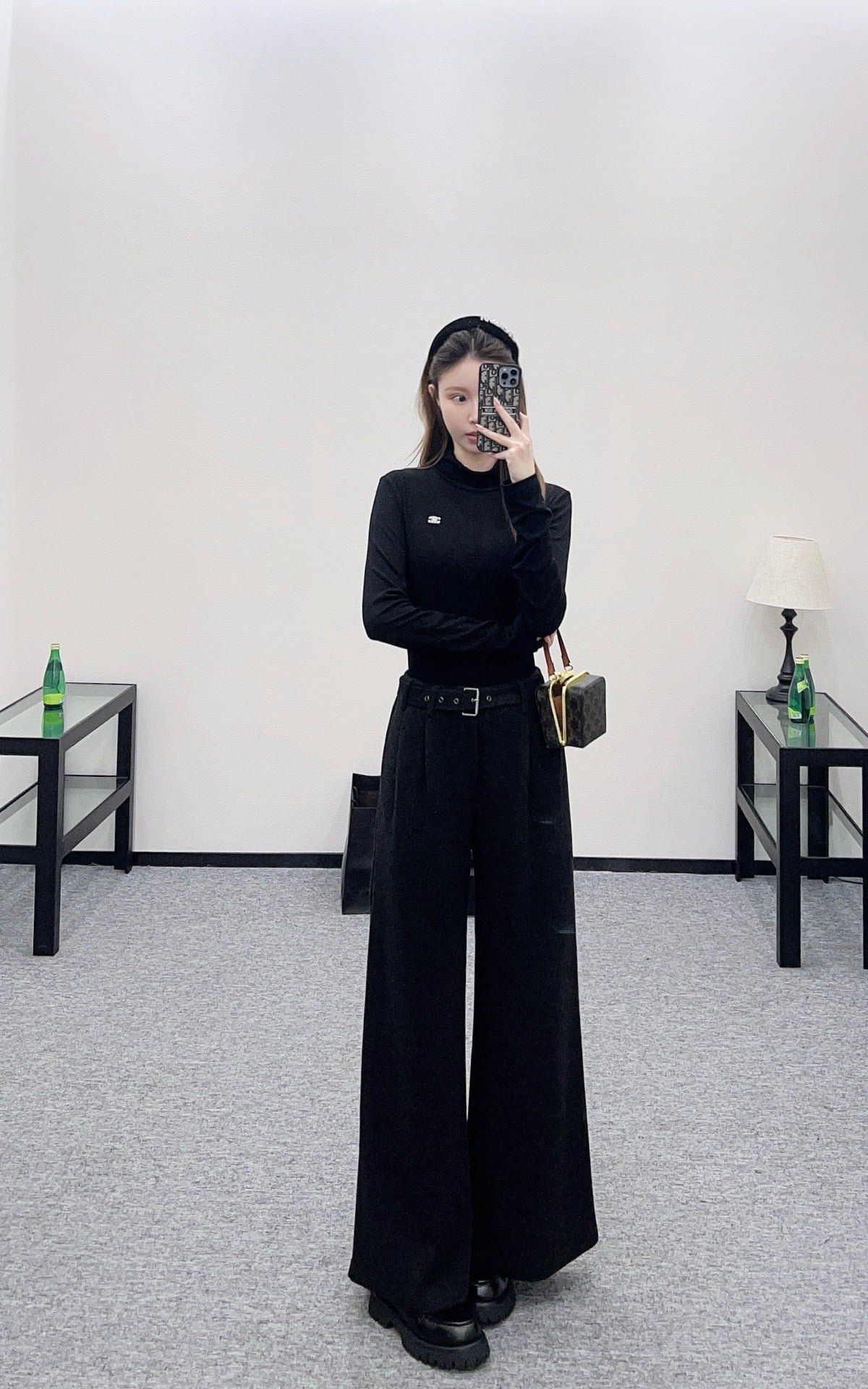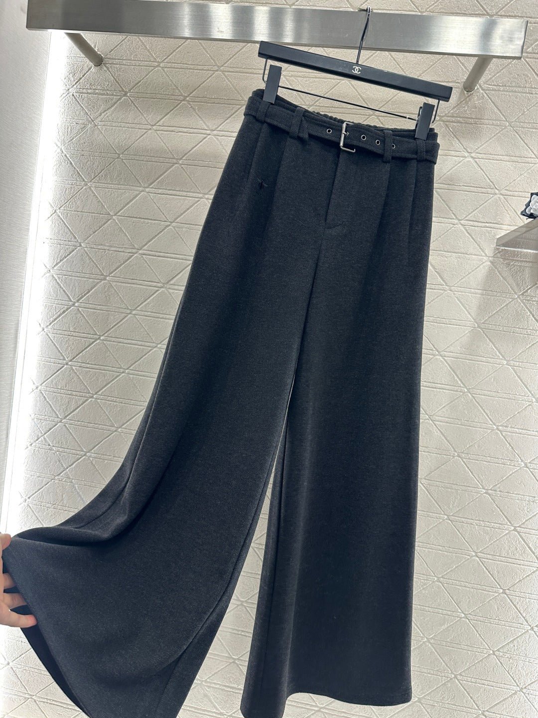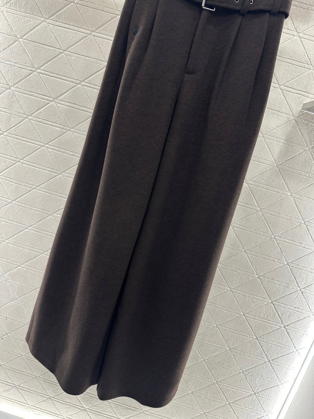 Made from a wool blend, the fabric is soft, comfortable, and drapes beautifully. Its thickness is perfect for autumn and winter, providing warmth and protection against the cold. The high-waisted, wide-leg trousers utilize a relaxed silhouette with pleats to elongate the legs and flatter the figure, adding a touch of style. The iconic CD bee embroidered logo on the pocket instantly elevates the brand’s sophistication. A perforated waistband allows for adjustable fit.