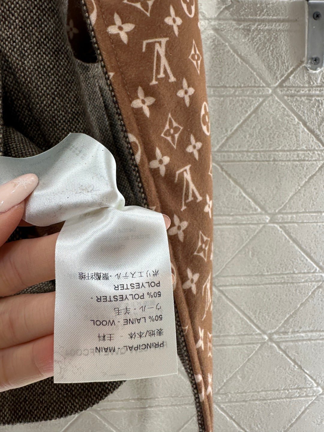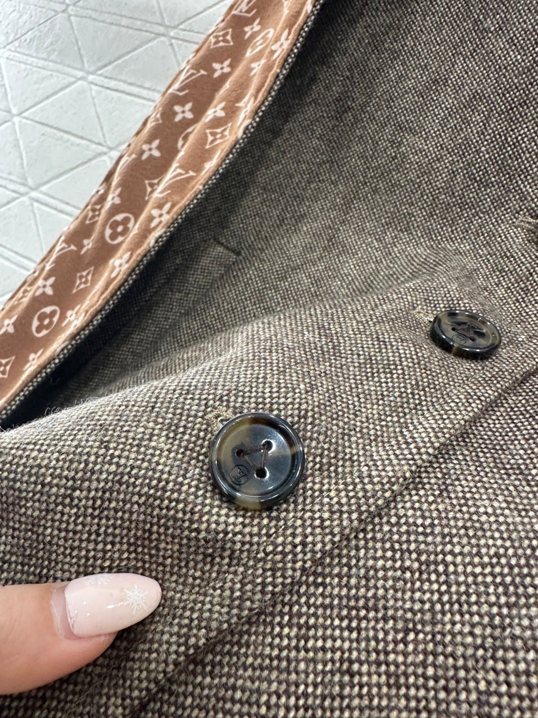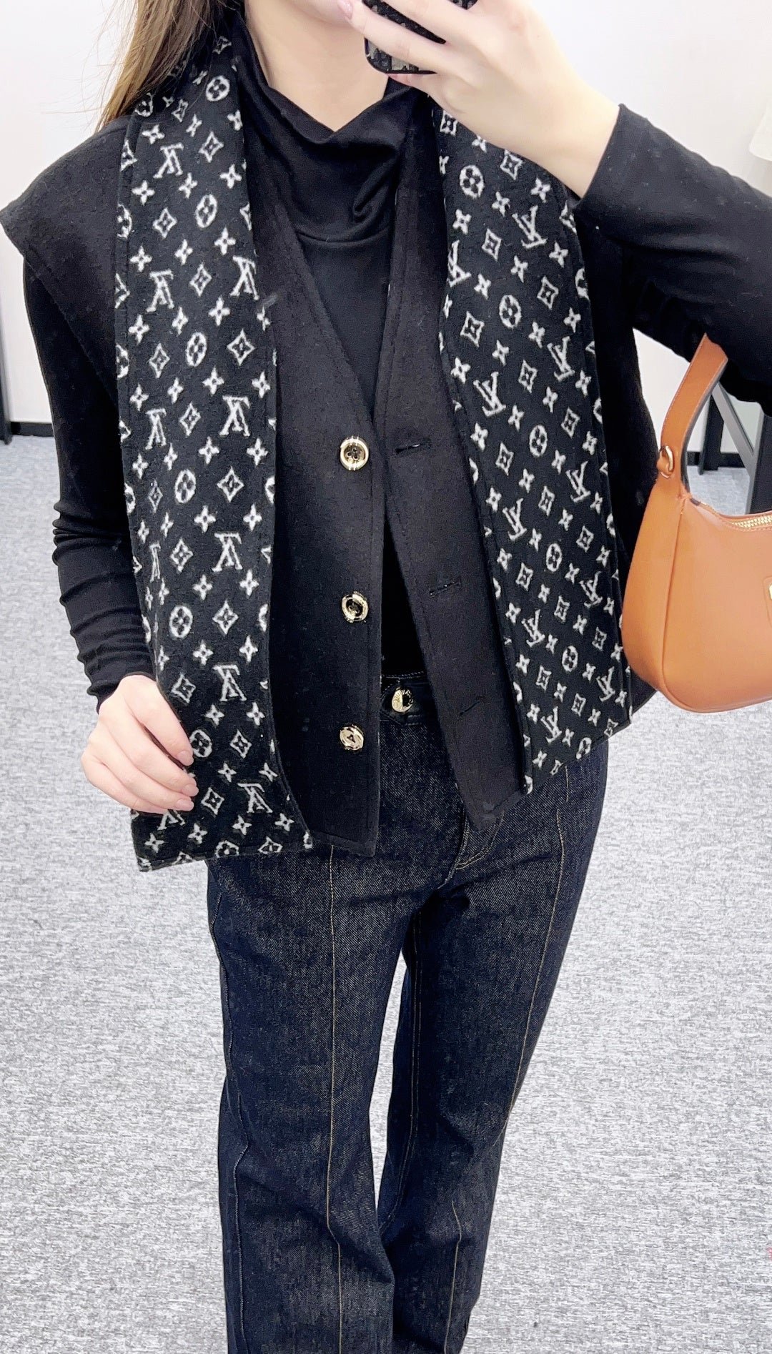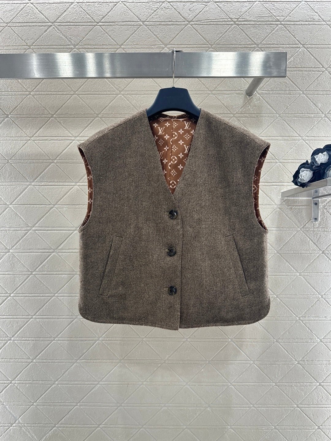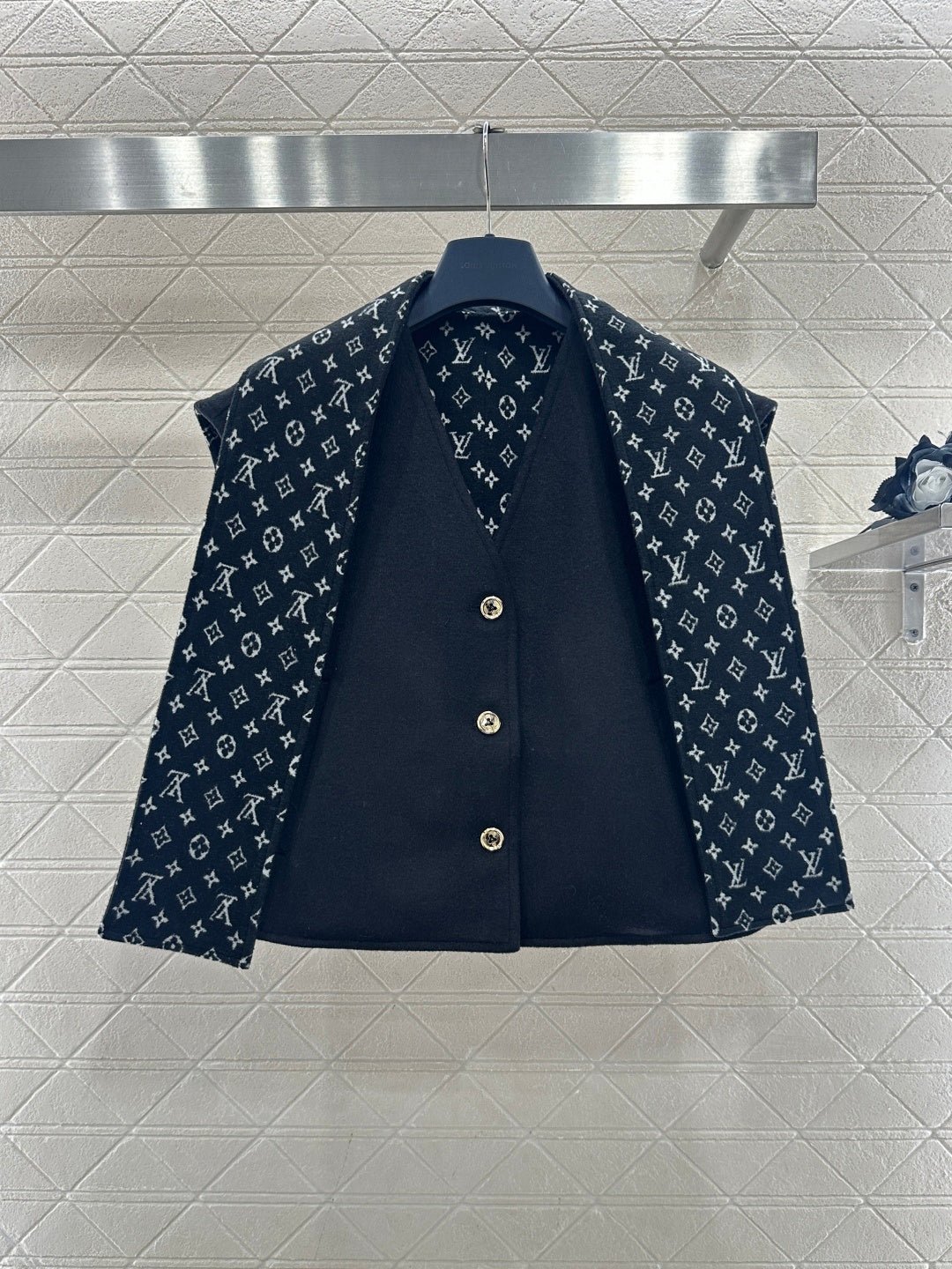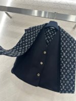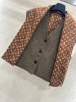 Made of wool with a printed finish, this stylish V-neck button-down vest features a subtly understated solid color outer layer, while the inner lining is covered with four-leaf clover elements and the brand’s logo, showcasing the brand’s understated luxury. The collar trim echoes the lining and is designed for two separate wear, making it a versatile piece for layering. The black and white monogram pattern contrasts beautifully with the solid color, exuding a cool and sophisticated feel, while metal buttons add a touch of refinement. This perfect fusion of monogram and modern aesthetics makes it a striking focal point in any outfit.