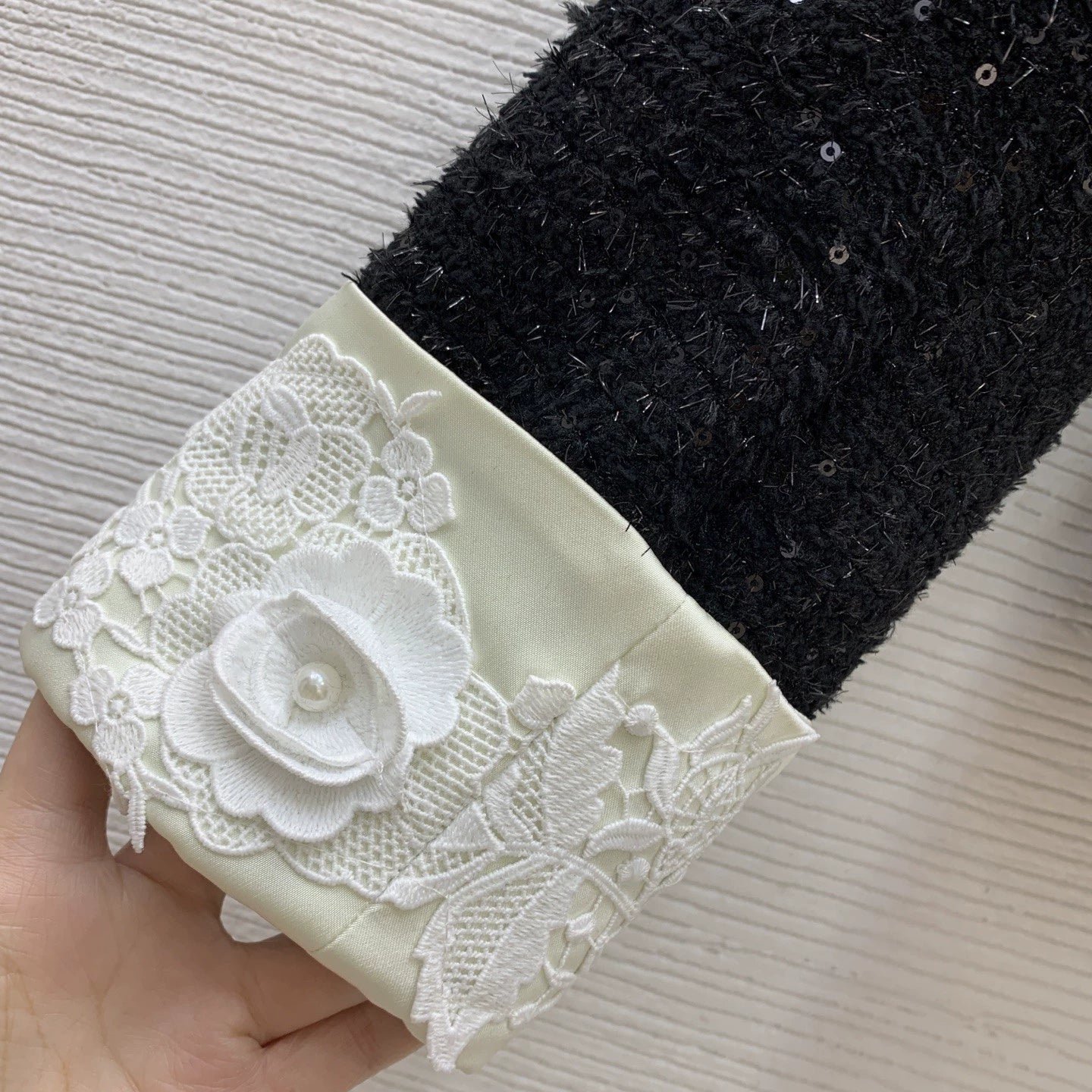 Short jacket with contrasting color-blocked lapel and 3D lace floral print + high-waisted midi pencil skirt