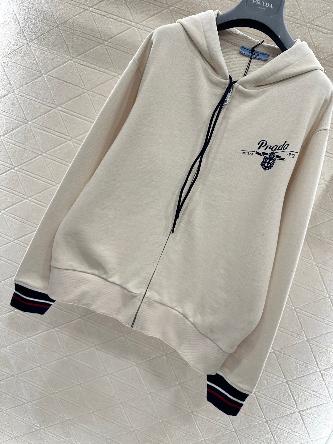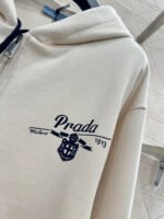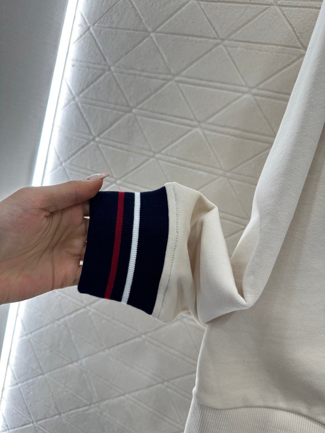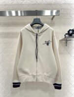 Made from 100% cotton, this comfortable and soft sweatshirt is stylish and features a hooded zip-up design. The sleeves are trimmed with dark black striped ribbed piping, subtly showcasing individuality. A single-sided print on the chest depicts the iconic shield and letter logo. The oversized silhouette creates a strong streetwear vibe with a relaxed, artistic feel. Comfortable and fashionable, it’s perfect for everyday wear or casual outings.