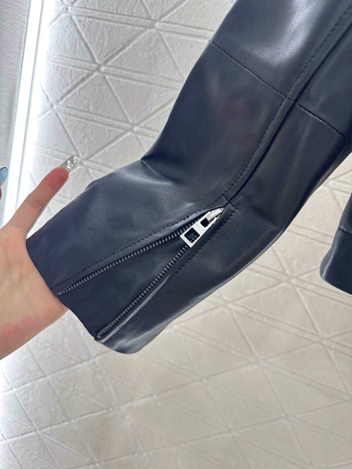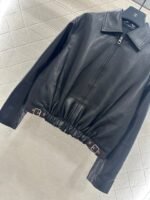 Made of 100% lambskin material, with delicate texture and clear texture, this jacket features a lapel and shoulder down design, a zippered open top, and an elastic band at the hem ➕ Perforated leather buckle edging, combining a cool texture with a casual atmosphere. The classic black color scheme elevates the cool motorcycle vibe, while the iconic totem decoration adorns the back collar, enhancing the texture of the details. It can be easily switched between different occasions, making it a must-have for sweet and cool girls.