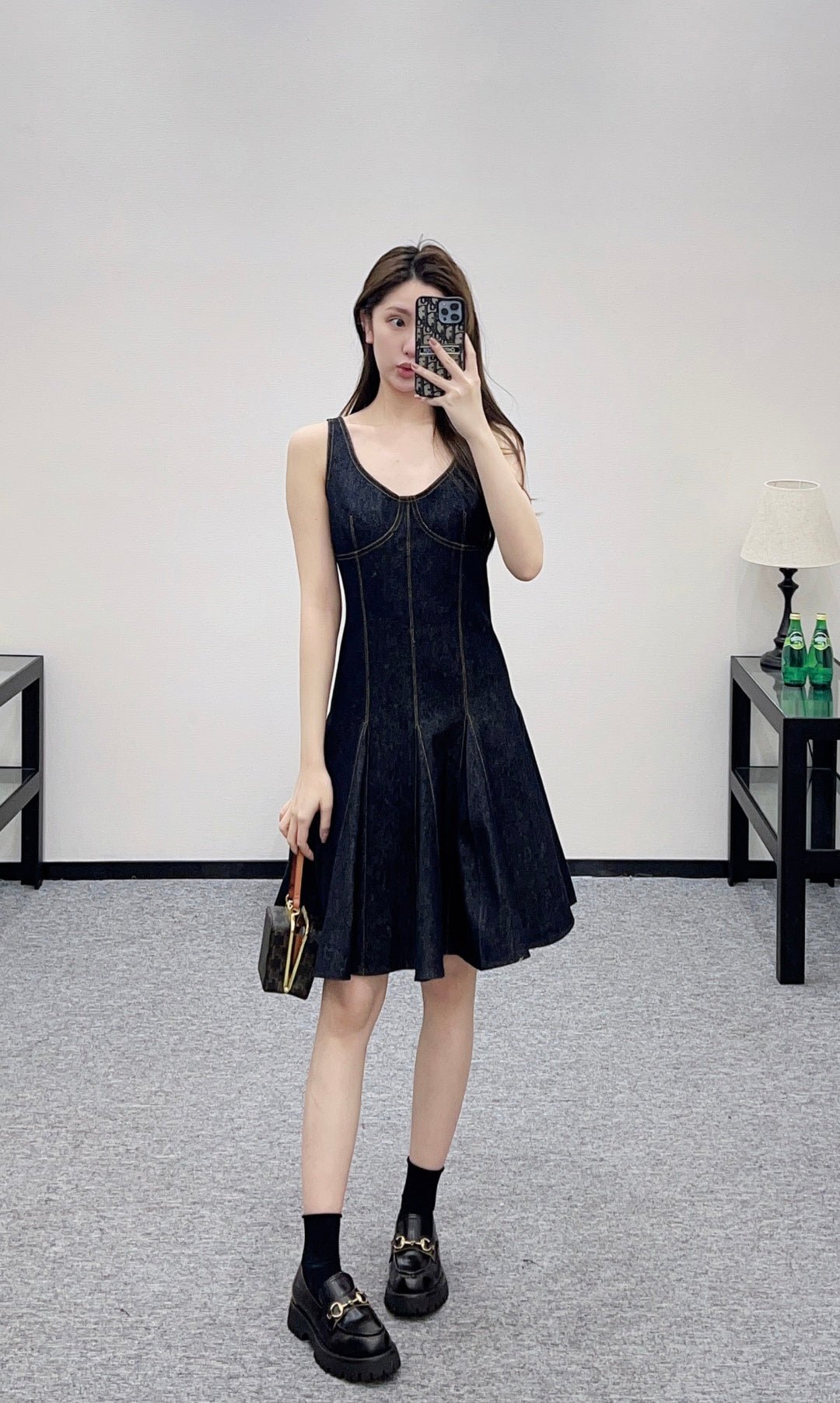 Made of twill cotton denim, this dress boasts a luxurious sheen and a comfortable feel against the skin. The bustier-style vest dress features a comfortable and adjustable zipper at the back, highlighting the bust and waistline for a perfect sweet and cool look. The fabric has a vintage feel, while clean stitching accentuates the figure. The cinched waist and slightly flared skirt cleverly accentuate the proportions, and the subtle detailing at the back adds a touch of sophistication and personality to this basic denim dress. Whether paired with sneakers for a casual look or heels for a more sophisticated style, this dress is sure to turn heads